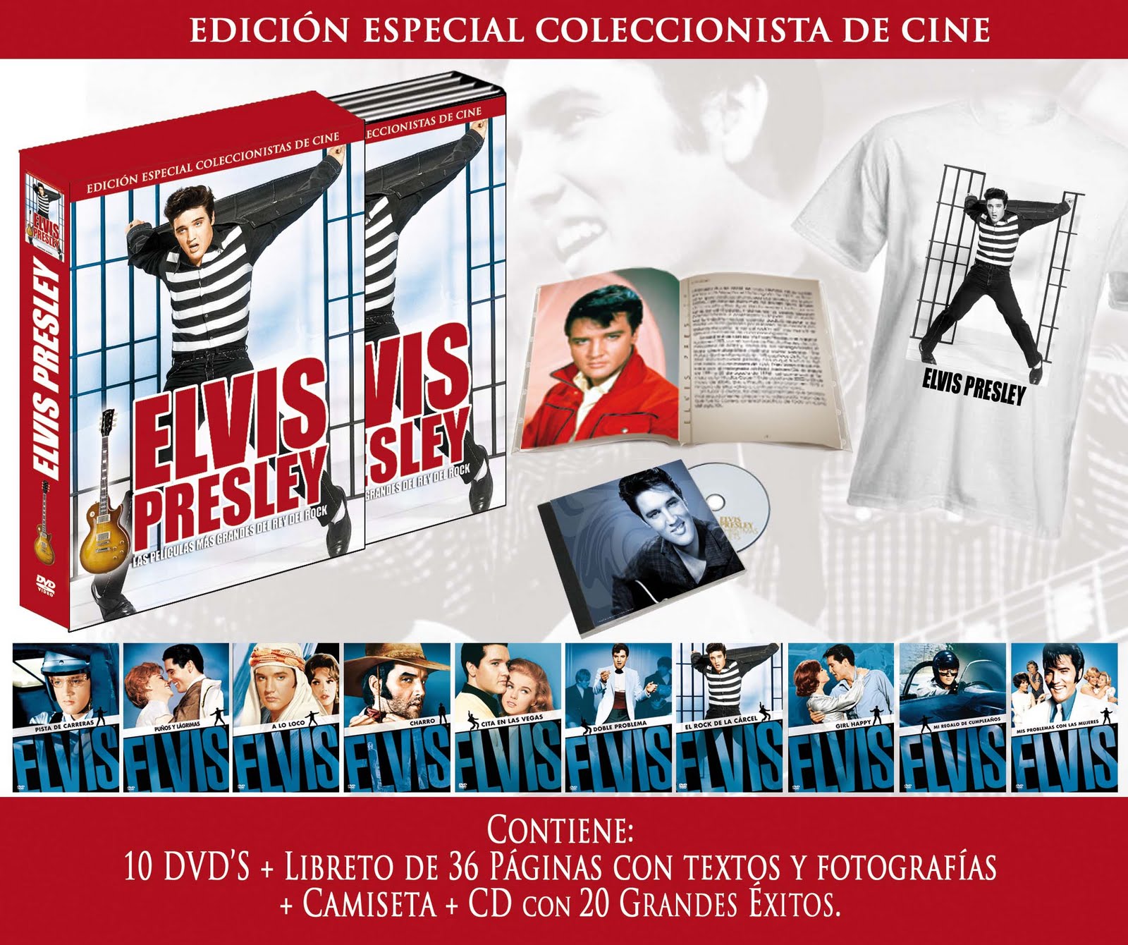 Diez discos con las películas más grandes de Elvis el Rey del Rock junto con un libreto de 36 páginas, una camiseta y un CD musical con 20 grandes éxitos del polifacético artista.