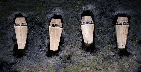 Pues bien, lo que han hecho con esta película no podía ser otra cosa que enterrar a cuatro asistentes que fueron seleccionados para ser sellados y enterrados en ataúdes durante la proyeción de la película, como podéis ver en las fotos. Los participantes, por llamarles de alguna forma, tenían los ojos vendados y con las cabezas tapadas según les trasladaban en silencio a una ubicación a 30 minutos de Austin. Tan sólo tras haber sido introducidos en sus respectivos ataúdes se les permitió quitarse las vendas. Una vez dentro, pudieron ver la película en las pantallas situadas en las tapas de los ataúdes.