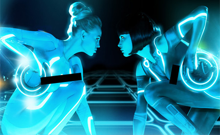Según parece, Playboy ha querido rendir homenaje a la cultura de Tron, de ahí que hiciera que las playmates Voronina y Sasckya participaran en una peculiar sesión de fotos futurista, todo ello aderezado por los colores y las luces de neón tan características de la película. En vez de ropa han realizado lo que se llama bodypainting inspirado en la película, es decir, han pintado sus cuerpos emulando la ropa peculiar que aparece en TRON, y las podemos ver subidas en las fantásticas motos de luz además de participando en las espectaculares luchas con discos.