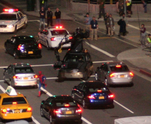Pues bien, ahora comprobamos que Columbia Pictures tenía rzón, y han comenzado a filtrarse las primeras fotos del rodaje de la película, con muy poca calidad y borrosas, en las que vemos a Spider-Man corriendo por Los Ángeles, a las puertas del Museo de Arte Contemporáneo, haciendo piruetas y saltando en un camión, con cuerda y todo: