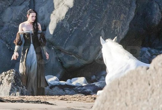 En las fotos filtradas del rodaje vimos a la protagonista de la saga Crepúsculo ataviada con su armadura completa y paseando a caballo junto con un gran número de miembros del reparto… y hoy ven la luz nuevas fotos de la actriz, donde la vemos con un vestido bastante sexy y, porqué no decirlo… «húmeda». Se la nota mucho más cómoda con esta indumentaria que con la pesada armadura: