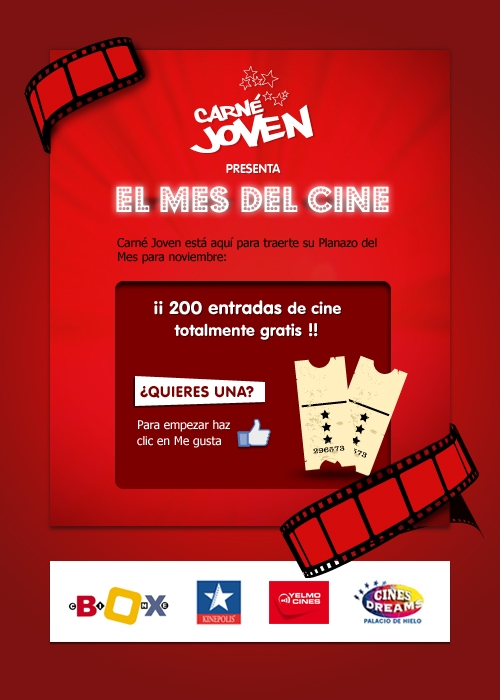 Pues bien, estos nos sirve para informaros que tienen actualmente en marcha, y durante el mes de noviembre, lo que han llamado el MES DEL CINE, donde además de recordar los descuentos de los que disfruta un socio de Carné Joven durante todo el año en CineBox, Kinépolis, Cine Dreams o Yelmo Cines, incentivan a través de este plan la presencia de los jóvenes en las taquillas de cine regalando 200 entradas a sus fans de