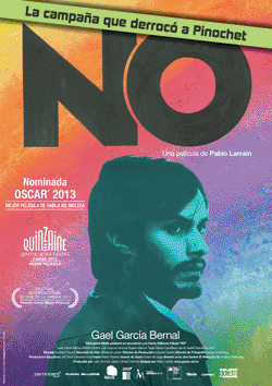 NO, cerrando el ciclo de esta etapa de la historia de Chile, habla de la agonía y del fin de la dictadura, y en ella el actor mexicano Gael García Bernal (Amores Perros, Y tu mamá también, Diarios de motocicleta) interpreta el papel de René Saavedra, un prestigioso publicista que cautivó a Chile con la campaña propagandística del NO, a base de simbolismos, melodías contagiosas («Chile, la alegría ya viene») y objetivos políticos derrocando al dictador Augusto Pinochet en el plebiscito de 1988.