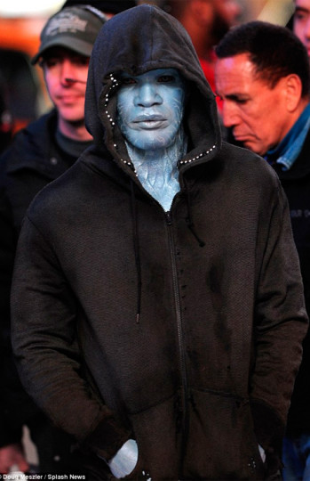 Hace unos días comentábamos que Marc Webb había revelado en su twitter una foto del rodaje de The Amazing Spider-Man 2 con la siguiente frase: «Esto es lo que sucede cuando se intenta poner una multa a Electro», que os recordamos es un villano de la película interpretado por Jamie Foxx. En esa foto no nos dejó ver el aspecto del personaje, pero ahora han visto la luz varias fotos de Jamie Foxx como Electro, donde apreciamos que el actor lleva un maquillaje azul y la ropa sucia como si viviera en la calle.