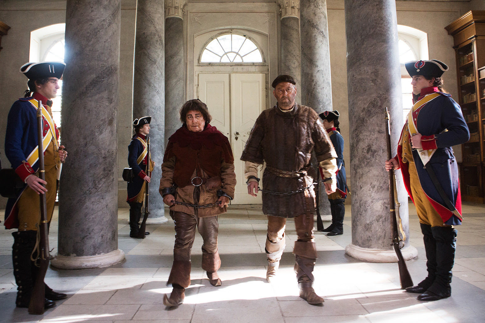 En Los visitantes la lían (en la Revolución Francesa), atascados en los corredores del tiempo, el conde Godofredo «el Audaz» y su cafre escudero Delcojón «el Bribón» llegan a la Revolución Francesa. A un momento en el que los descendientes de Delcojón (ahora apellidados «DelCojoné»), confiscan el castillo y todos los bienes de los descendientes del conde, aristócratas que huyen de «Madame La Guillotine».