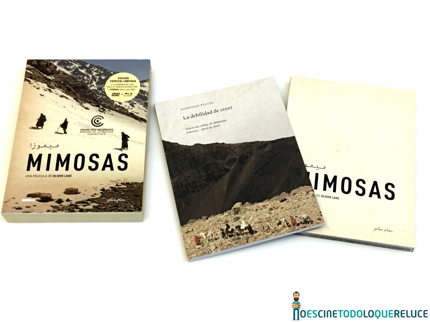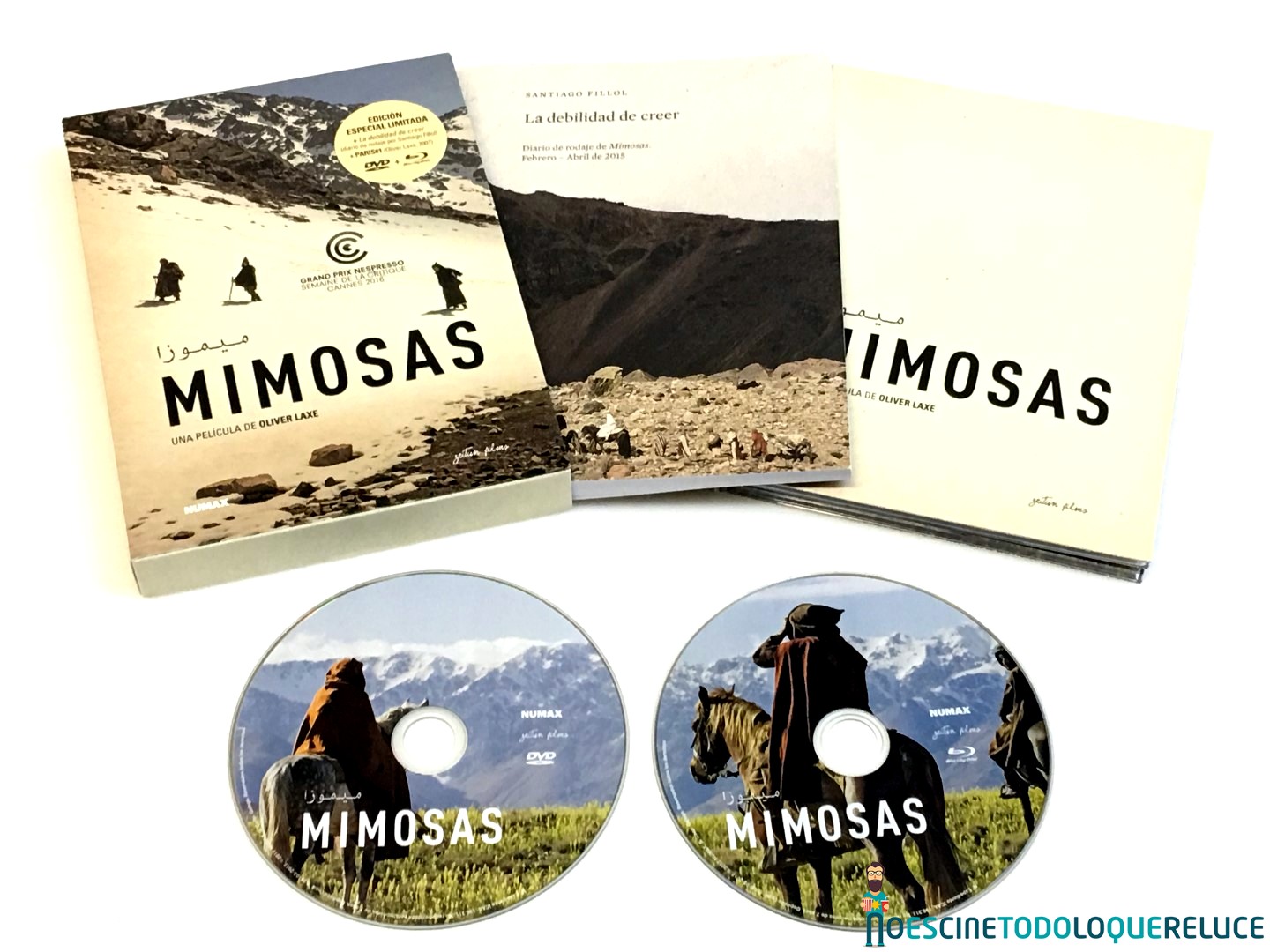 Cameo ha procurado que Mimosas tenga una edición a la altura de la película, y por ese motivo nos han sorprendido con una gran edición especial limitada que no sólo incluye los discos DVD y Blu-ray en un digipack de dos palas, a juego con los discos que se integran perfectamente en él, sino también un libro de 112 páginas, «La debilidad de creer», que es el diario de rodaje de la película escrito por Santiago Fillol, todo ello en una funda que alberga tanto al libro como al digipack.