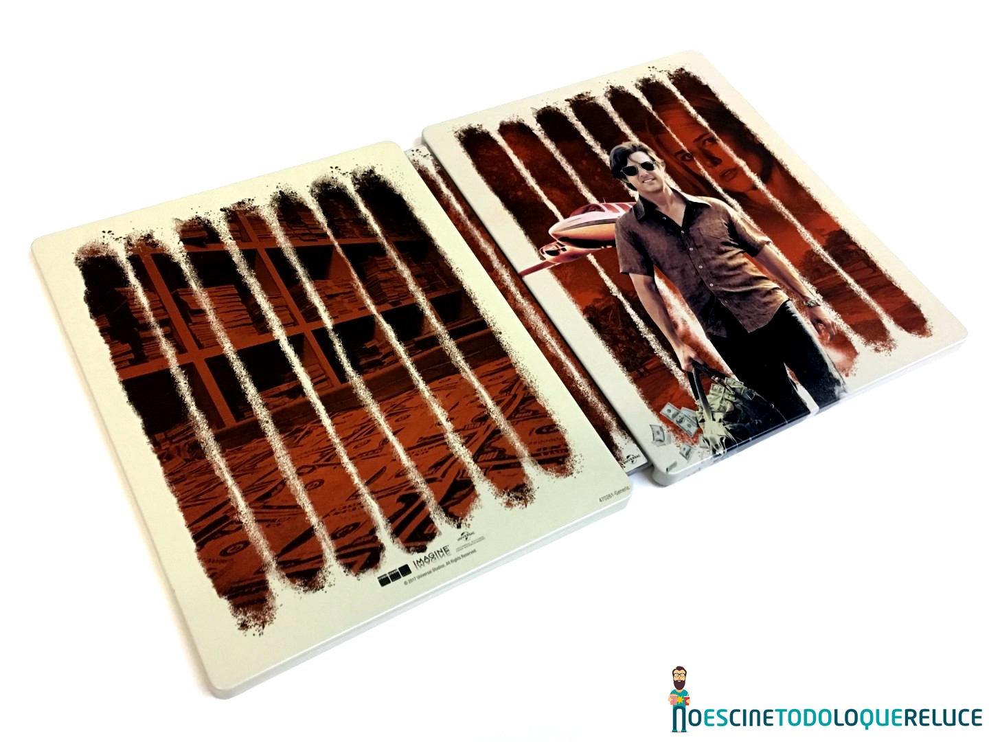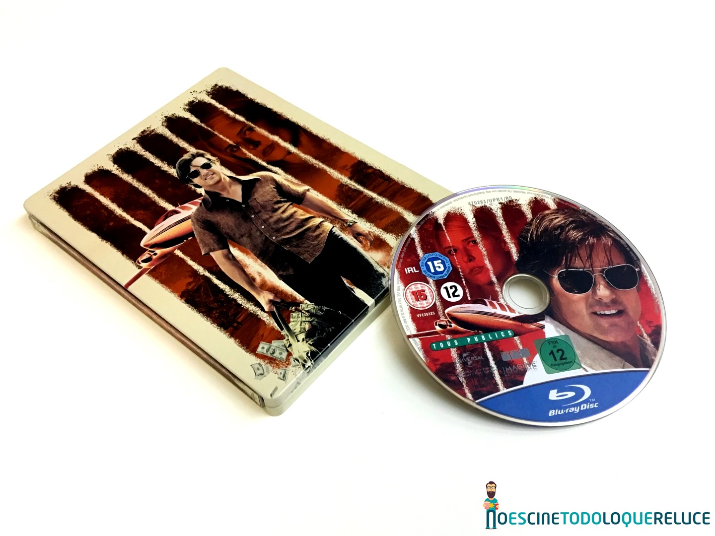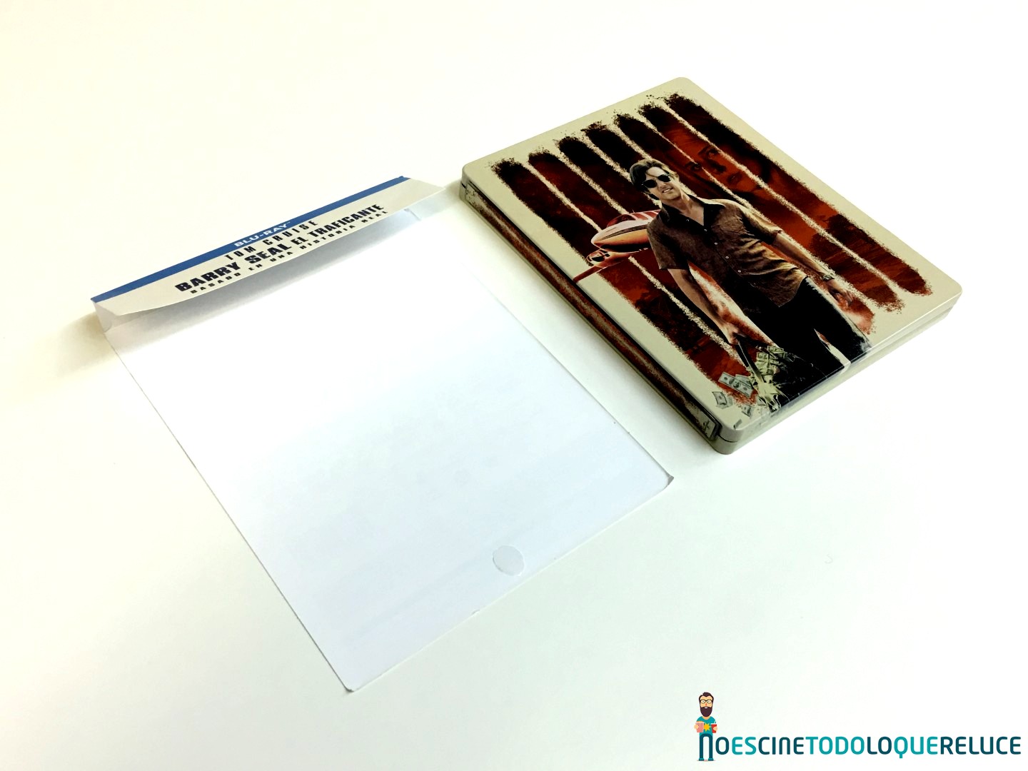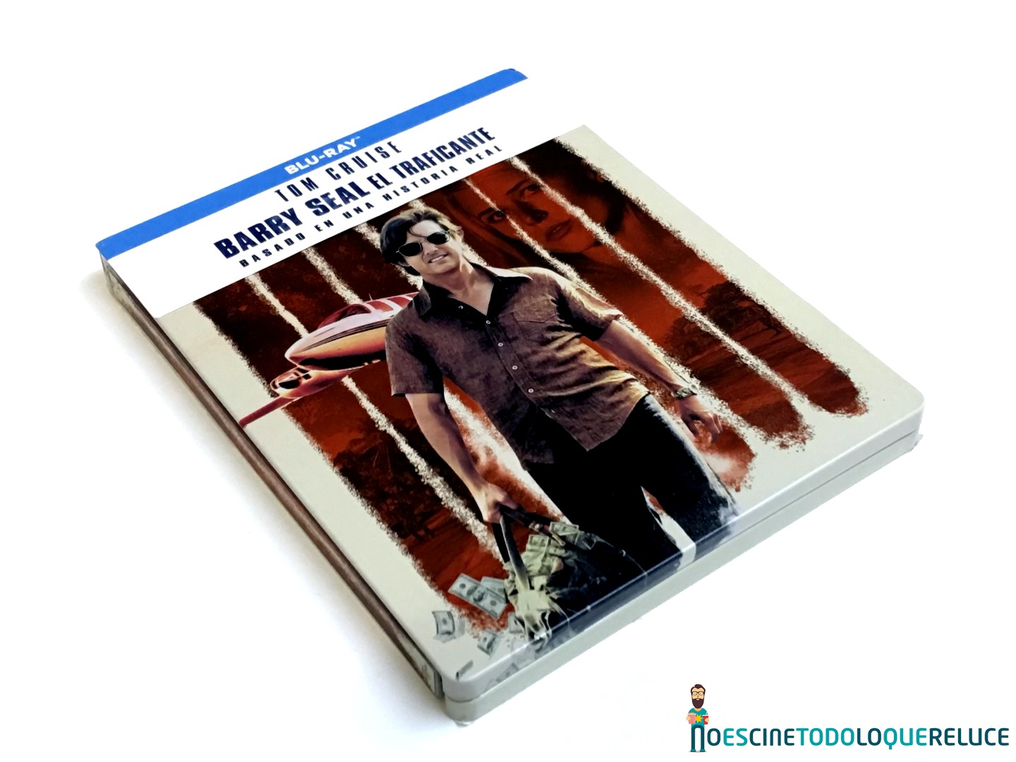 La edición metálica (Blu-ray) de Barry Seal: El traficante está presentada con un acabado mate con detalles barnizados, donde destaca la presencia de Tom Cruise en la portada, delante del relevante avión en el que realiza sus viajes de trabajo, con unas simbólicas rayas que dejan ver la ilustración de fondo, con el rostro de la esposa de Barry Seal. En la contraportada de nuevo tenemos esas rayas que nos dejan ver una ilustración del dinero que acumula el protagonista de la película. Ni en la portada ni en el lomo tenemos el título de la película, viniendo tan sólo en la hoja de características de esta edición que viene pegada al steelbook, y que se despega con facilidad, sin estropear ni el steelbook ni el papel. El interior del estuche metálico incluye otras imagen de la película, con tonos rojos a juego con el resto de la edición, y es donde alberga el disco Blu-ray.
