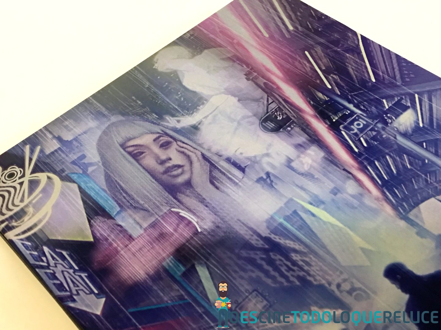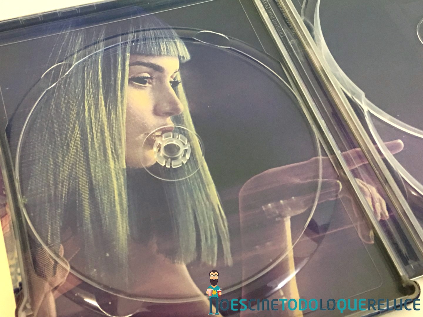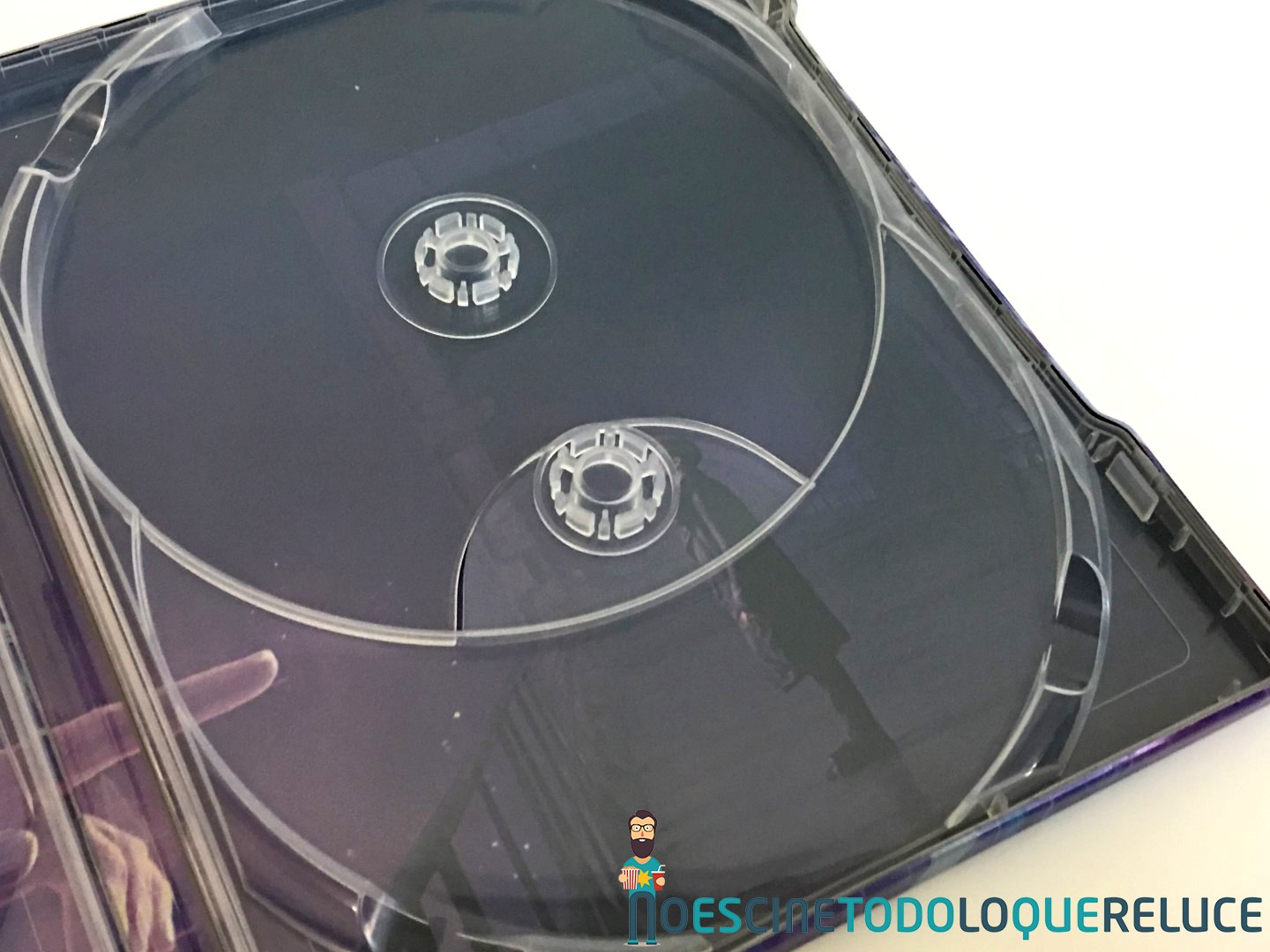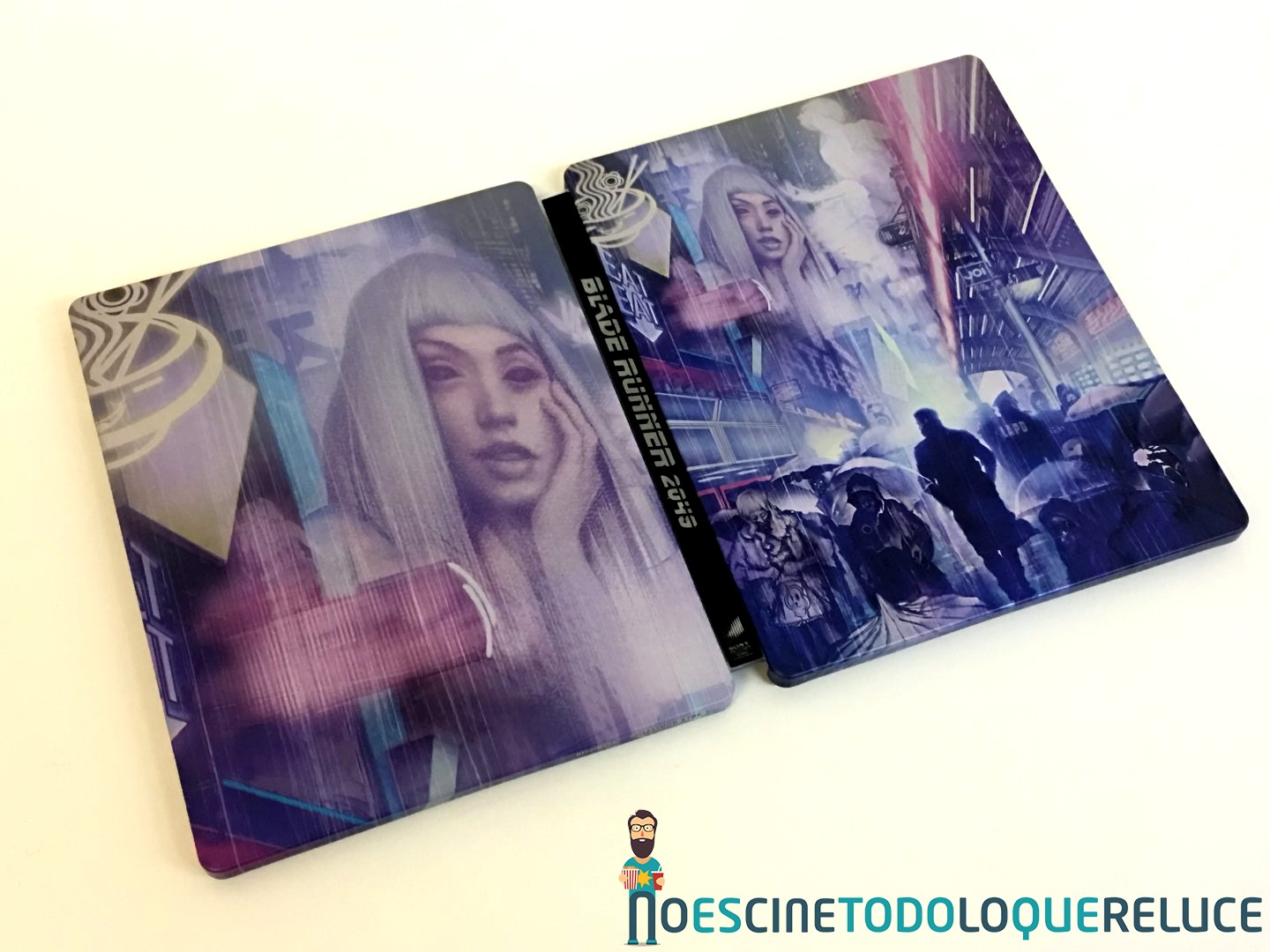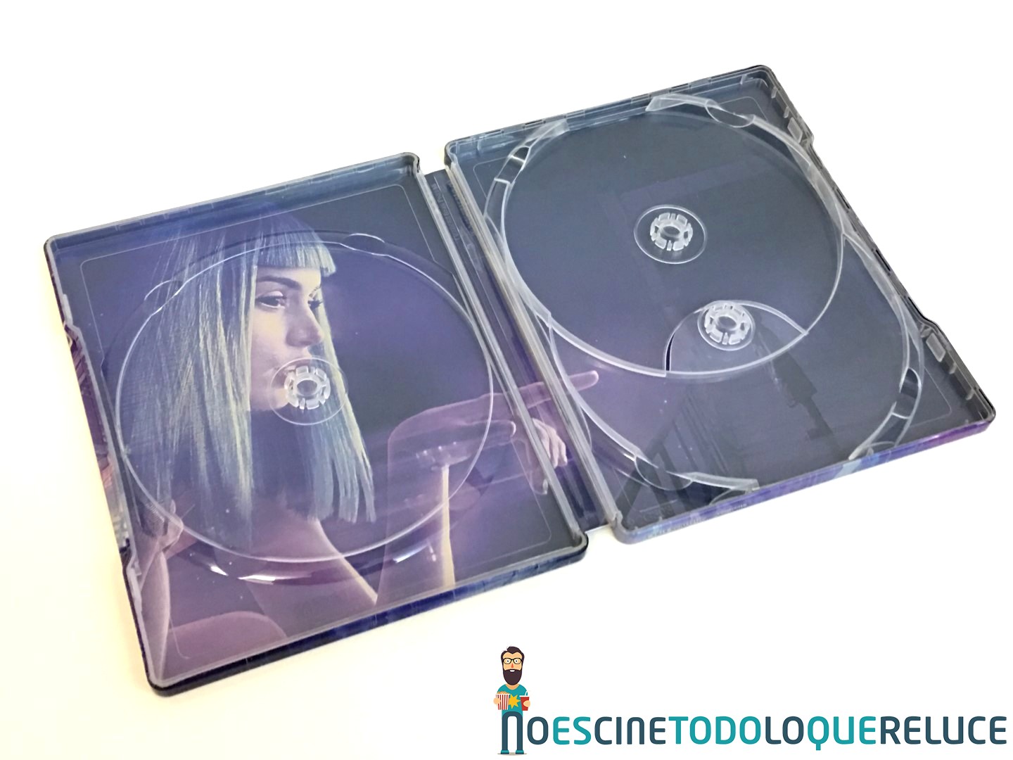 La edición Steelbook (4K UHD + Blu-ray) de Blade Runner 2049 está presentada con un acabado metalizado con la contraportada limpia, título en el lomo e interior ilustrado, donde se albergan los 3 discos (4K UHD+BD+BD de extras). Sorprende que la contraportada no sea una ilustración distinta de la portada, sino una parte ampliada de la misma, pero al jugar con los mismos tonos queda muy elegante, y vale la pena este Steelbook por la bella ilustración frontal. En relación a la ilustración interior es muy emblemática, pues es una de las escenas más vistas durante la promoción de la película, con el holograma del personaje de Ana de Armas acercándose al agente K. En relación a los discos, los tres vienen serigrafiados con la imagen de tres escenas de la película.