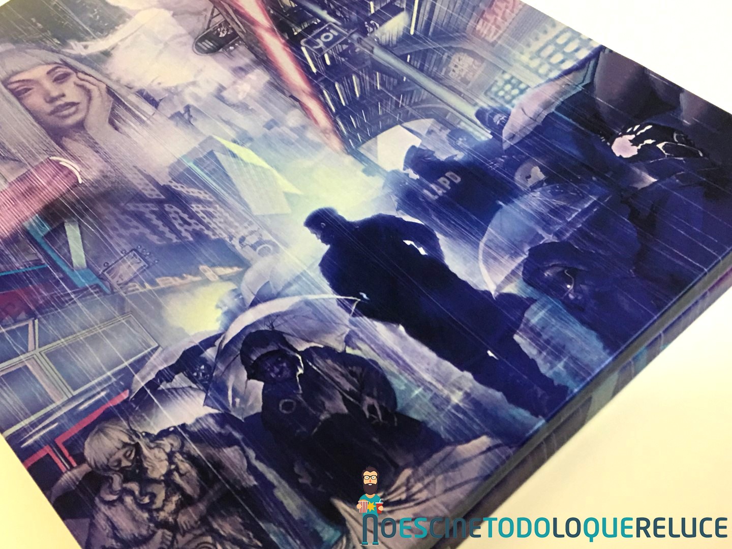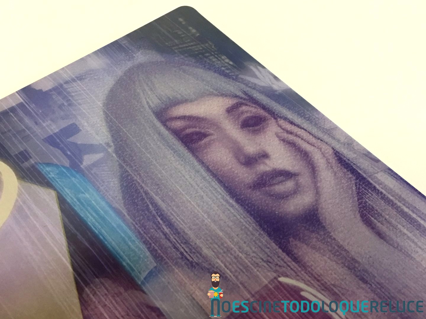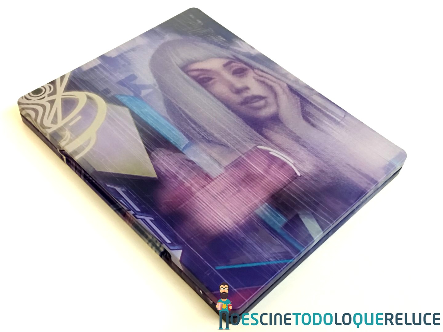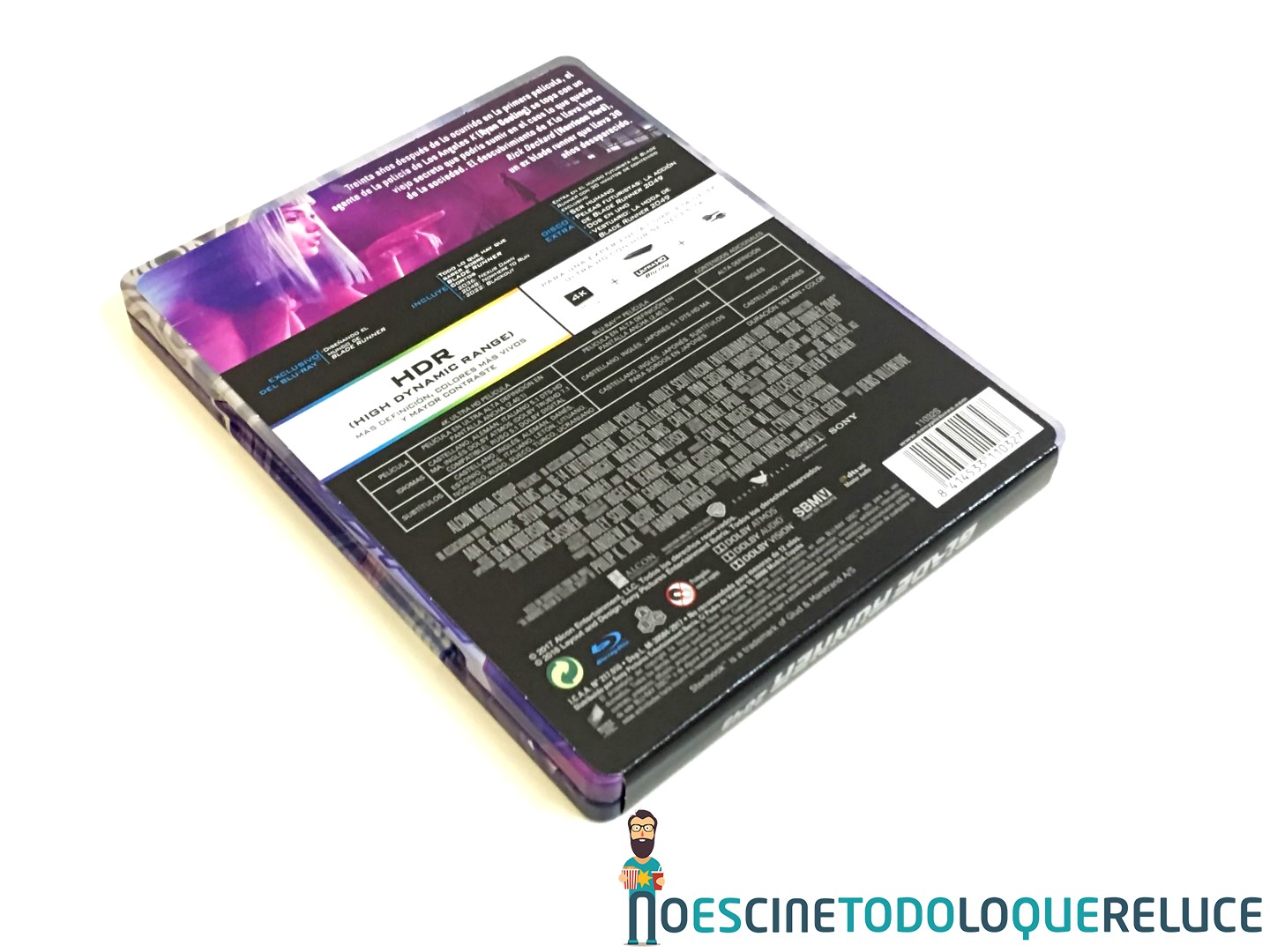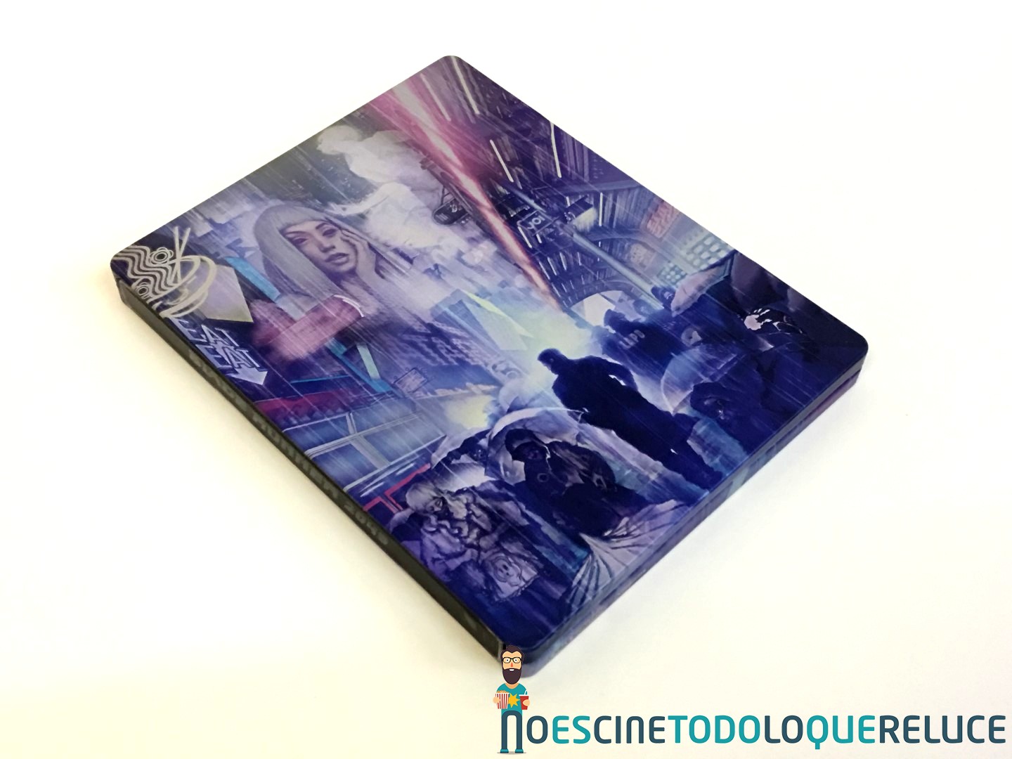 La edición Steelbook (4K UHD + Blu-ray) de Blade Runner 2049 está presentada con un acabado metalizado con la contraportada limpia, título en el lomo e interior ilustrado, donde se albergan los 3 discos (4K UHD+BD+BD de extras). Sorprende que la contraportada no sea una ilustración distinta de la portada, sino una parte ampliada de la misma, pero al jugar con los mismos tonos queda muy elegante, y vale la pena este Steelbook por la bella ilustración frontal. En relación a la ilustración interior es muy emblemática, pues es una de las escenas más vistas durante la promoción de la película, con el holograma del personaje de Ana de Armas acercándose al agente K. En relación a los discos, los tres vienen serigrafiados con la imagen de tres escenas de la película.
