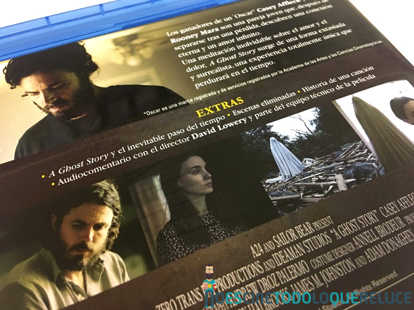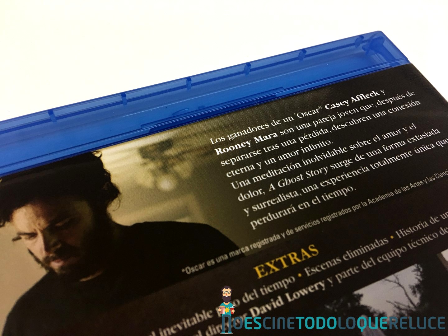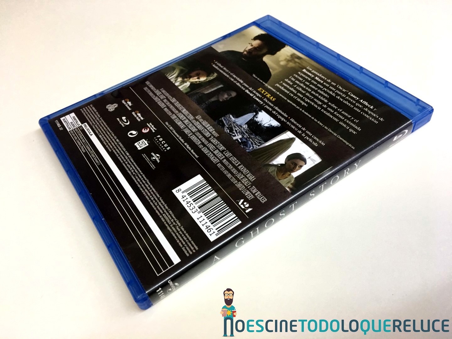 La edición Blu-ray de A Ghost Story está presentada en el clásico estuche amaray azul, que es donde alberga el disco Blu-ray, el cual tiene serigrafiada parte de la ilustración de la portada, sin el título en el mismo.