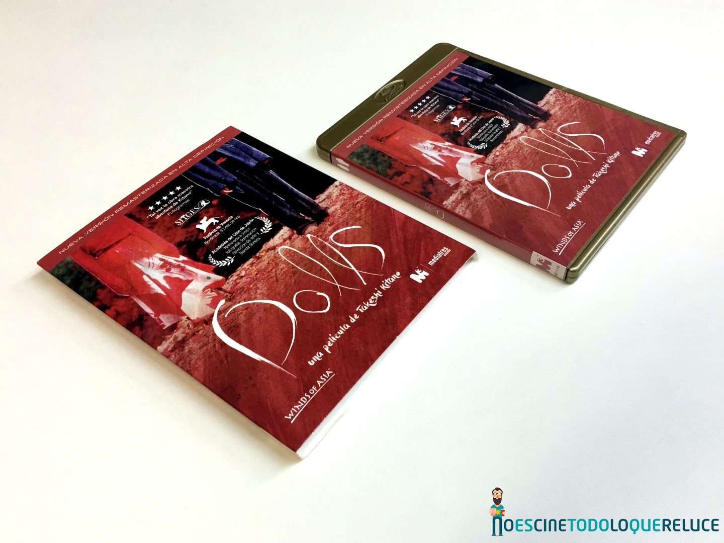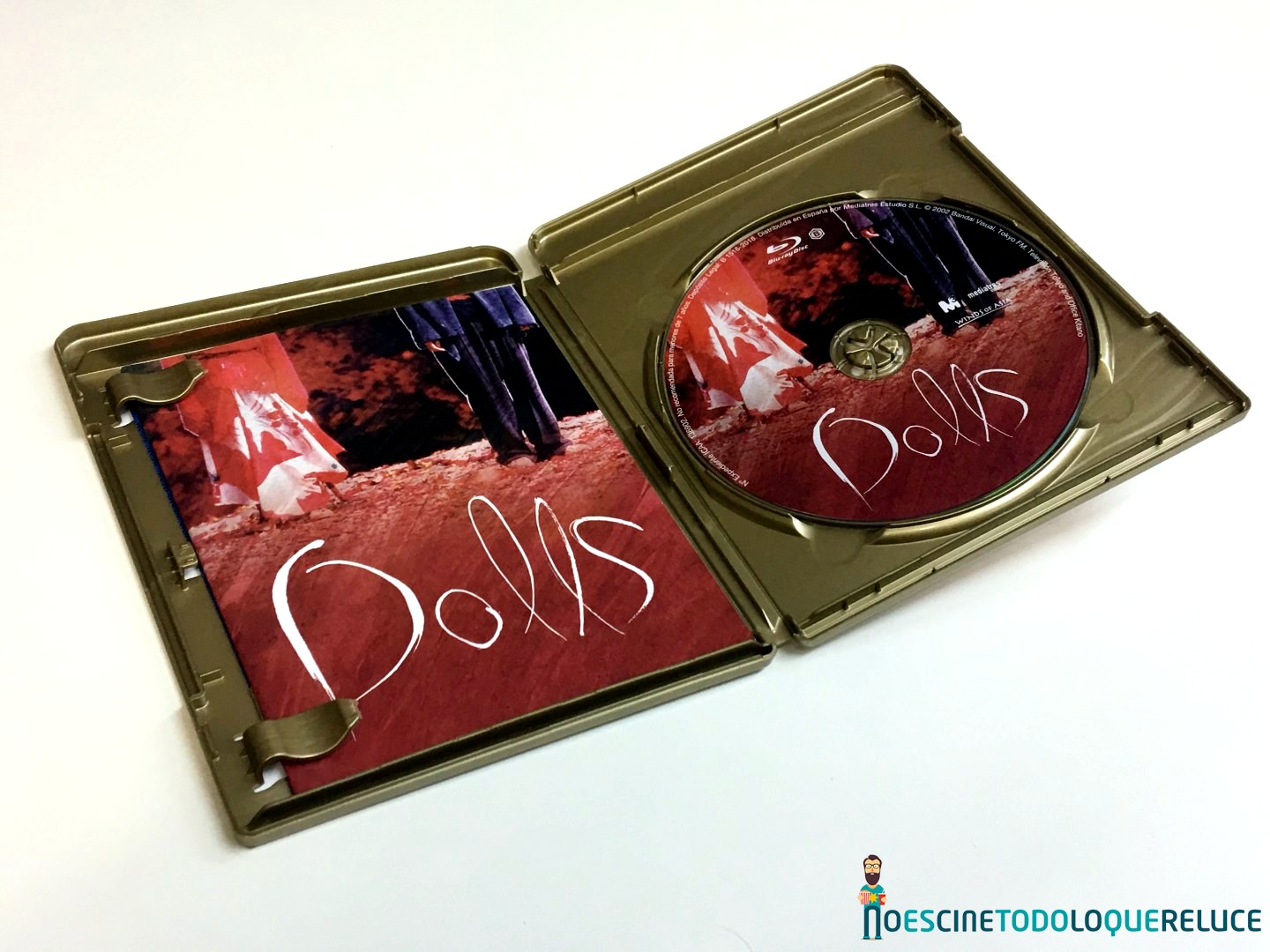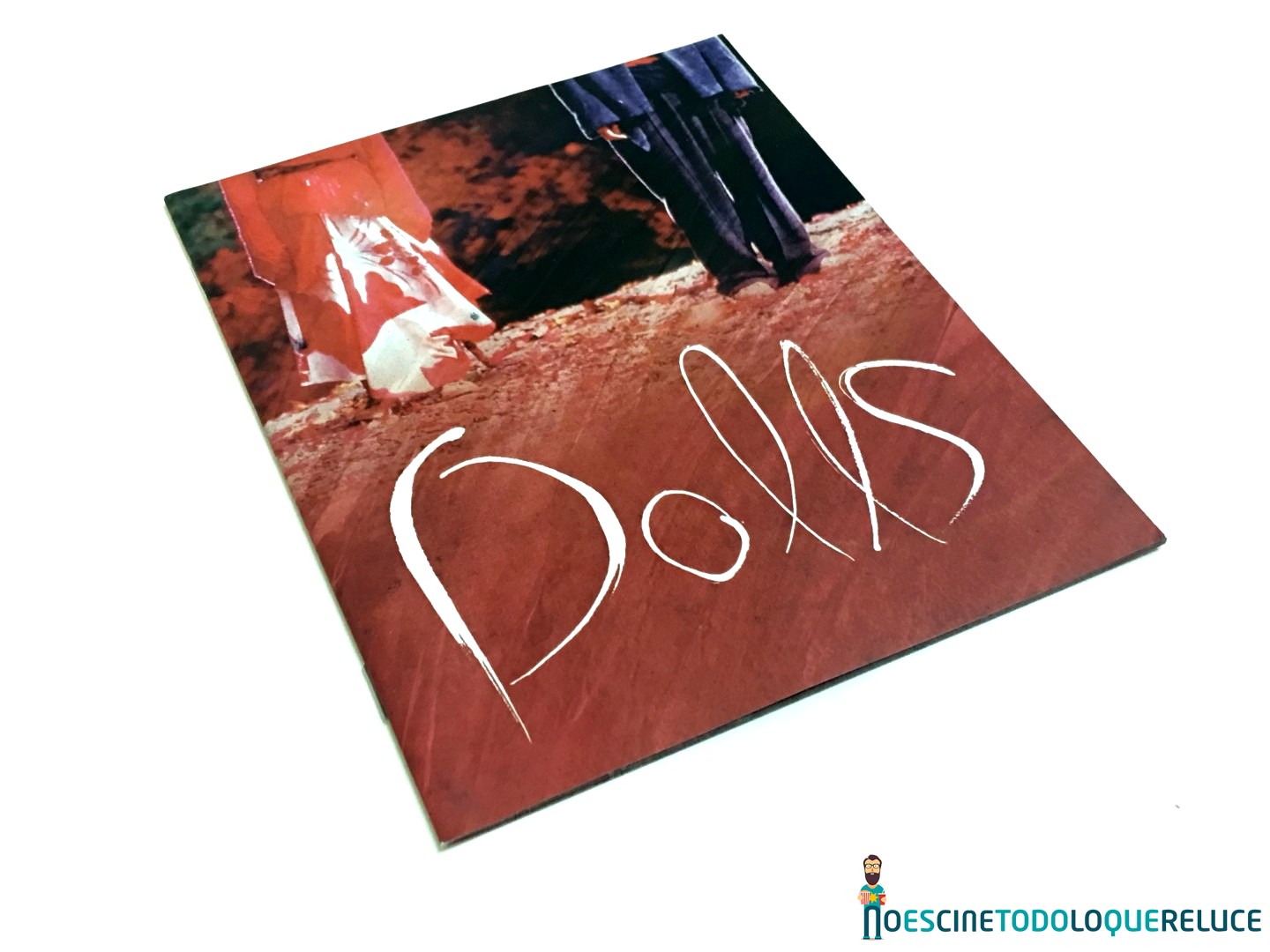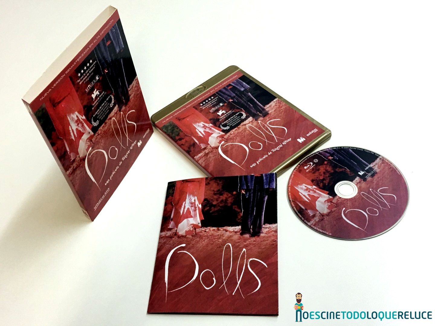 La edición Blu-ray de Dolls viene presentada en un estuche color dorado opaco cubierto por una funda o-card, y en el interior del estuche encontramos un libreto de 32 páginas con análisis e información sobre la película escrito por CineAsia Online, excepto la entrevista al director, tal y como podéis ver en la galería inferior. Tanto la serigrafía del disco, como el libreto, incluyen el título de la película y van a juego con la portada de la edición.