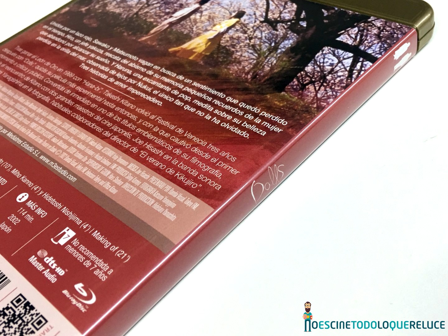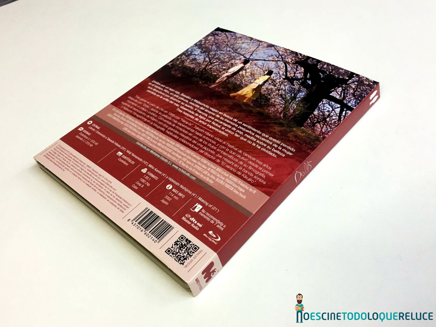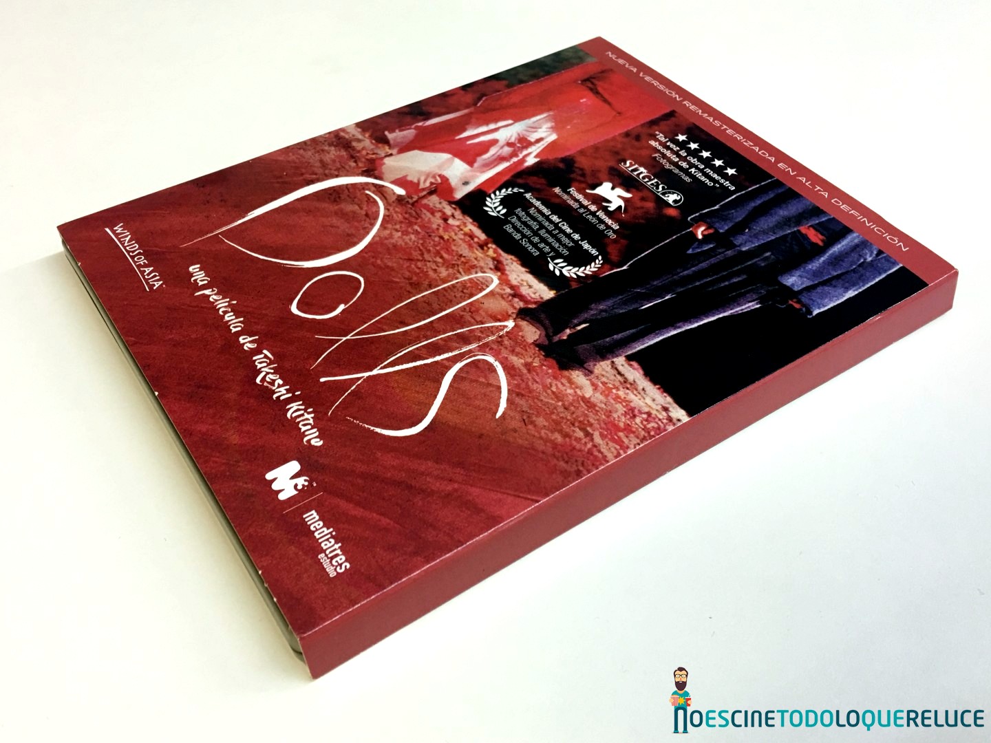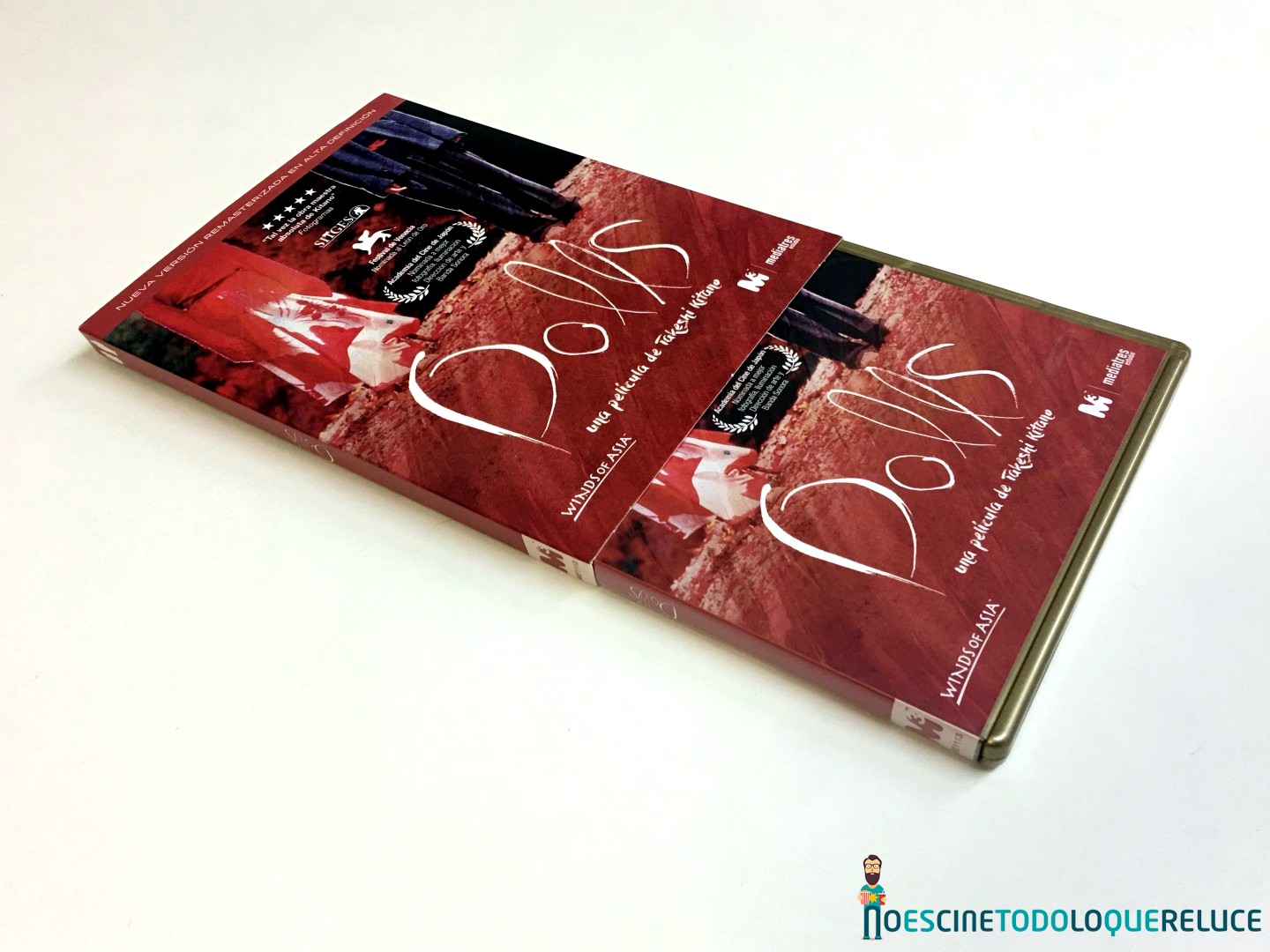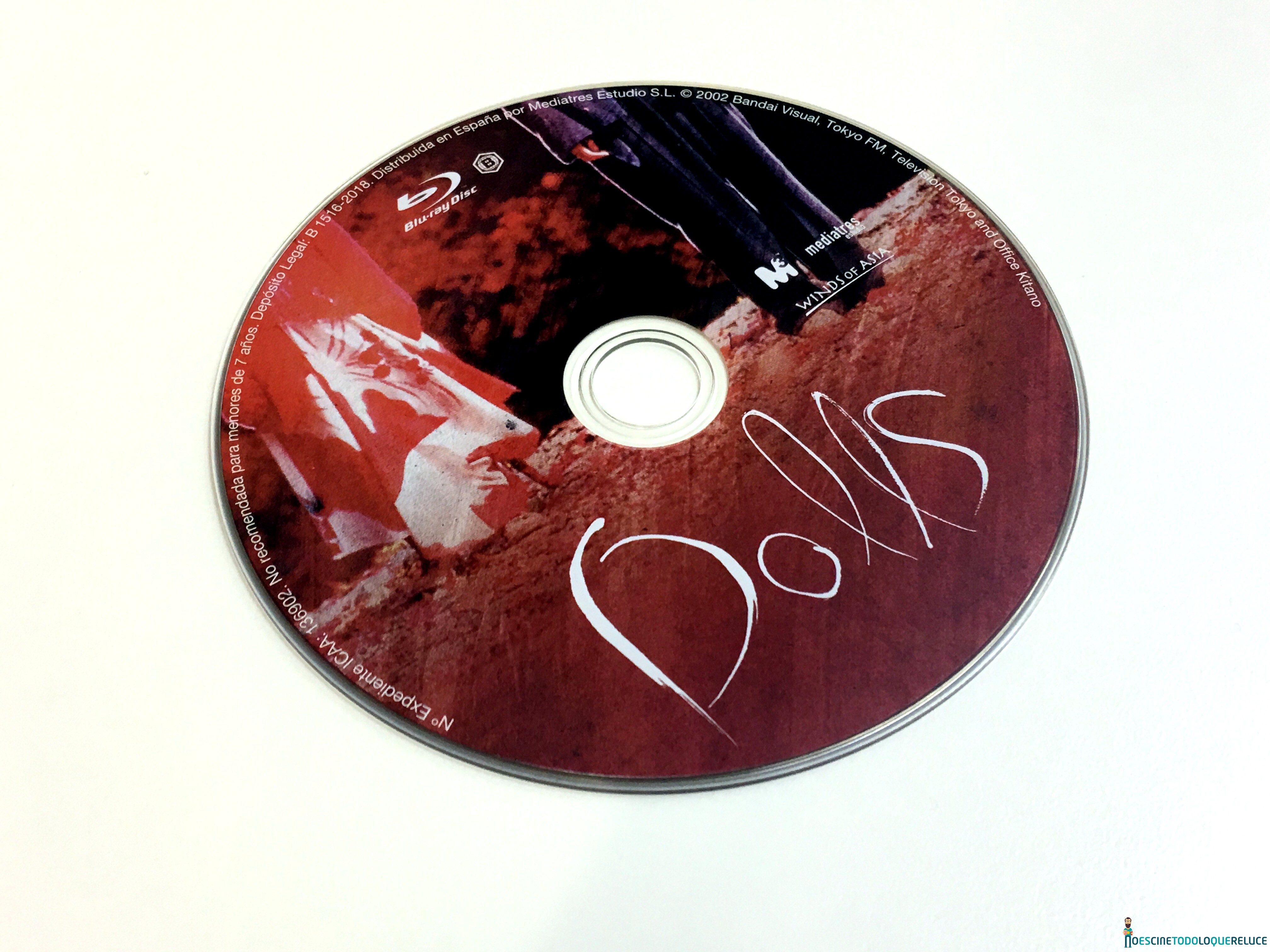 La edición Blu-ray de Dolls viene presentada en un estuche color dorado opaco cubierto por una funda o-card, y en el interior del estuche encontramos un libreto de 32 páginas con análisis e información sobre la película escrito por CineAsia Online, excepto la entrevista al director, tal y como podéis ver en la galería inferior. Tanto la serigrafía del disco, como el libreto, incluyen el título de la película y van a juego con la portada de la edición.