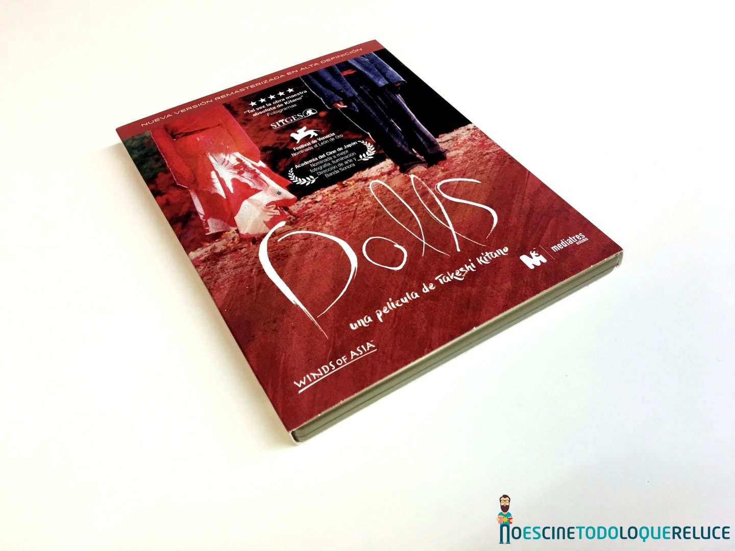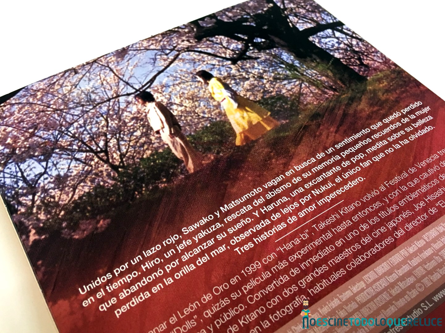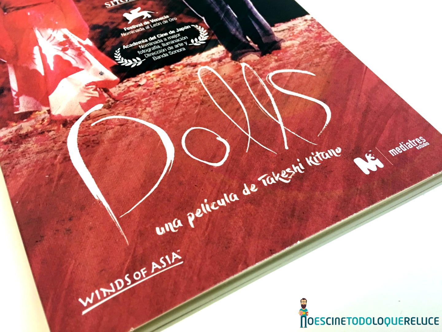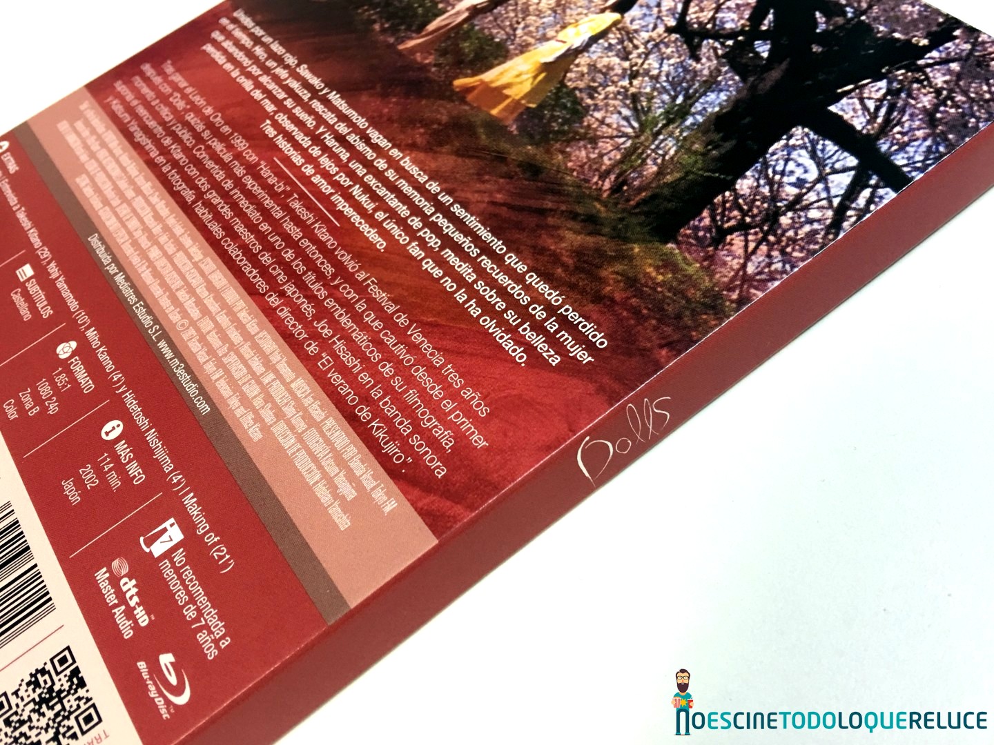 La edición Blu-ray de Dolls viene presentada en un estuche color dorado opaco cubierto por una funda o-card, y en el interior del estuche encontramos un libreto de 32 páginas con análisis e información sobre la película escrito por CineAsia Online, excepto la entrevista al director, tal y como podéis ver en la galería inferior. Tanto la serigrafía del disco, como el libreto, incluyen el título de la película y van a juego con la portada de la edición.