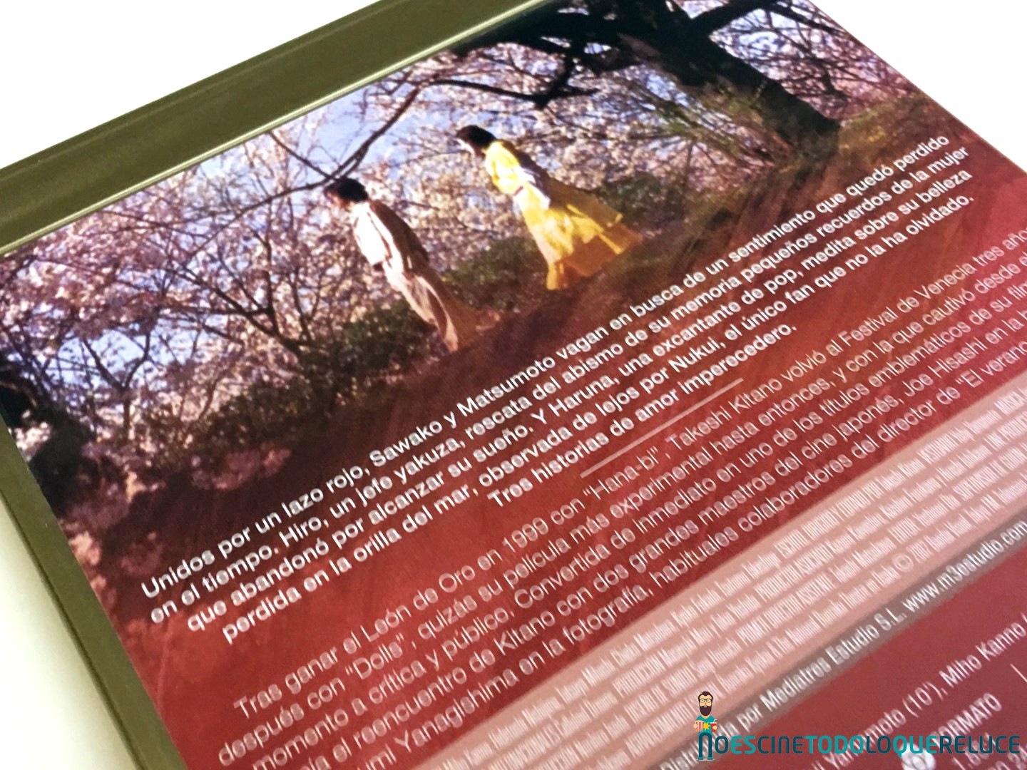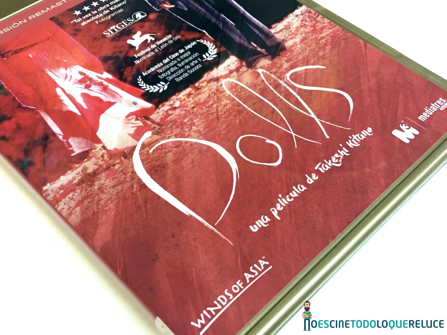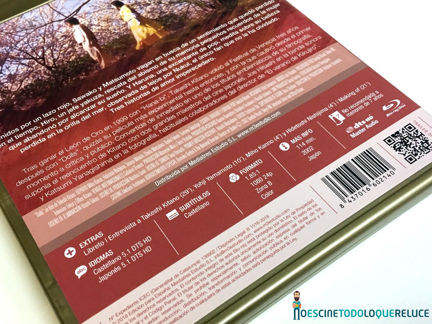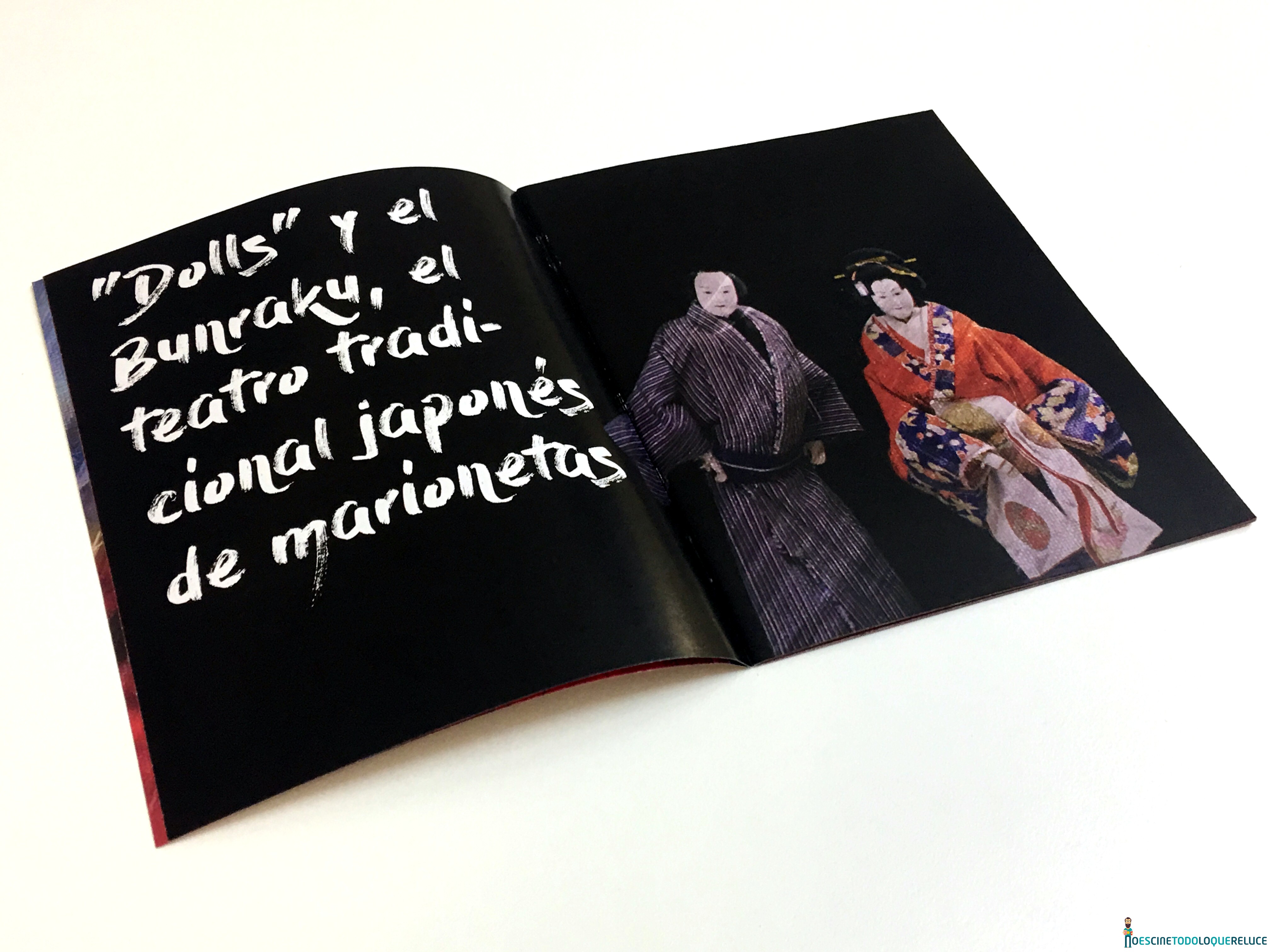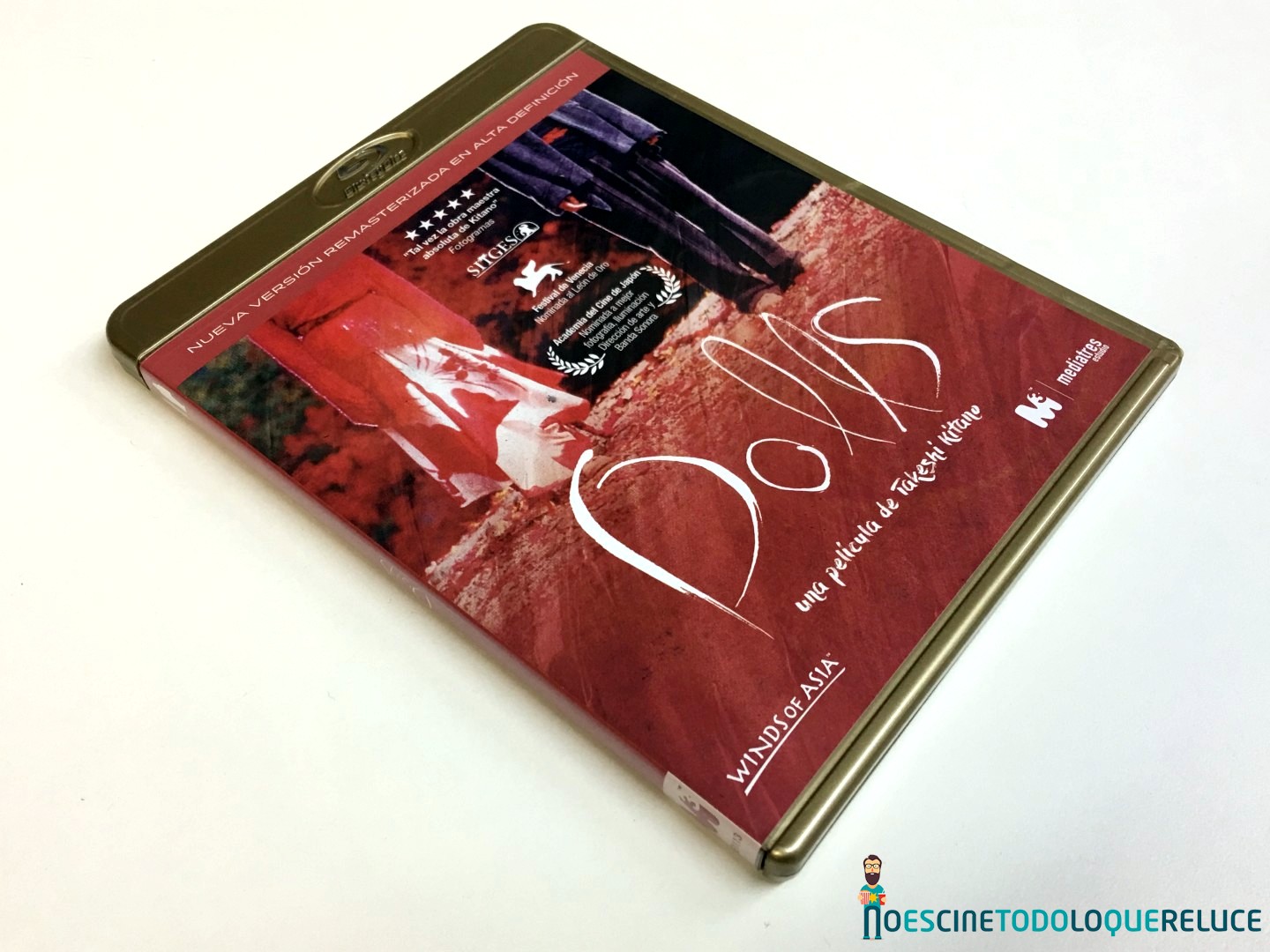 La edición Blu-ray de Dolls viene presentada en un estuche color dorado opaco cubierto por una funda o-card, y en el interior del estuche encontramos un libreto de 32 páginas con análisis e información sobre la película escrito por CineAsia Online, excepto la entrevista al director, tal y como podéis ver en la galería inferior. Tanto la serigrafía del disco, como el libreto, incluyen el título de la película y van a juego con la portada de la edición.