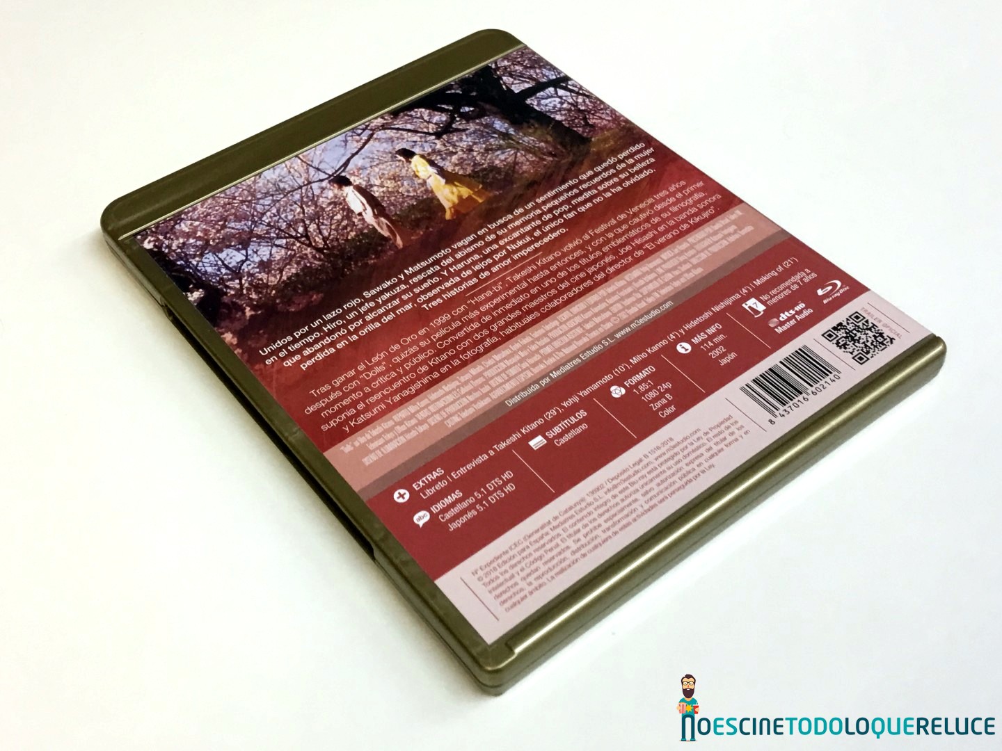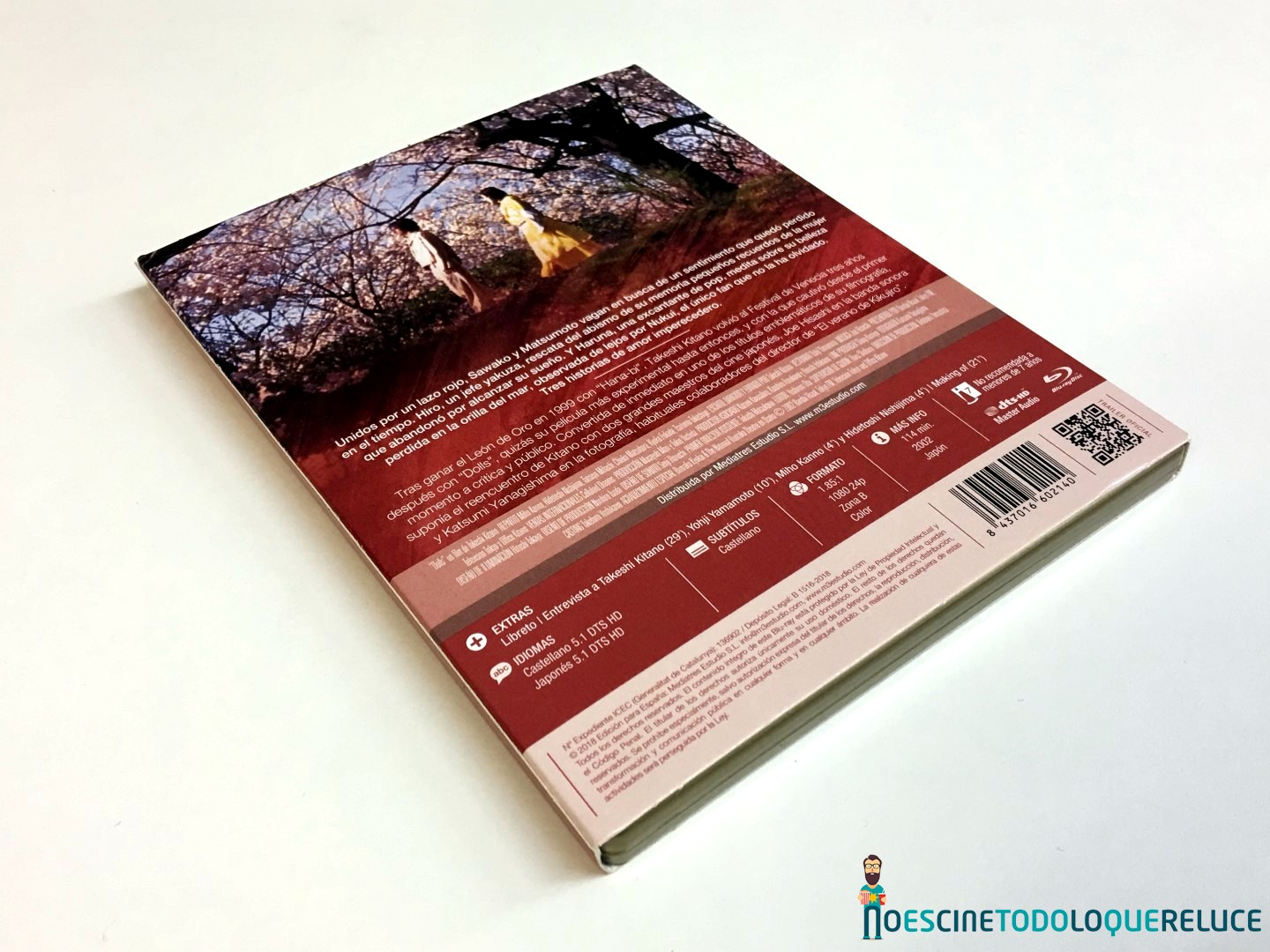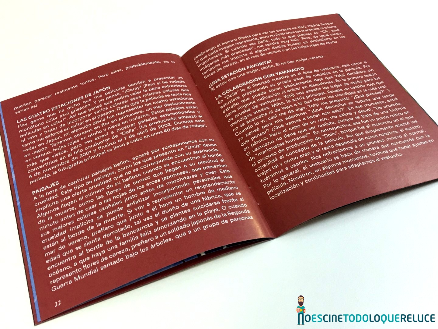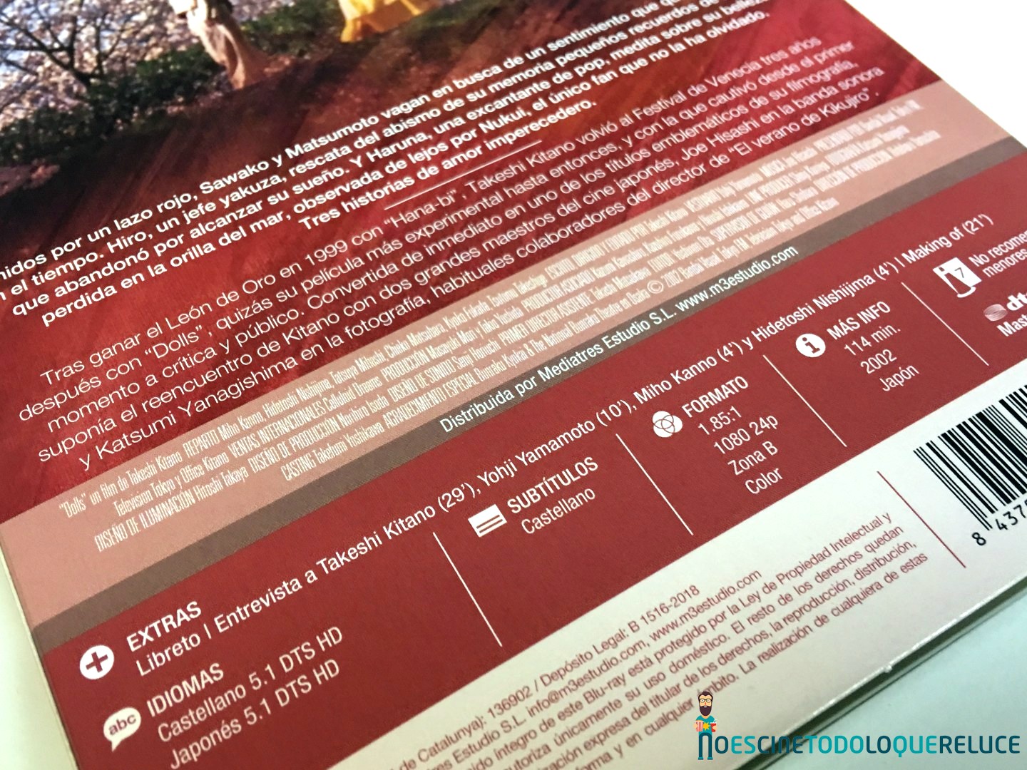La edición Blu-ray de Dolls viene presentada en un estuche color dorado opaco cubierto por una funda o-card, y en el interior del estuche encontramos un libreto de 32 páginas con análisis e información sobre la película escrito por CineAsia Online, excepto la entrevista al director, tal y como podéis ver en la galería inferior. Tanto la serigrafía del disco, como el libreto, incluyen el título de la película y van a juego con la portada de la edición.