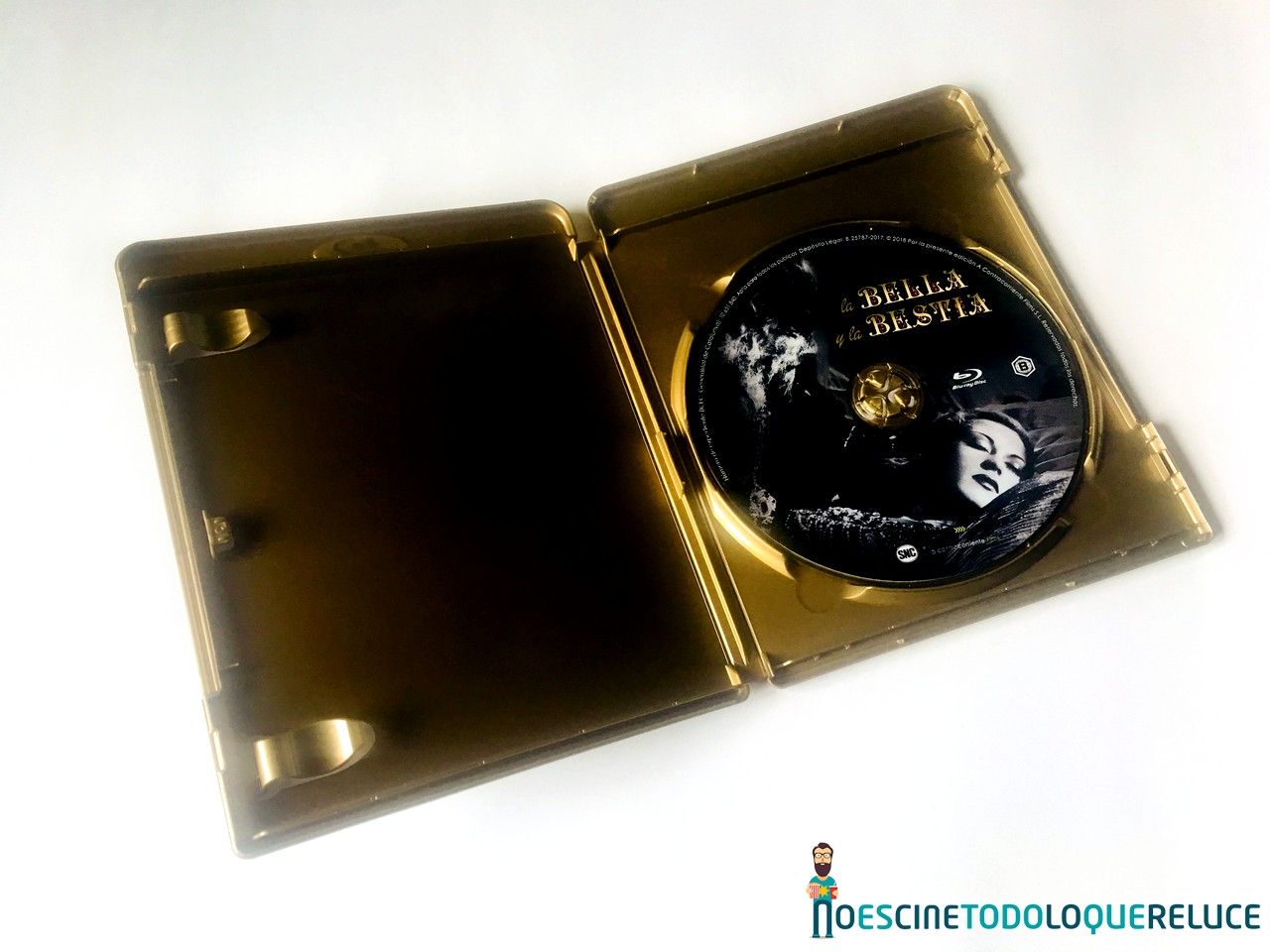 La película de La bella y la bestia está presentada en un estuche amaray dorado dentro de una elegante funda slipcover con una bella ilustración con colores oscuros y dorados, replica del póster original de la película, mientras que el disco Blu-ray nos muestra un fotograma de la película.