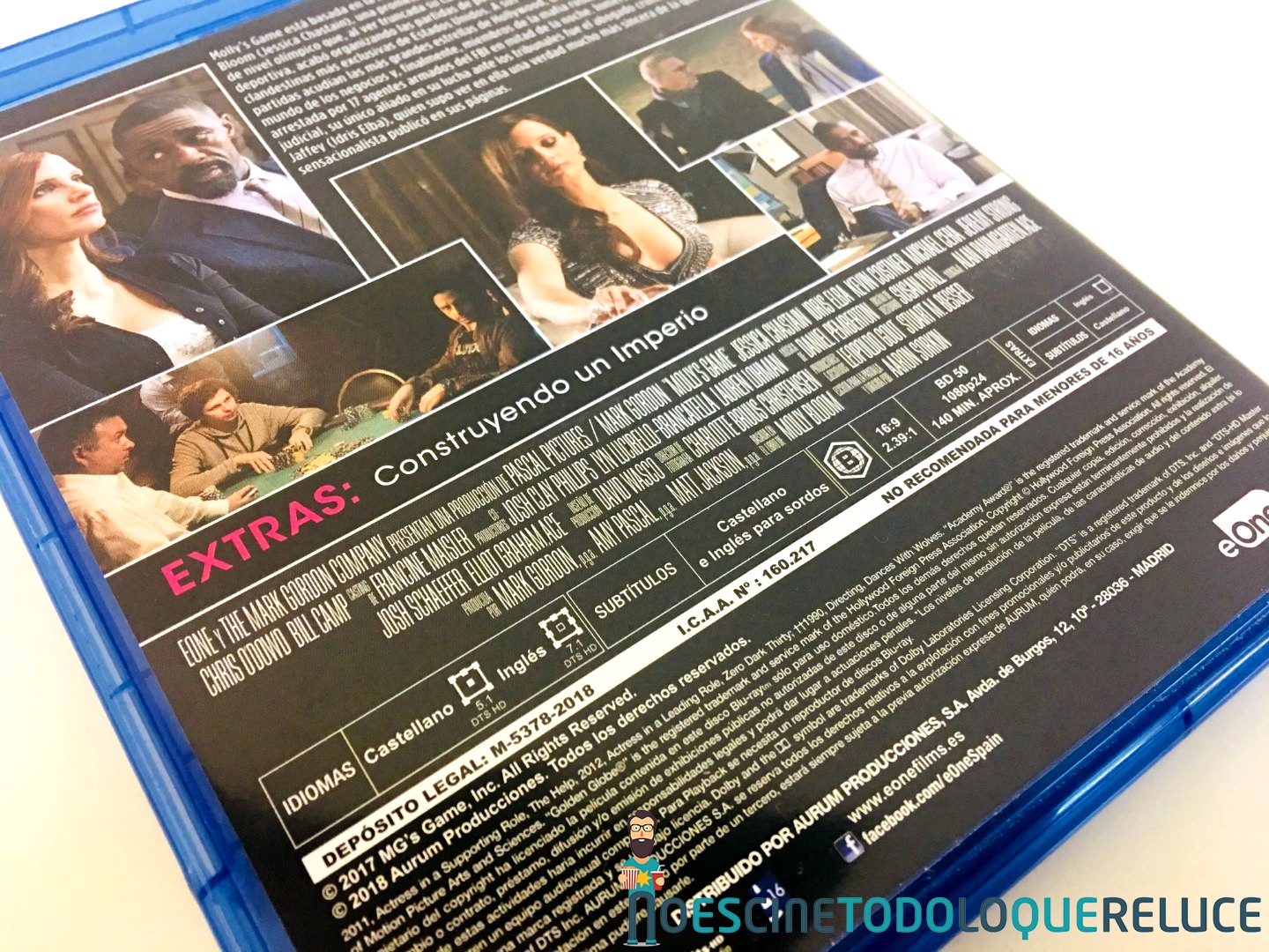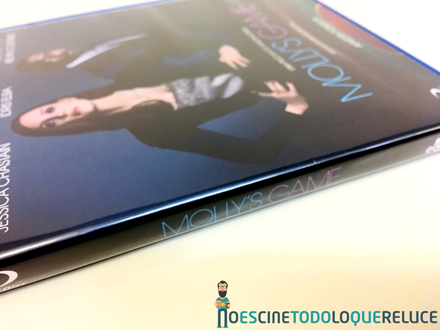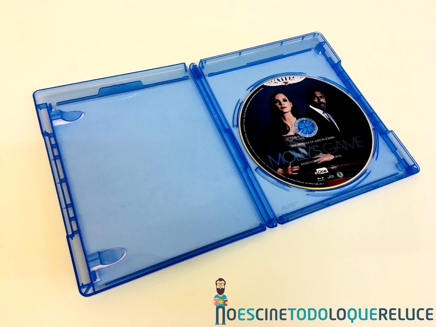 La edición Blu-ray de Molly’s Game está presentada en el clásico estuche amaray azul, que es donde alberga el disco Blu-ray, el cual tiene serigrafiada parte de la imagen de la portada con el título de la película.