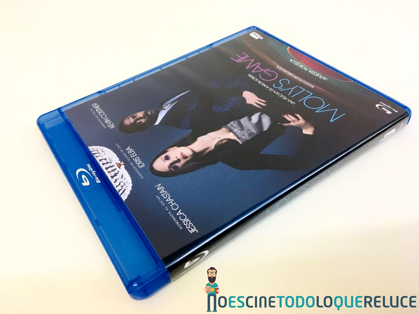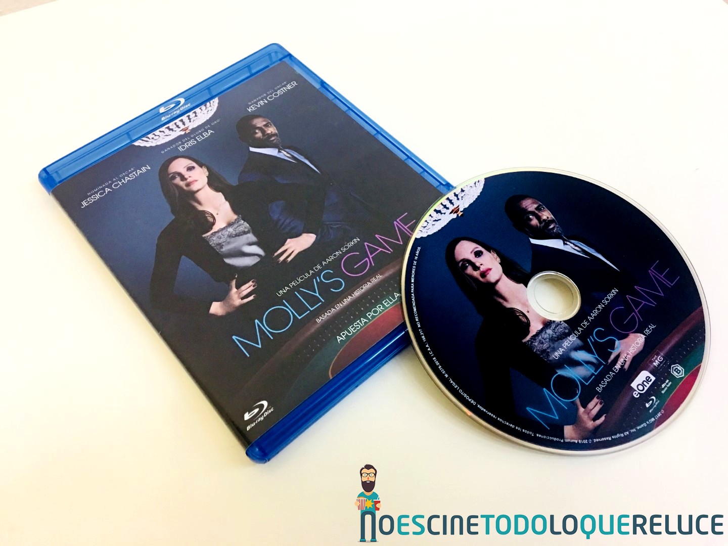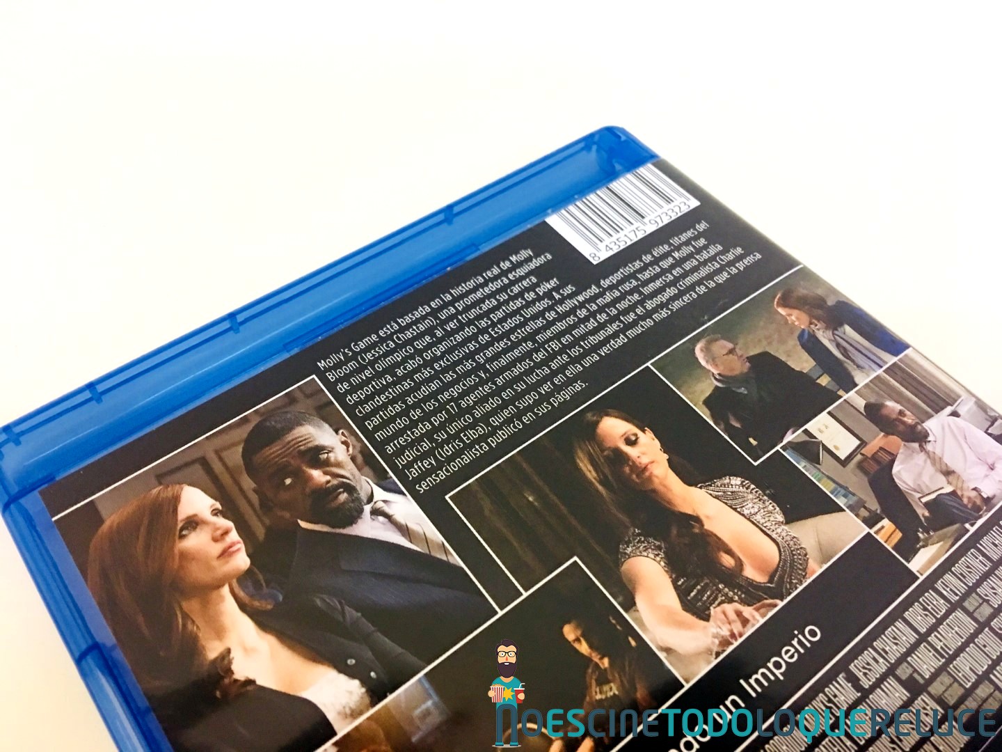 La edición Blu-ray de Molly’s Game está presentada en el clásico estuche amaray azul, que es donde alberga el disco Blu-ray, el cual tiene serigrafiada parte de la imagen de la portada con el título de la película.