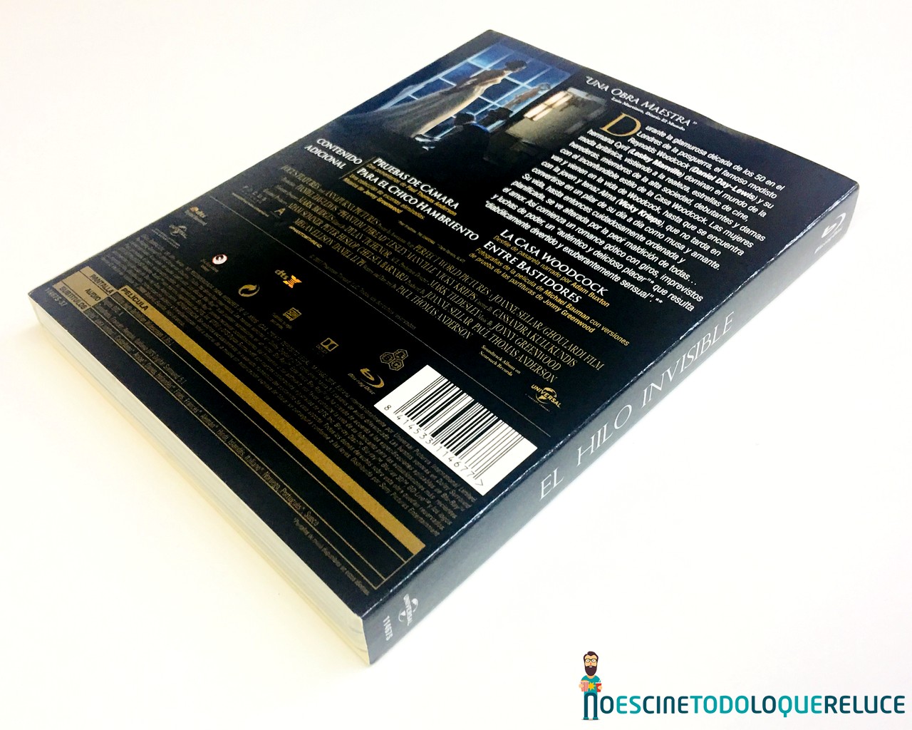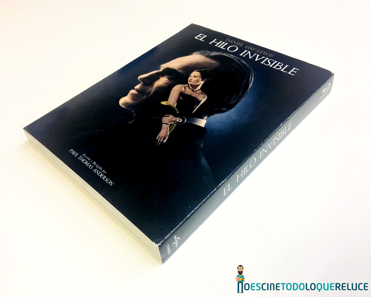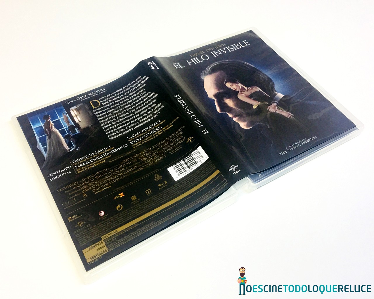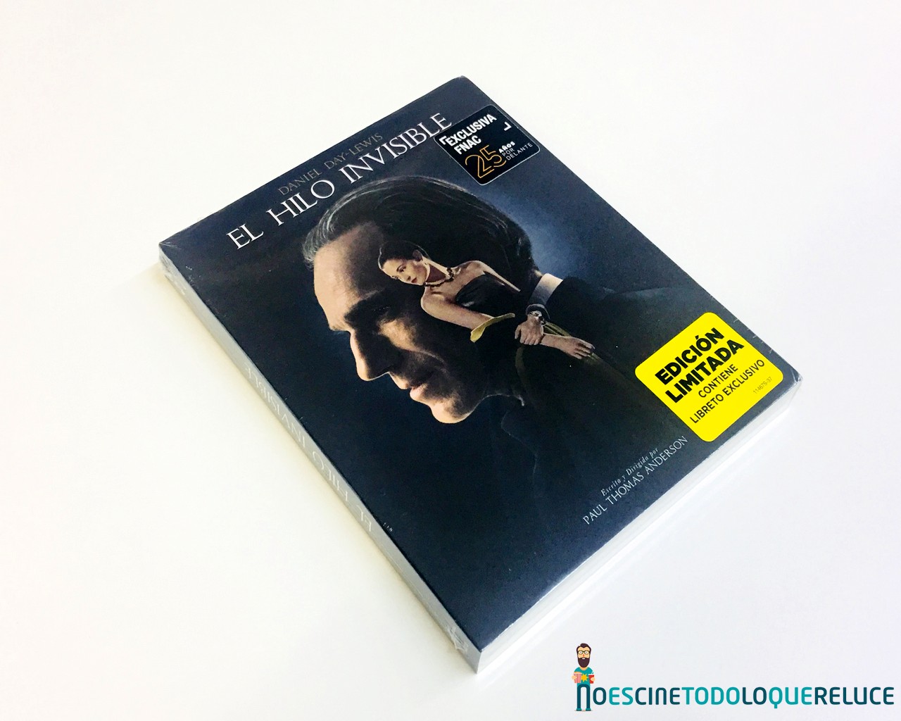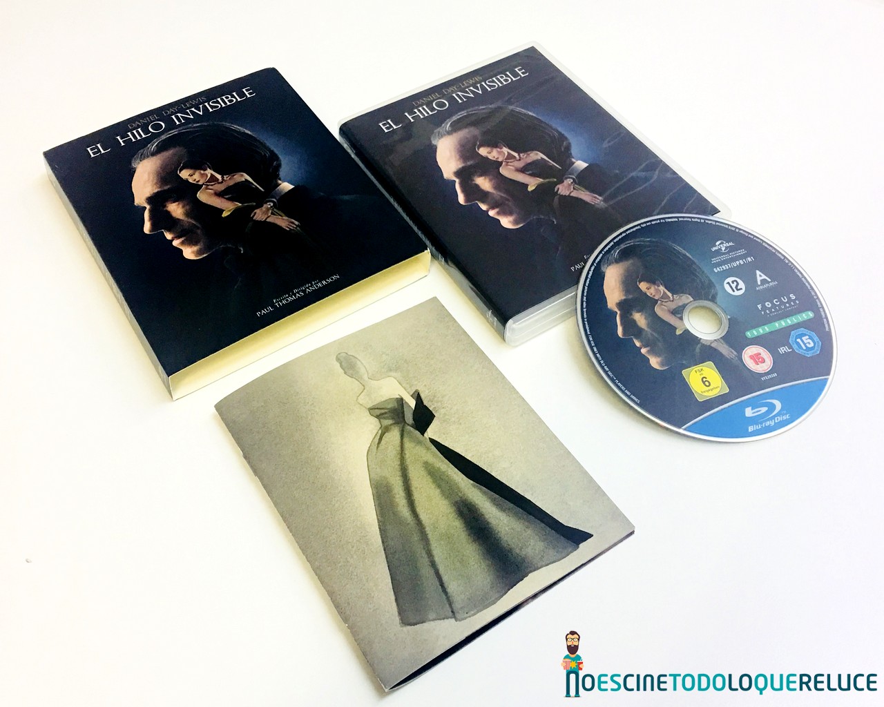 La edición Blu-ray de El hilo invisible de la que os hablamos, y cuyo reportaje fotográfico os dejamos en la parte inferior, es la edición exclusiva de Fnac, que incluye todos los extras de los formatos estándar además de un libreto de la película. Está presentada en un estuche blanco translucido, que destaca por ir dentro de una funda slipcover con el póster oficial de la película acaparando la portada de funda y estuche, predominando los tonos oscuros. La contraportada de ambos nos ofrece también el mismo diseño con los datos técnicos, artísticos y sinopsis, además de una imagen de la película. El estuche alberga tanto el disco Blu-ray -cuya serigrafía es parte del póster de la película- como un libreto de 36 páginas con una introducción por parte del director, y muchos detalles de la producción, con especial relevancia sobre el vestuario, acompañado todo ellos de muchas imágenes de los vestidos creados para la ocasión y los diseños realizados para los mismos.