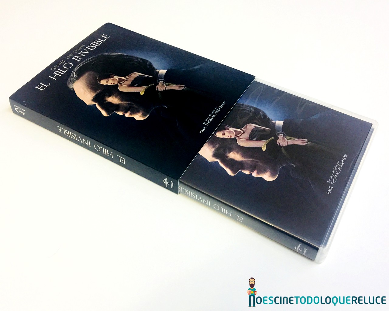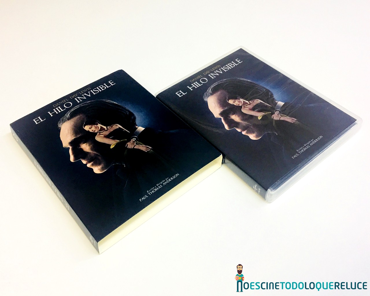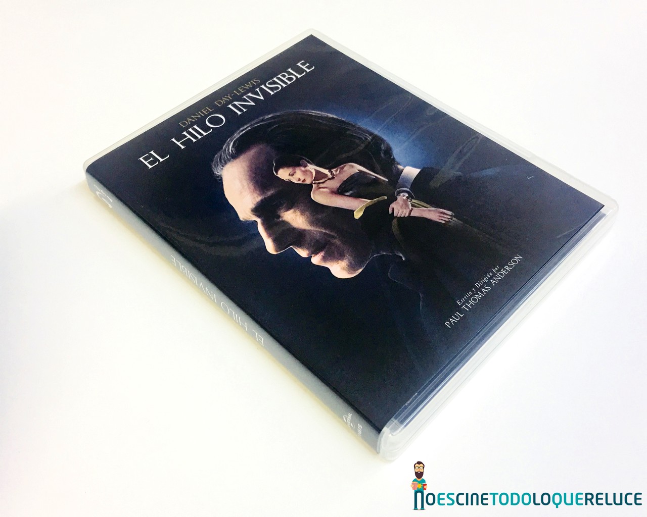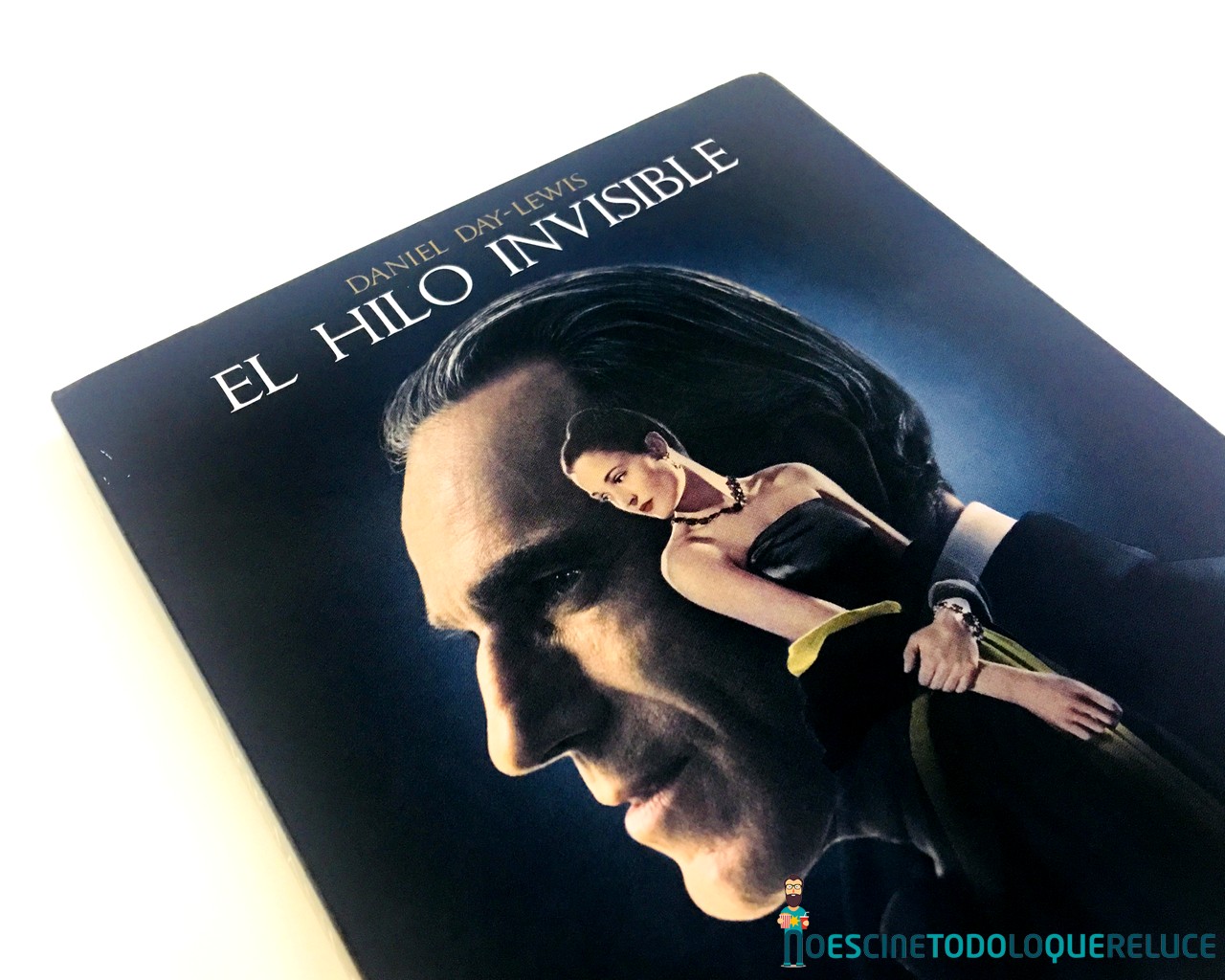 La edición Blu-ray de El hilo invisible de la que os hablamos, y cuyo reportaje fotográfico os dejamos en la parte inferior, es la edición exclusiva de Fnac, que incluye todos los extras de los formatos estándar además de un libreto de la película. Está presentada en un estuche blanco translucido, que destaca por ir dentro de una funda slipcover con el póster oficial de la película acaparando la portada de funda y estuche, predominando los tonos oscuros. La contraportada de ambos nos ofrece también el mismo diseño con los datos técnicos, artísticos y sinopsis, además de una imagen de la película. El estuche alberga tanto el disco Blu-ray -cuya serigrafía es parte del póster de la película- como un libreto de 36 páginas con una introducción por parte del director, y muchos detalles de la producción, con especial relevancia sobre el vestuario, acompañado todo ellos de muchas imágenes de los vestidos creados para la ocasión y los diseños realizados para los mismos.