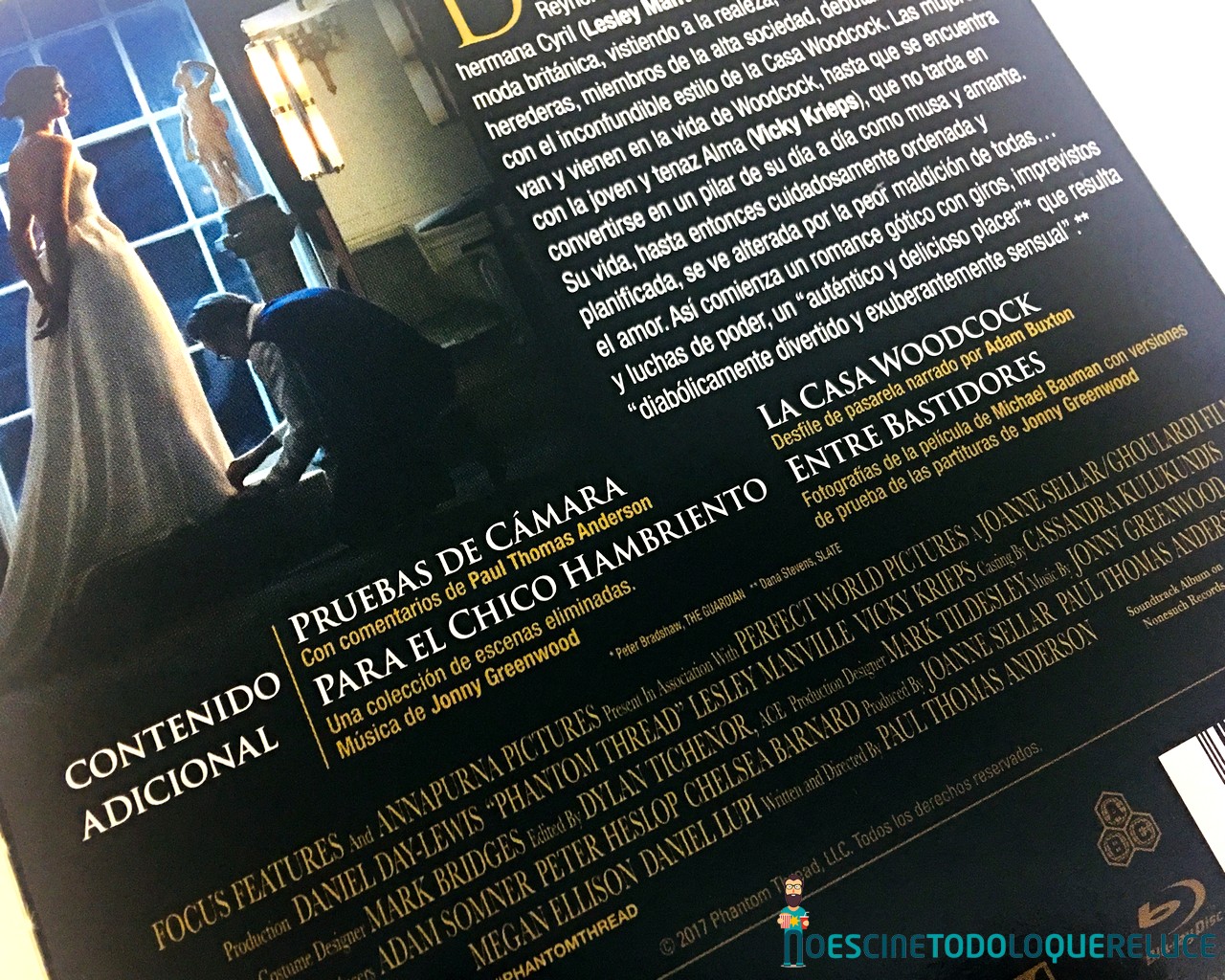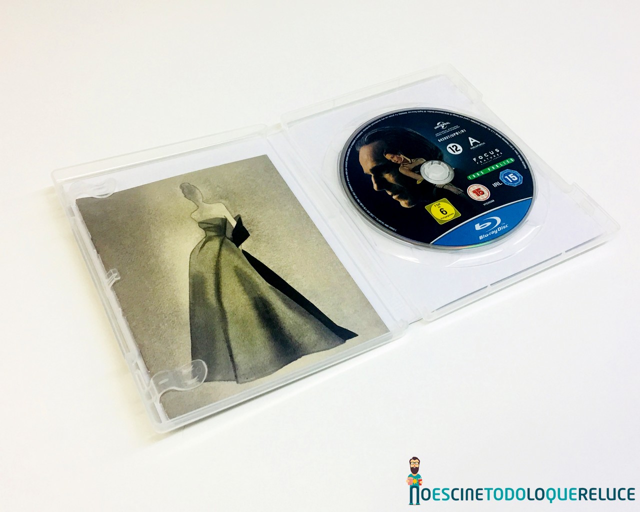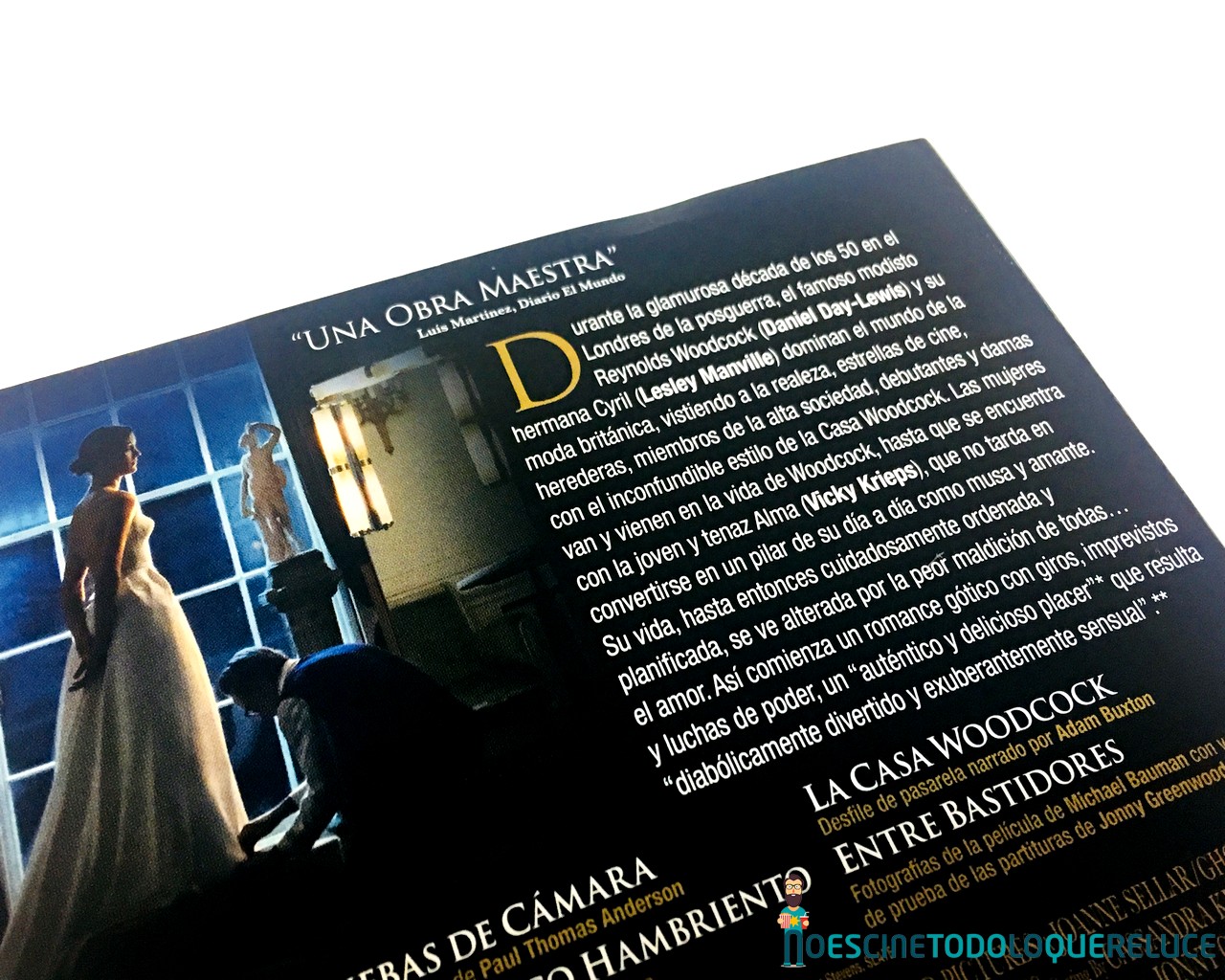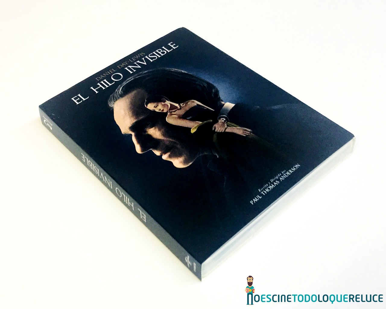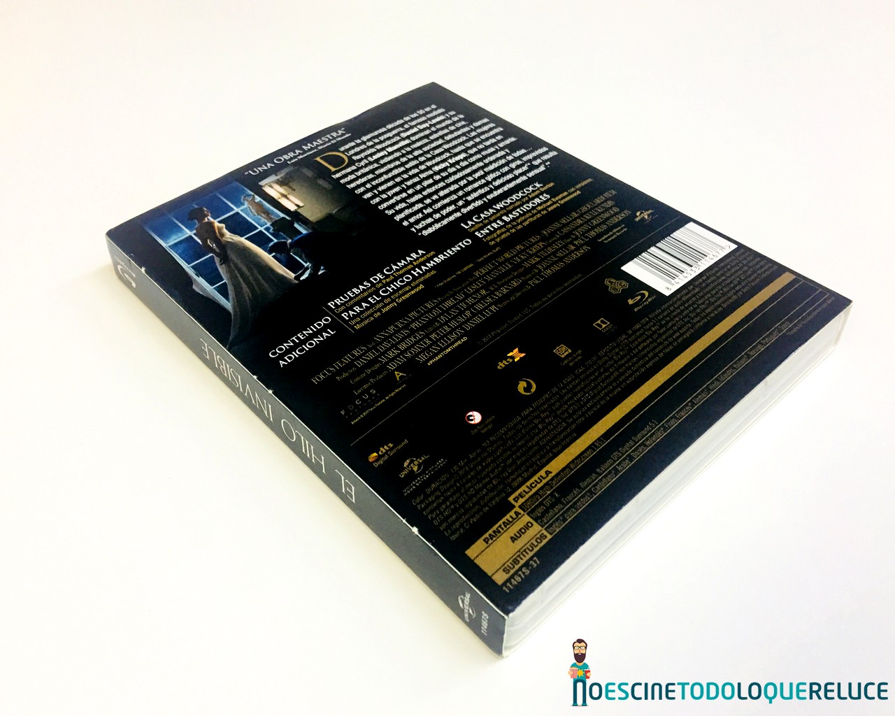 La edición Blu-ray de El hilo invisible de la que os hablamos, y cuyo reportaje fotográfico os dejamos en la parte inferior, es la edición exclusiva de Fnac, que incluye todos los extras de los formatos estándar además de un libreto de la película. Está presentada en un estuche blanco translucido, que destaca por ir dentro de una funda slipcover con el póster oficial de la película acaparando la portada de funda y estuche, predominando los tonos oscuros. La contraportada de ambos nos ofrece también el mismo diseño con los datos técnicos, artísticos y sinopsis, además de una imagen de la película. El estuche alberga tanto el disco Blu-ray -cuya serigrafía es parte del póster de la película- como un libreto de 36 páginas con una introducción por parte del director, y muchos detalles de la producción, con especial relevancia sobre el vestuario, acompañado todo ellos de muchas imágenes de los vestidos creados para la ocasión y los diseños realizados para los mismos.
