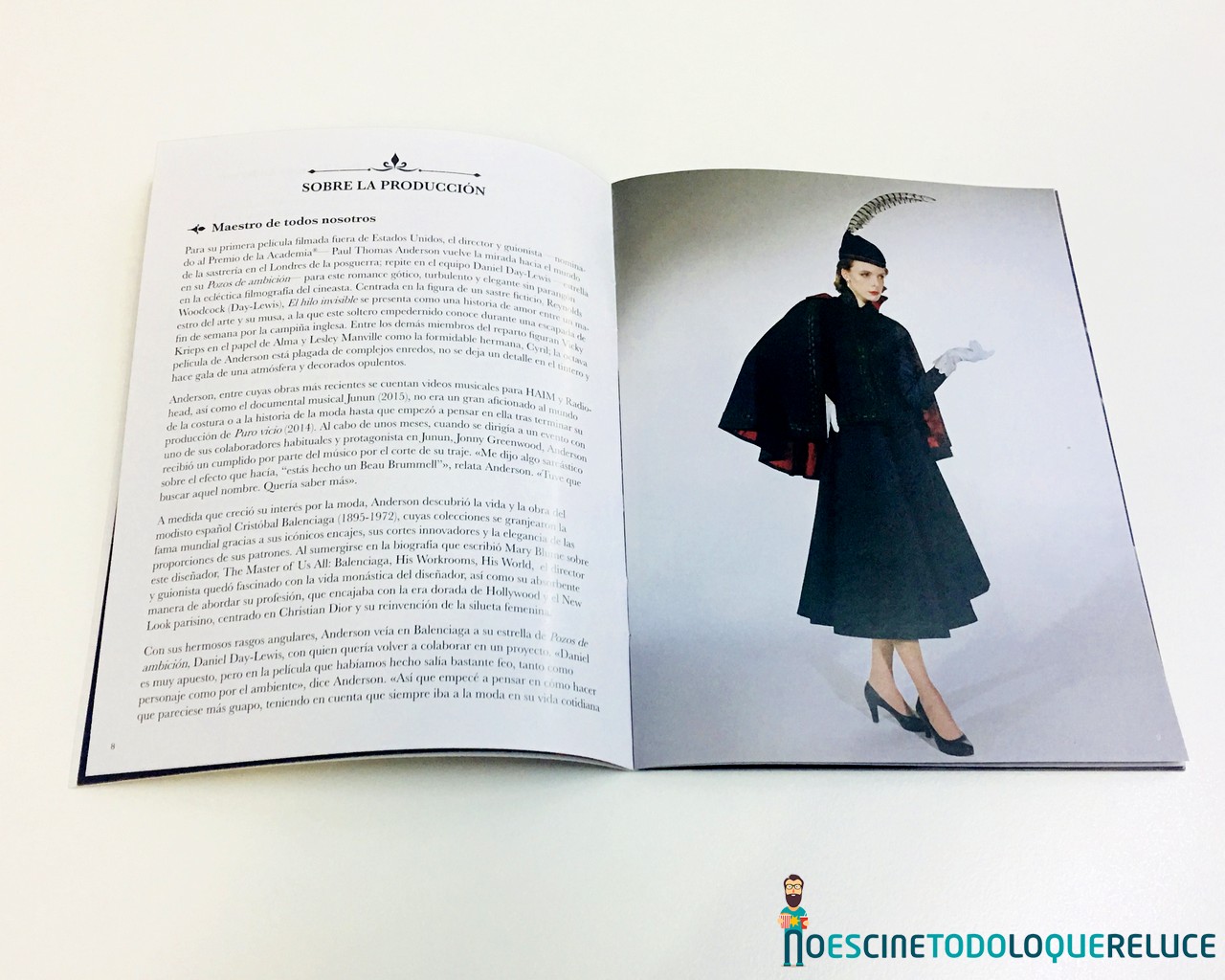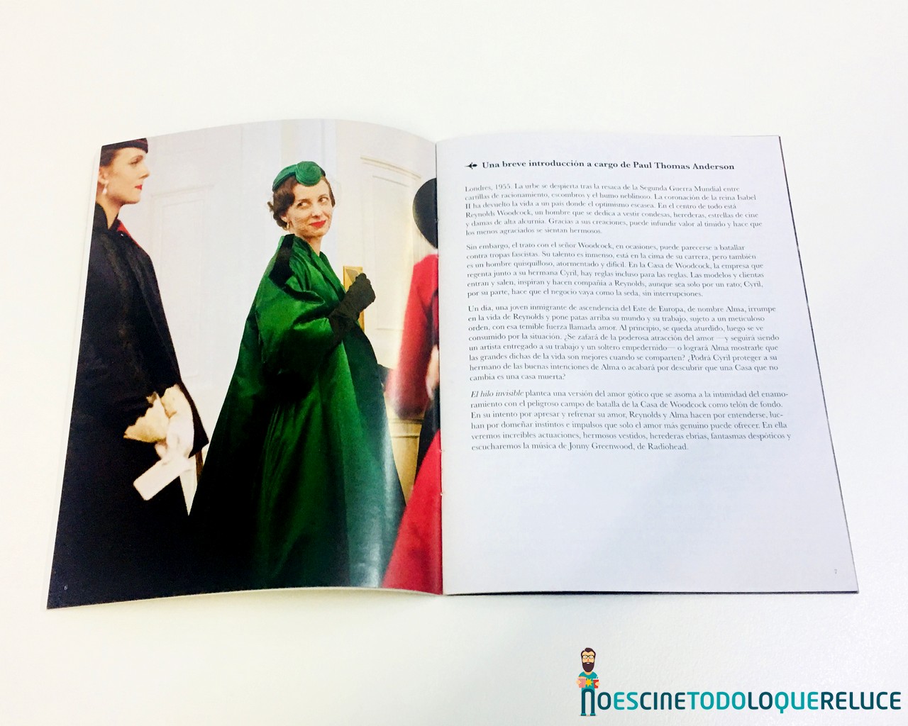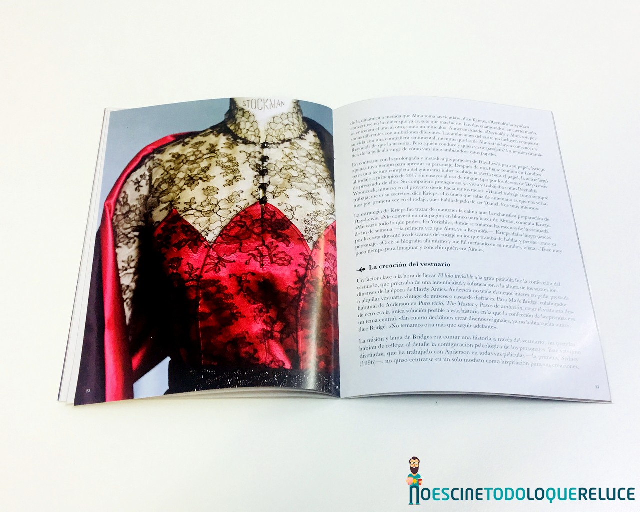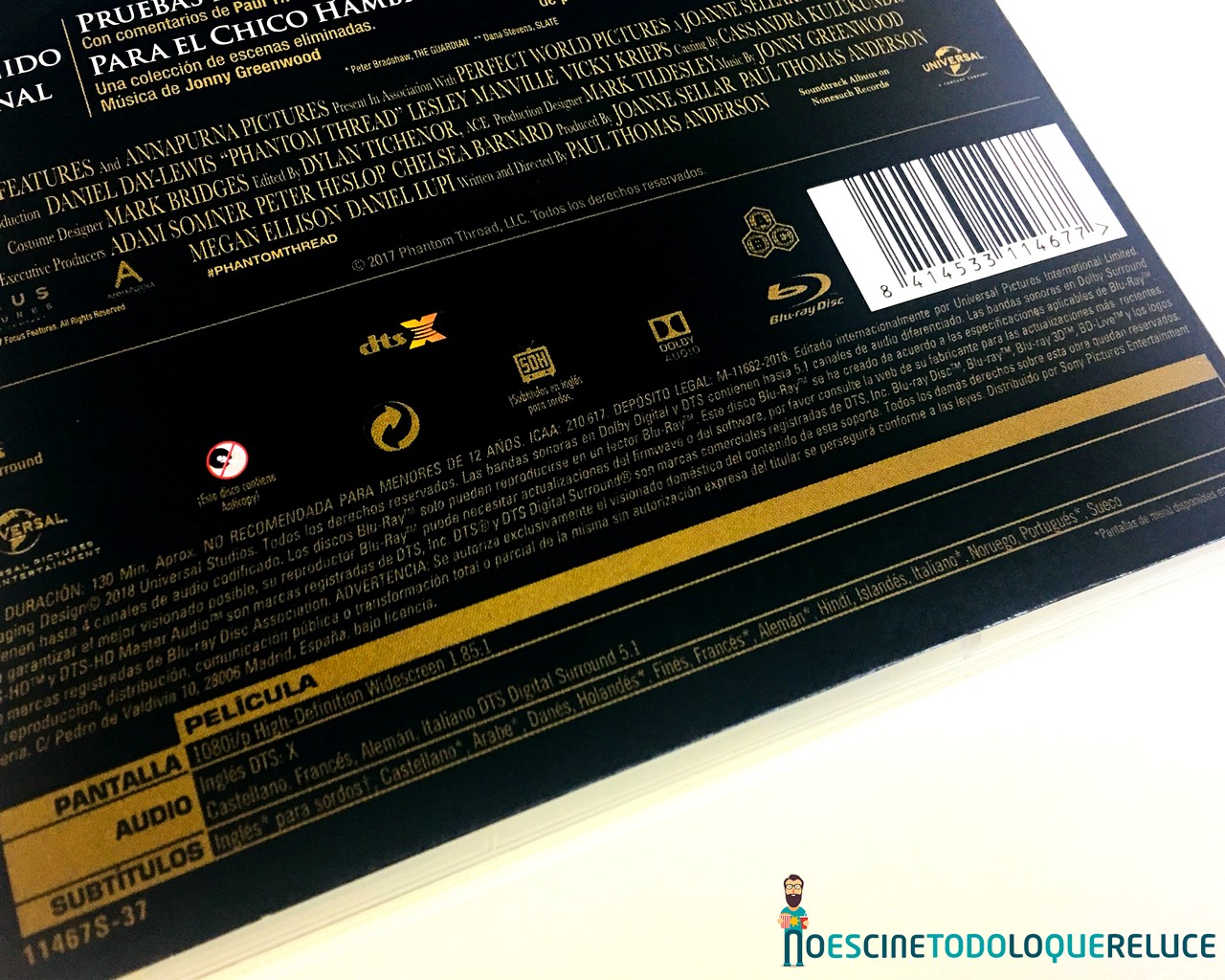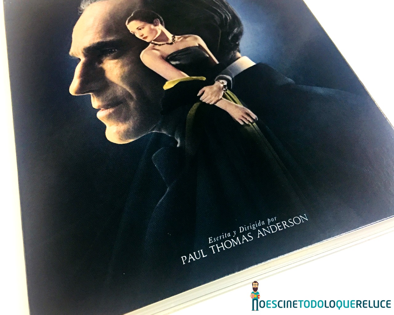 La edición Blu-ray de El hilo invisible de la que os hablamos, y cuyo reportaje fotográfico os dejamos en la parte inferior, es la edición exclusiva de Fnac, que incluye todos los extras de los formatos estándar además de un libreto de la película. Está presentada en un estuche blanco translucido, que destaca por ir dentro de una funda slipcover con el póster oficial de la película acaparando la portada de funda y estuche, predominando los tonos oscuros. La contraportada de ambos nos ofrece también el mismo diseño con los datos técnicos, artísticos y sinopsis, además de una imagen de la película. El estuche alberga tanto el disco Blu-ray -cuya serigrafía es parte del póster de la película- como un libreto de 36 páginas con una introducción por parte del director, y muchos detalles de la producción, con especial relevancia sobre el vestuario, acompañado todo ellos de muchas imágenes de los vestidos creados para la ocasión y los diseños realizados para los mismos.