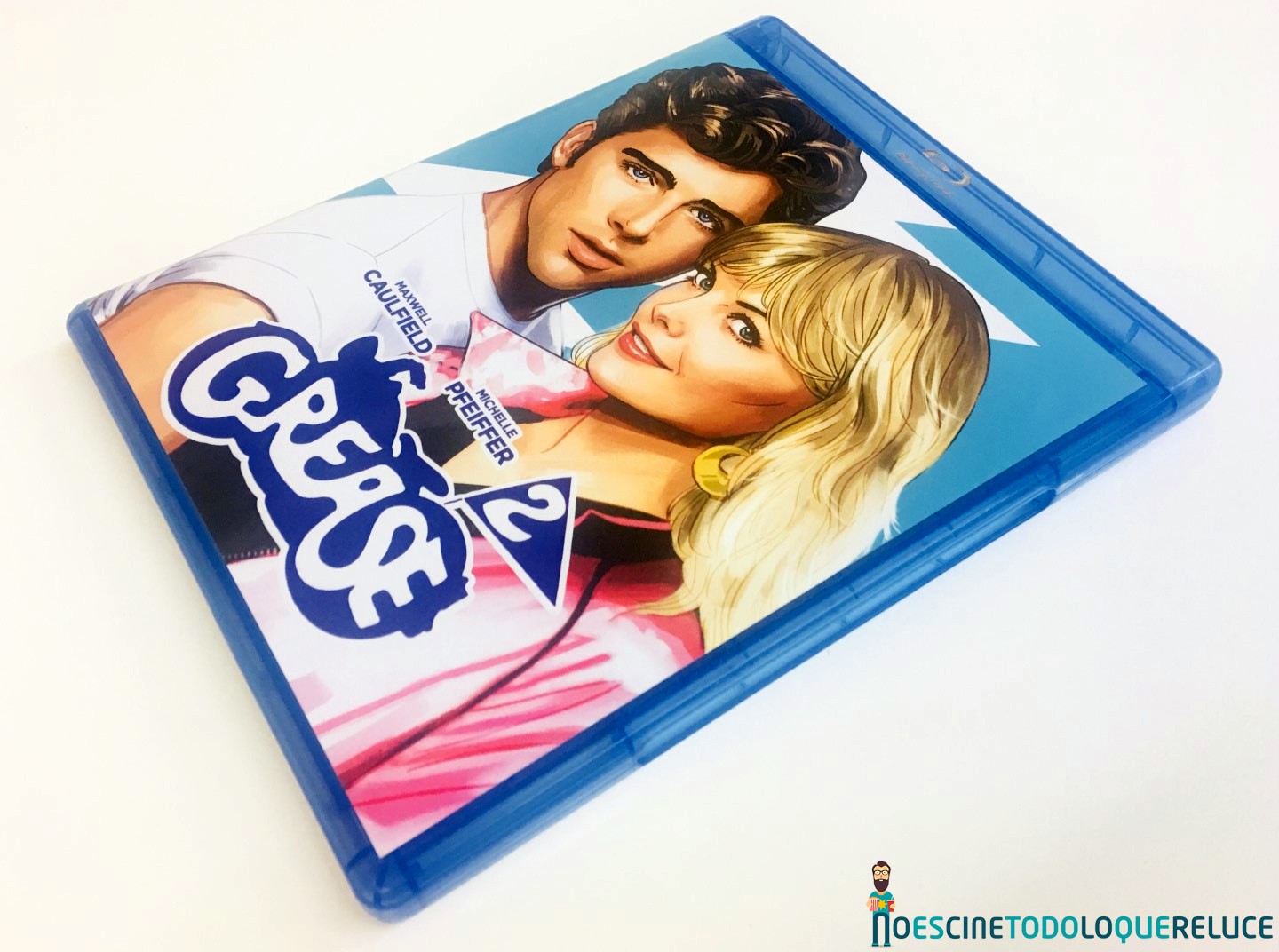 La edición Blu-ray de Grease 2 está presentada en un estuche azul, habitual de este formato, con una ilustración en la portada con los dos protagonistas principales de la película, a juego con la portada de la edición lanzada para el 40º aniversario de Grease. La contraportada nos ofrece los datos técnicos, artísticos y sinopsis con algunas imágenes de la película y los colores a juego de la portada, predominando el azul en vez del rosa de su predecesora. La serigrafía del disco Blu-ray recrea la apariencia de un vinilo.