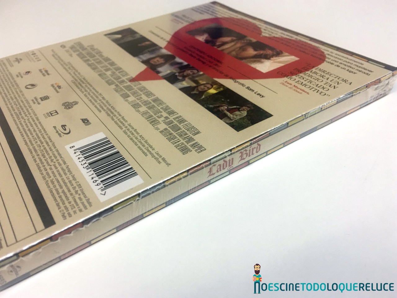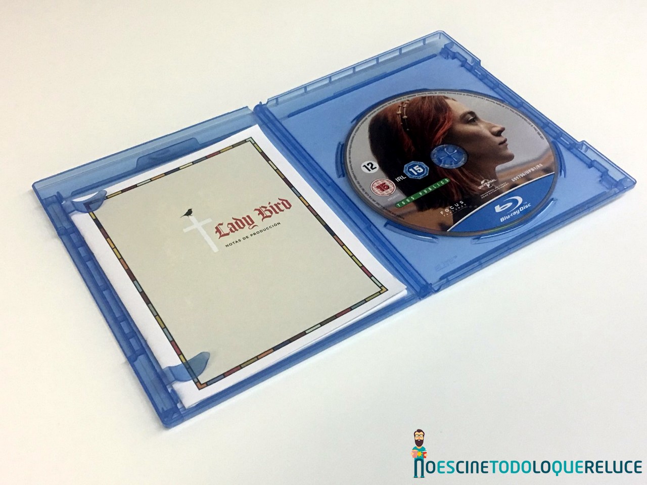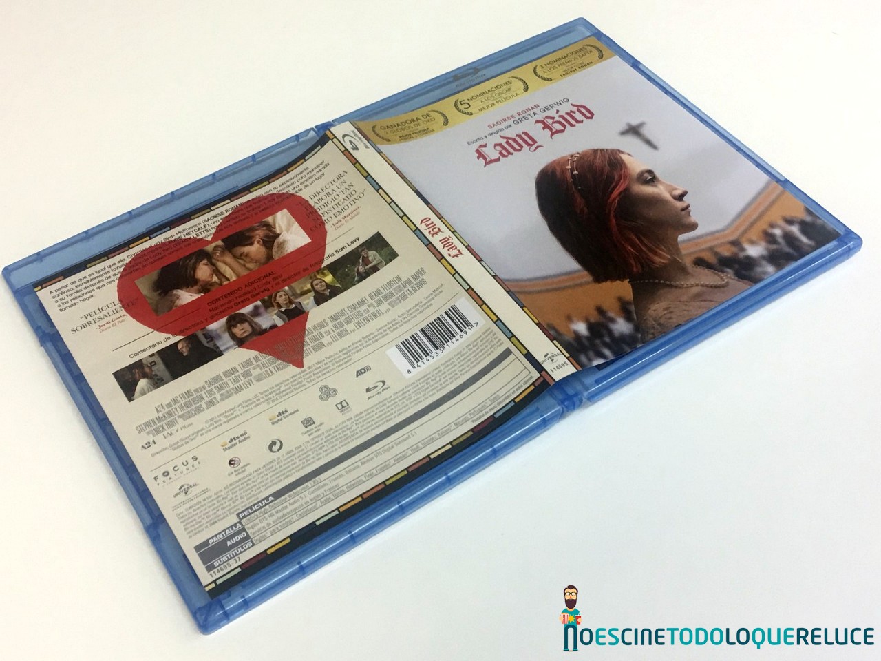 La edición Blu-ray de Lady Bird de la que os hablamos, y cuyo reportaje fotográfico os dejamos en la parte inferior, es la edición exclusiva de Fnac, que incluye todos los extras de los formatos estándar además de un libreto de la película. Está presentada en un estuche azul, habitual de este formato, pero destaca por ir dentro de una funda slipcover con el precioso y minimalista póster de la película acaparando la portada de funda y estuche. La contraportada de ambos nos ofrece también el mismo diseño con los datos técnicos, artísticos y sinopsis, además de algunas imágenes de la película. El estuche alberga tanto el disco Blu-ray -cuya serigrafía es la foto de la protagonista, a juego con la portada- como un libreto de 36 páginas con la ficha artística y una amplia entrevista con la directora acompañada de imágenes que destacan por el tipo de papel satinado elegido para la ocasión.