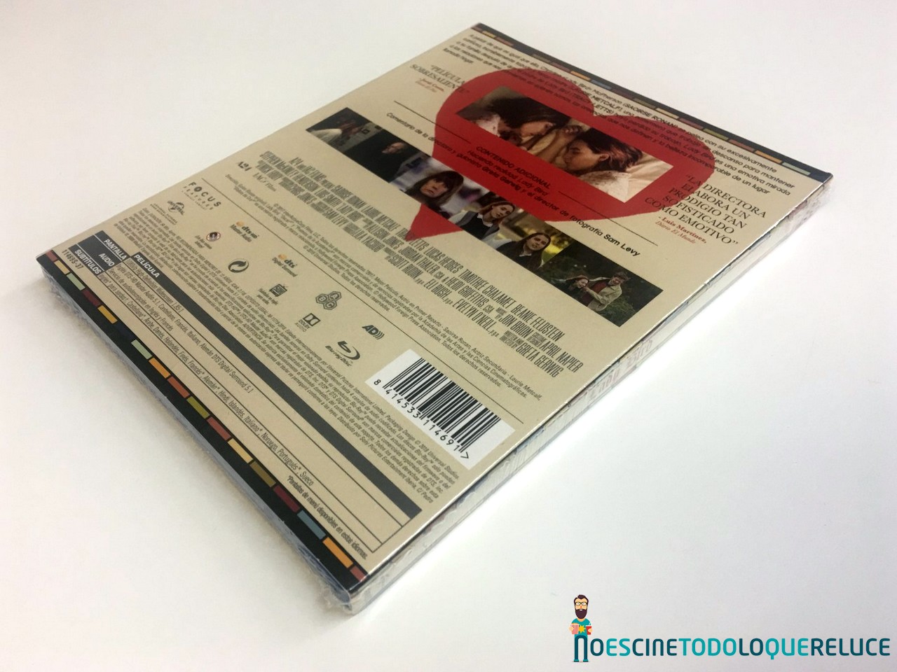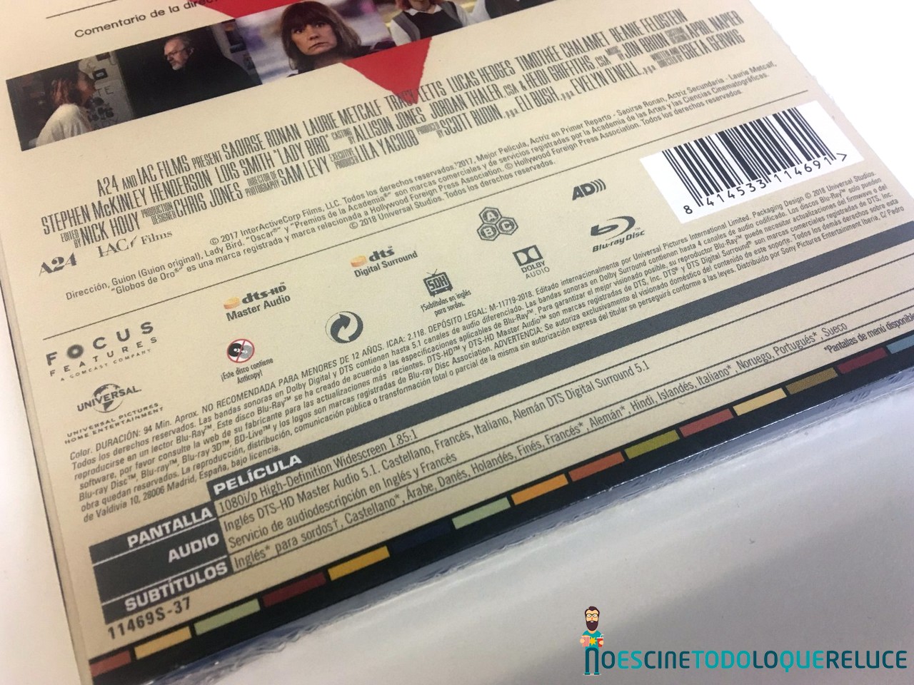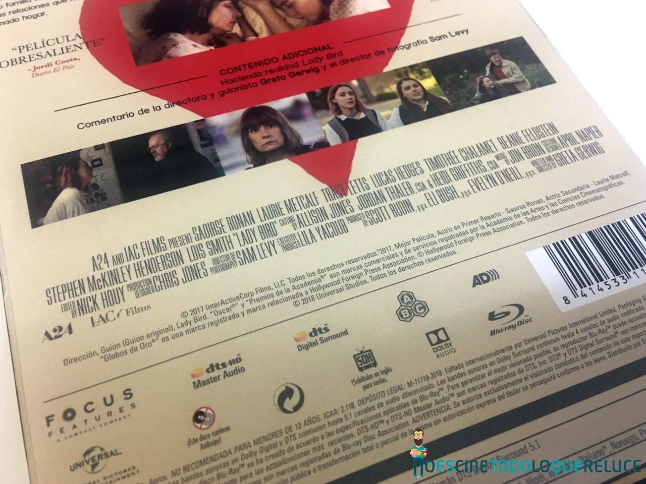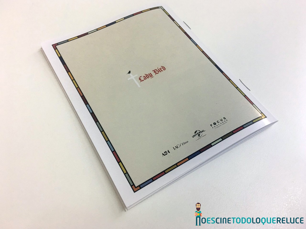 La edición Blu-ray de Lady Bird de la que os hablamos, y cuyo reportaje fotográfico os dejamos en la parte inferior, es la edición exclusiva de Fnac, que incluye todos los extras de los formatos estándar además de un libreto de la película. Está presentada en un estuche azul, habitual de este formato, pero destaca por ir dentro de una funda slipcover con el precioso y minimalista póster de la película acaparando la portada de funda y estuche. La contraportada de ambos nos ofrece también el mismo diseño con los datos técnicos, artísticos y sinopsis, además de algunas imágenes de la película. El estuche alberga tanto el disco Blu-ray -cuya serigrafía es la foto de la protagonista, a juego con la portada- como un libreto de 36 páginas con la ficha artística y una amplia entrevista con la directora acompañada de imágenes que destacan por el tipo de papel satinado elegido para la ocasión.