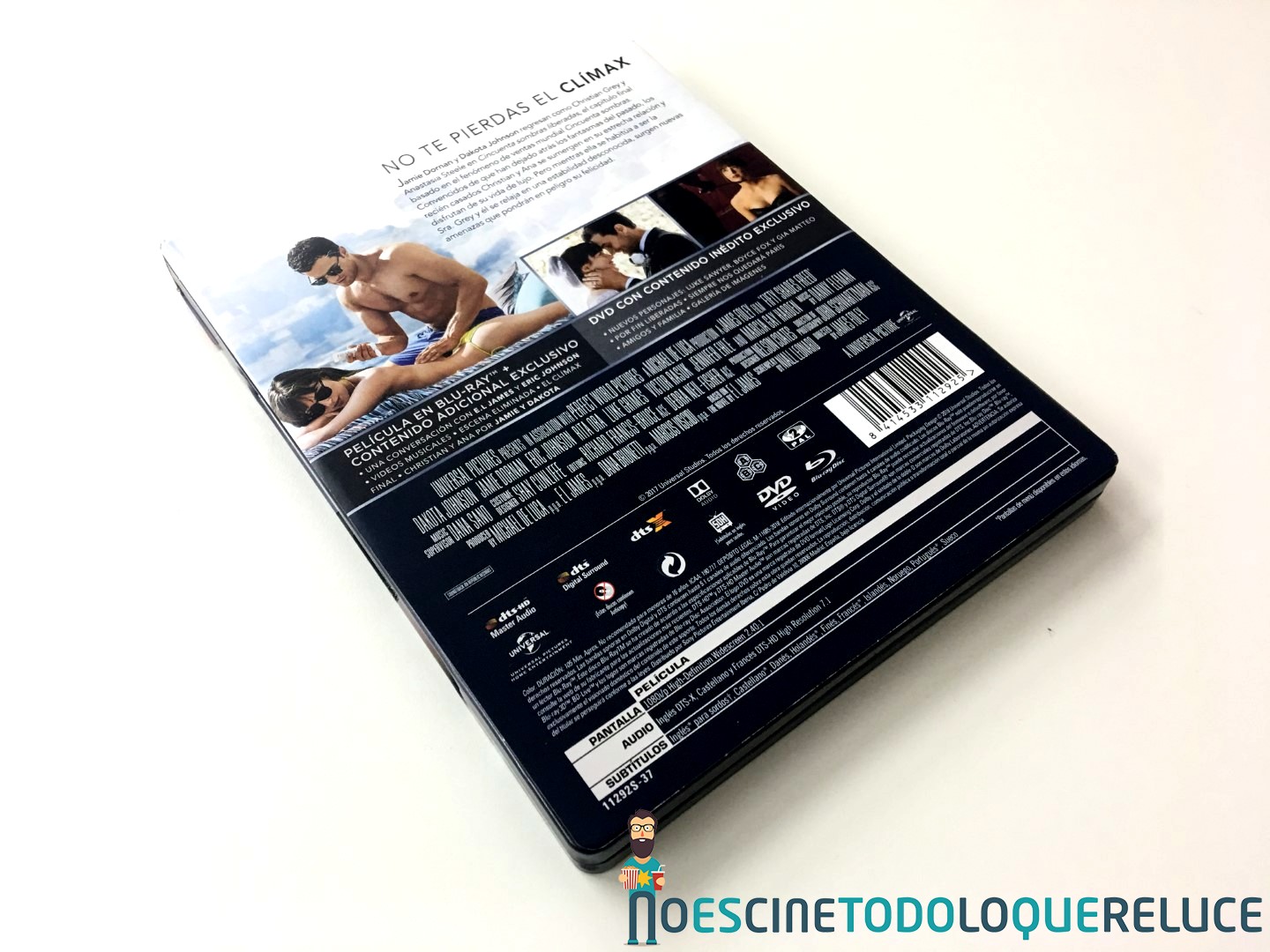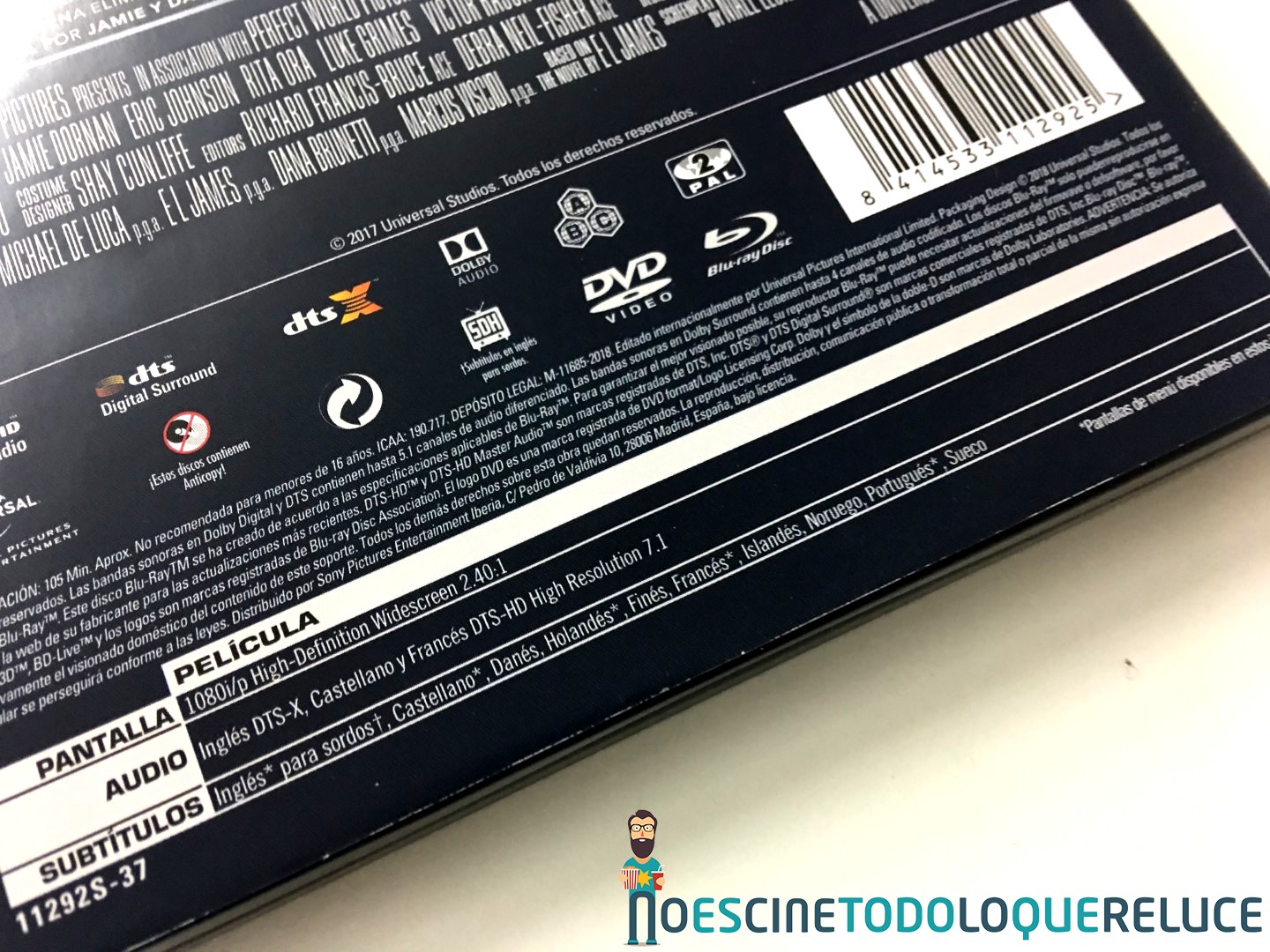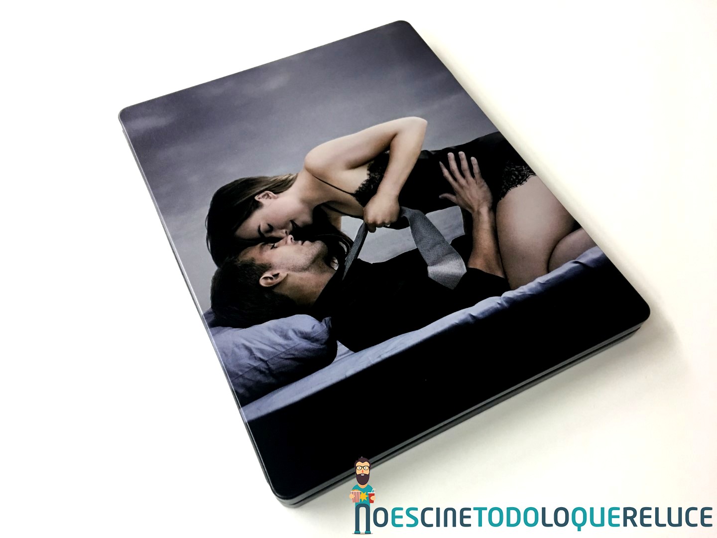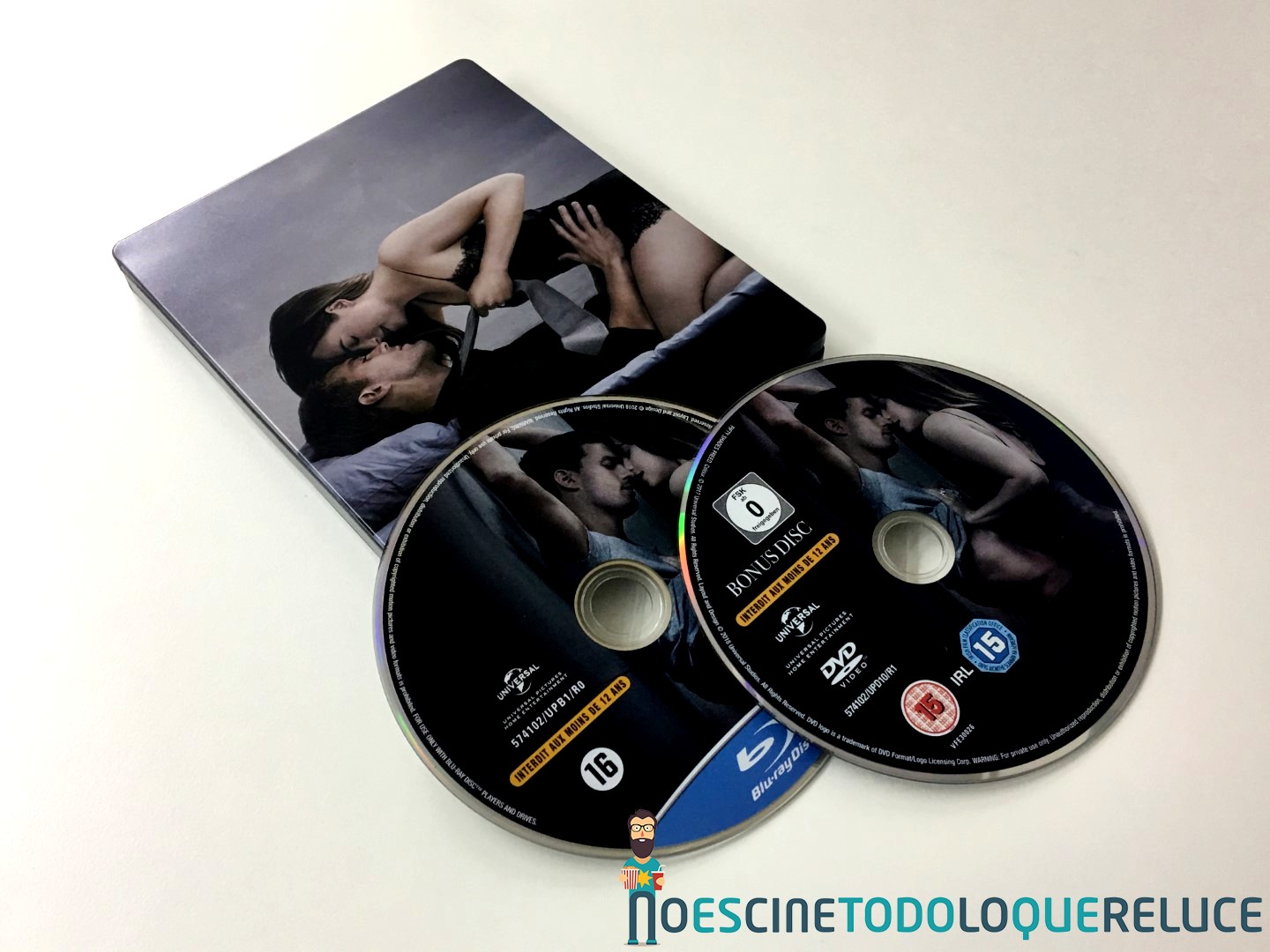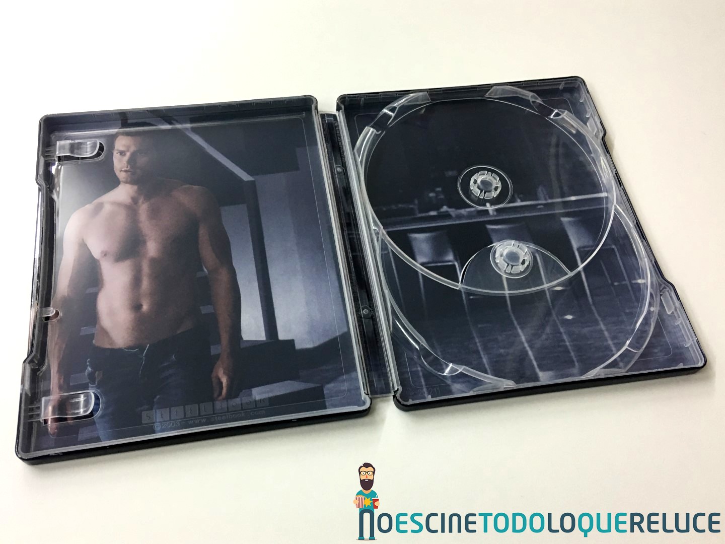 El steelbook en cuestión que analizamos destaca por una llamativa y sensual imagen en la portada, con Christian (Jamie Dornan) y Ana (Dakota Johnson) acaparando todo el frontal con una provocativa postura sin presencia del título. En el lomo no encontramos el título de la película, sino tan sólo el logo de Universal en la parte inferior, como sucede en la contraportada, en la que solo vemos el tono de fondo de la portada. El interior hará las delicias de los fans de Jamie Dornan pues incluye una foto del actor sin camiseta acaparando toda la parte interior izquierda, mientras que la derecha incluye los huecos para los dos discos, uno Blu-ray para la película y otro DVD para los extras, ambos con otra escena de la película con los dos protagonistas en la serigrafía. Todas las especificaciones y detalles de la película, así como su título, vienen en la hoja que va pegada a la caja metálica, la cual es fácilmente despegable, y no deja rastro en el steelbook.
