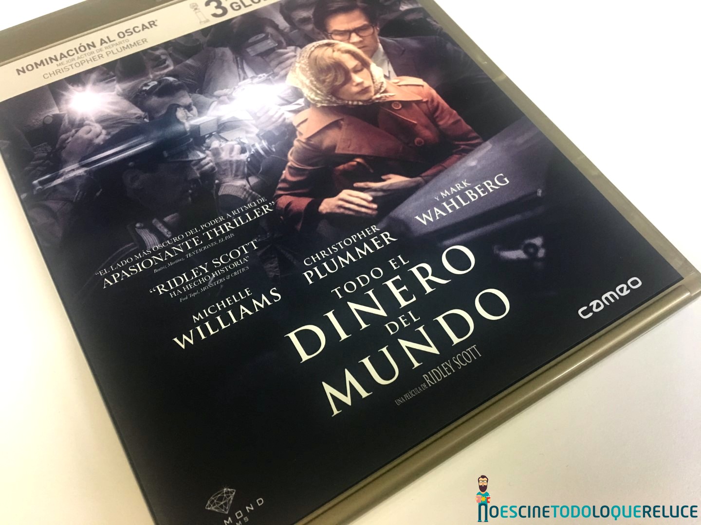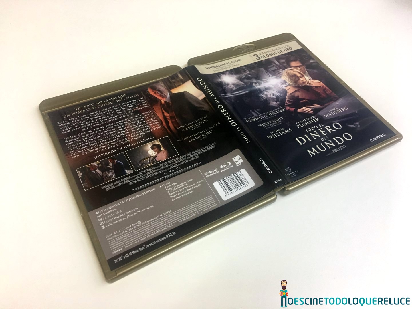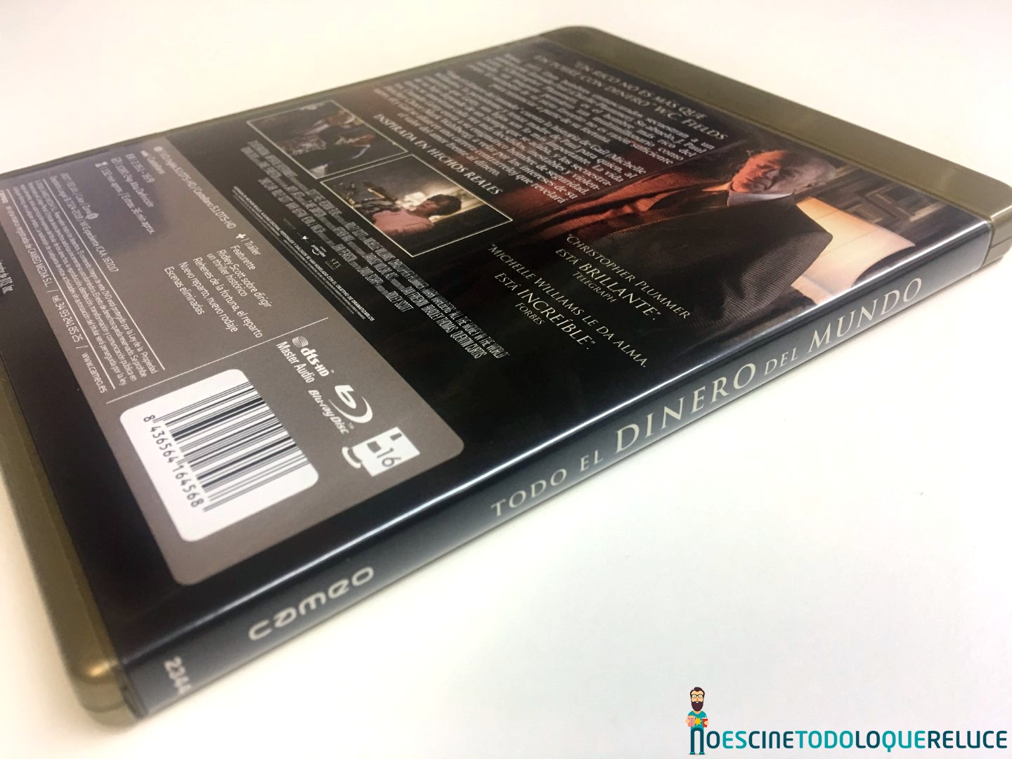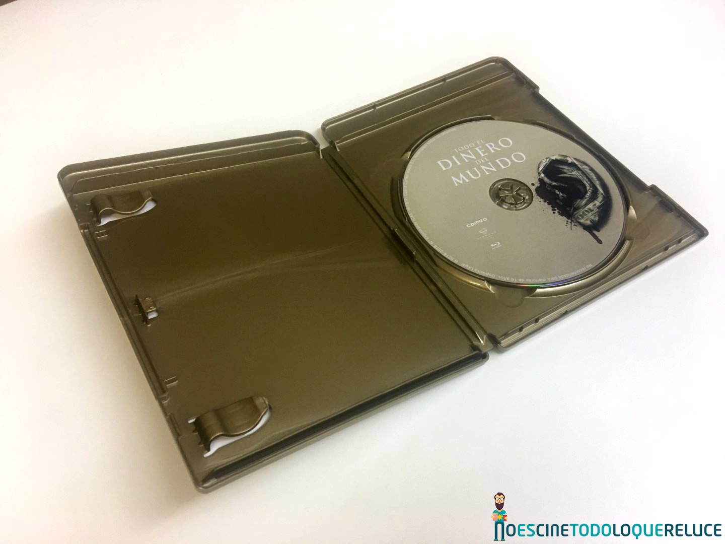 La edición Blu-ray de Todo el dinero del mundo está presentada en un estucho amaray dorado, que representa muy bien la esencia del color del dinero para muchos, con el póster original acaparando la portada, mientras que la contraportada nos ofrece sinopsis, detalles técnicos y artísticos, junto con algunas imágenes de la película. En el interior nos encontramos el disco Blu-ray, con una representativa oreja como serigrafía, acompañada del título en español.