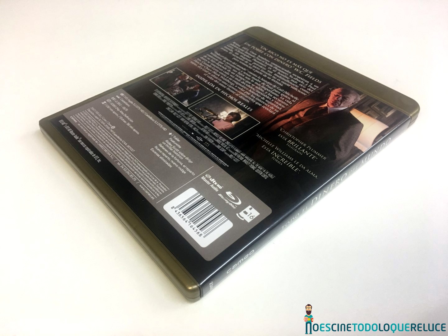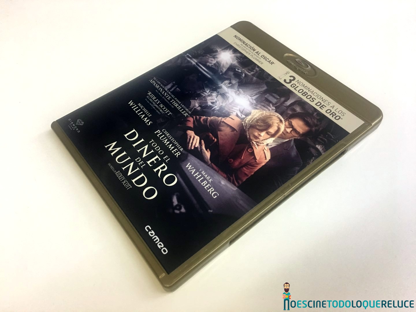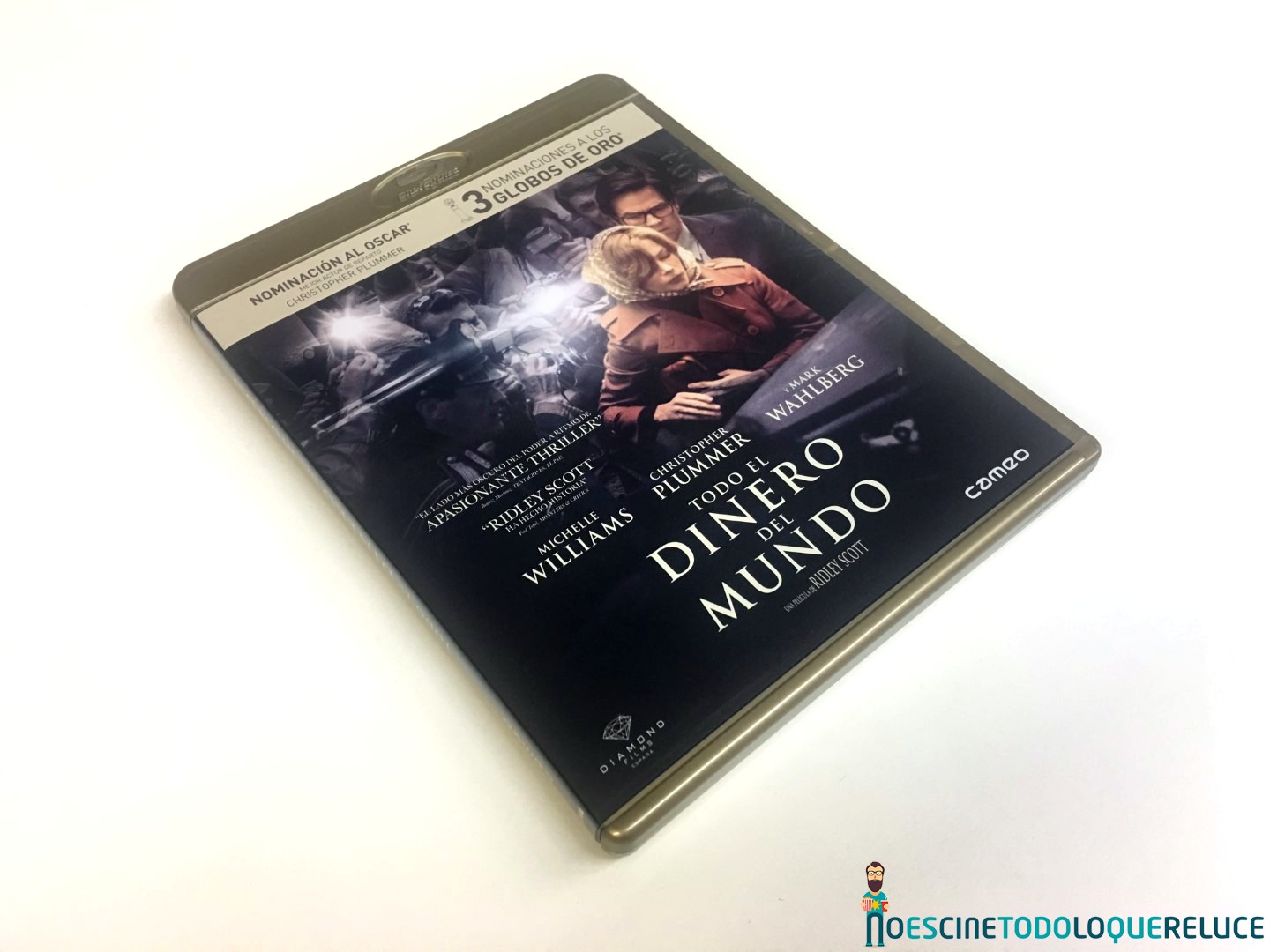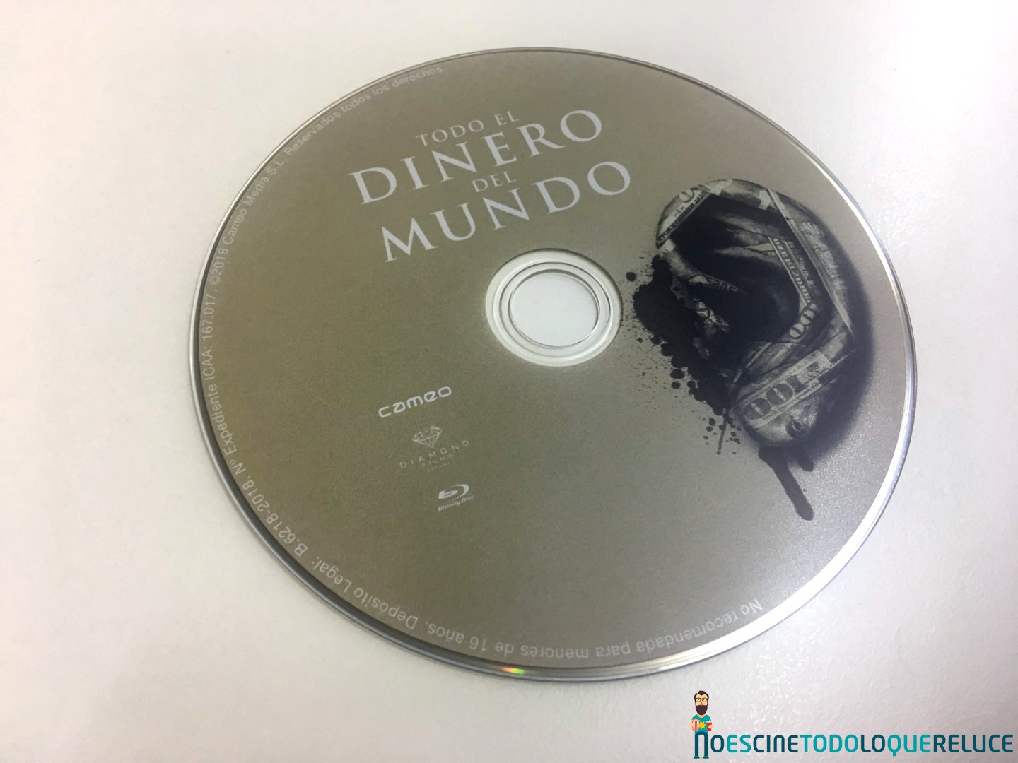 La edición Blu-ray de Todo el dinero del mundo está presentada en un estucho amaray dorado, que representa muy bien la esencia del color del dinero para muchos, con el póster original acaparando la portada, mientras que la contraportada nos ofrece sinopsis, detalles técnicos y artísticos, junto con algunas imágenes de la película. En el interior nos encontramos el disco Blu-ray, con una representativa oreja como serigrafía, acompañada del título en español.