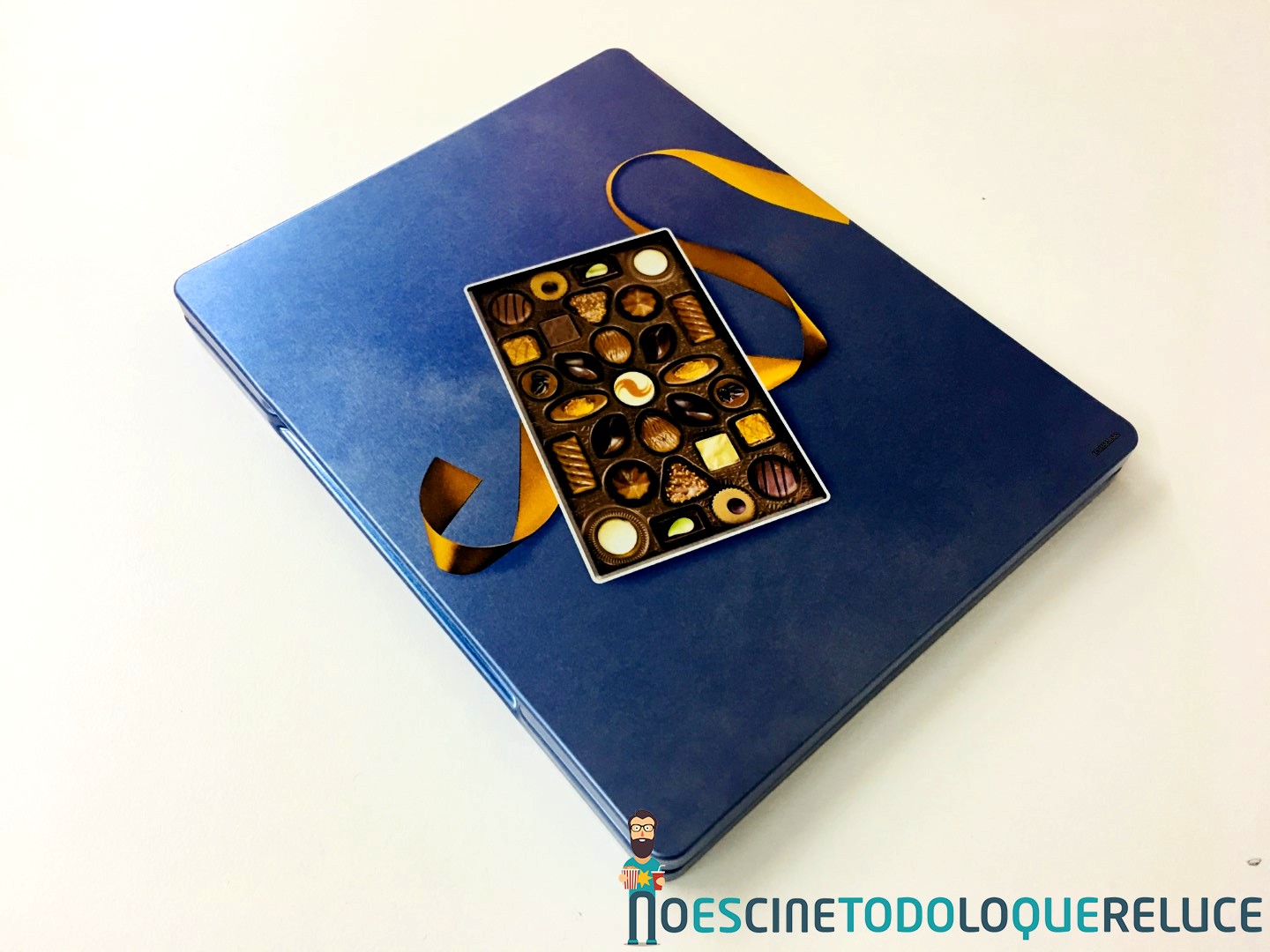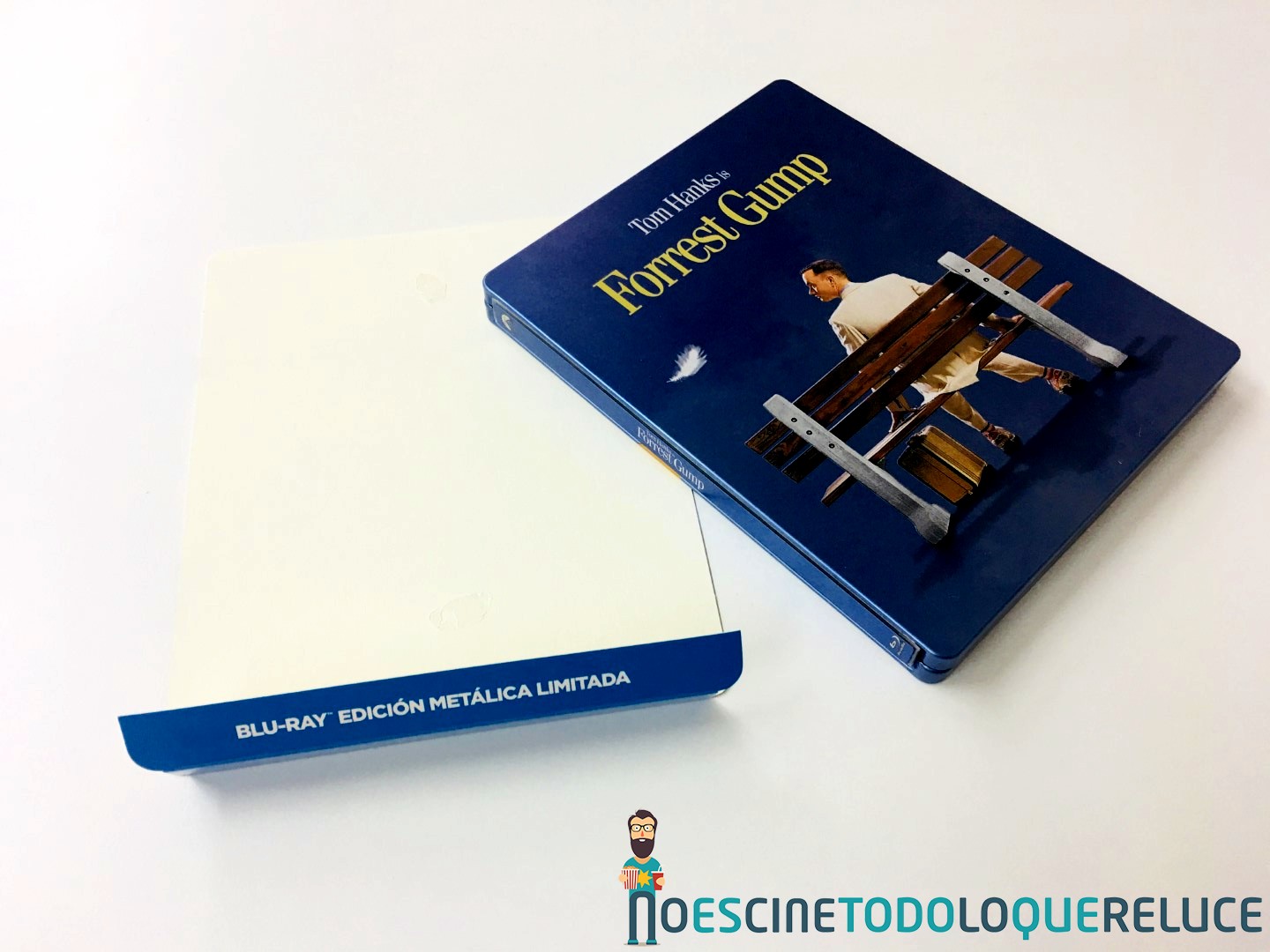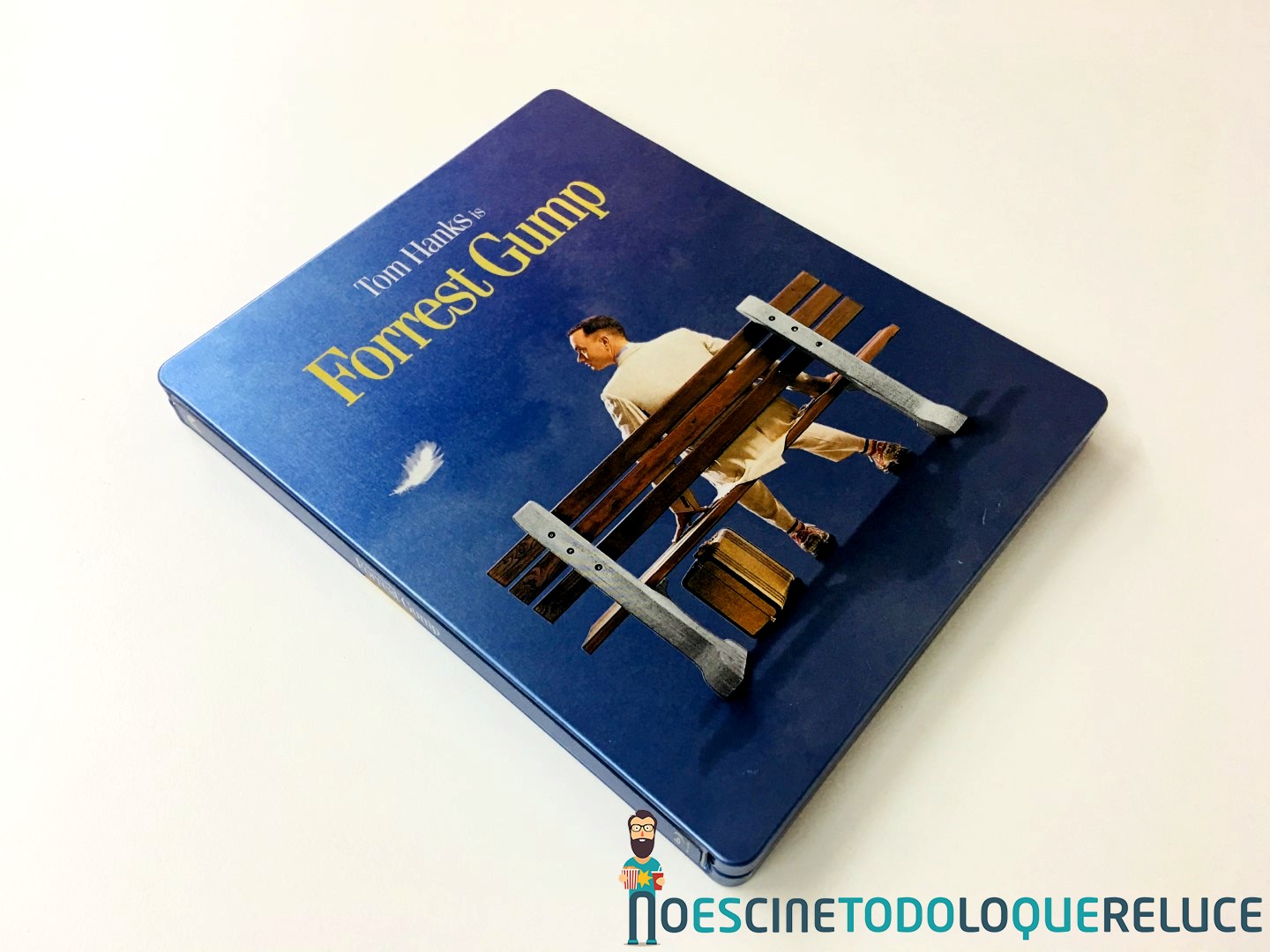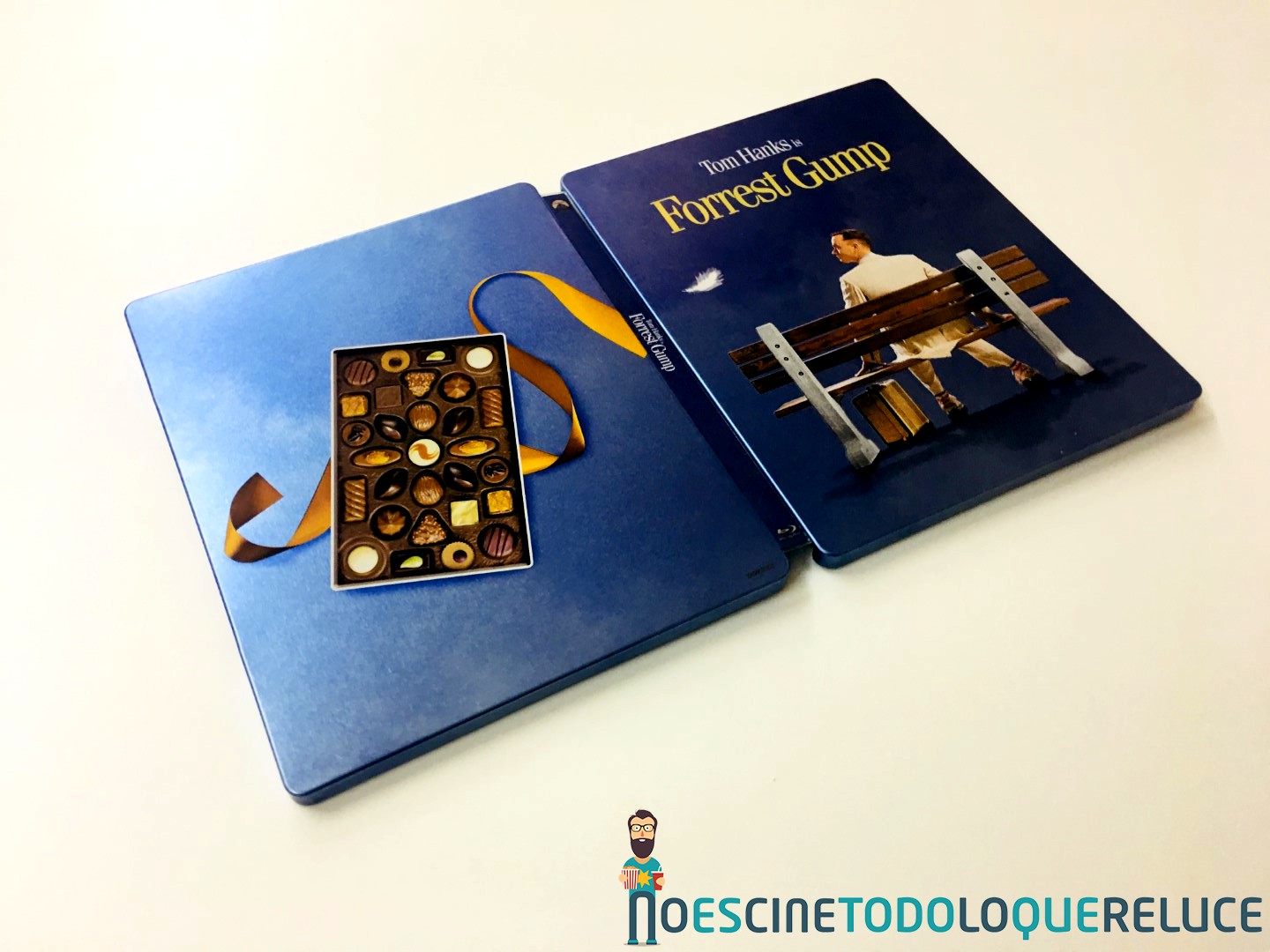 El steelbook en cuestión que analizamos destaca por el tono azul que acapara todo su exterior, e incluye en su portada una representativa imagen de la película, con Forrest sentado en un banco, mientras que la contraportada nos ofrece la simbólica imagen de una caja de bombones. Tanto la portada como el lomo incluyen el título de la película, y en el interior nos encontramos con un fotograma de Forrest Gump abarcando ambos lados, donde también encontramos el disco Blu-ray que tan sólo incluye el título de la película y los datos correspondientes a las recomendaciones de edad para cada país en el que se distribuye este disco. Todas las especificaciones y detalles de la película, así como algunas fotografías, vienen en el cartón que va pegado a la caja metálica, el cual no deja rastro en el steelbook una vez despegado.