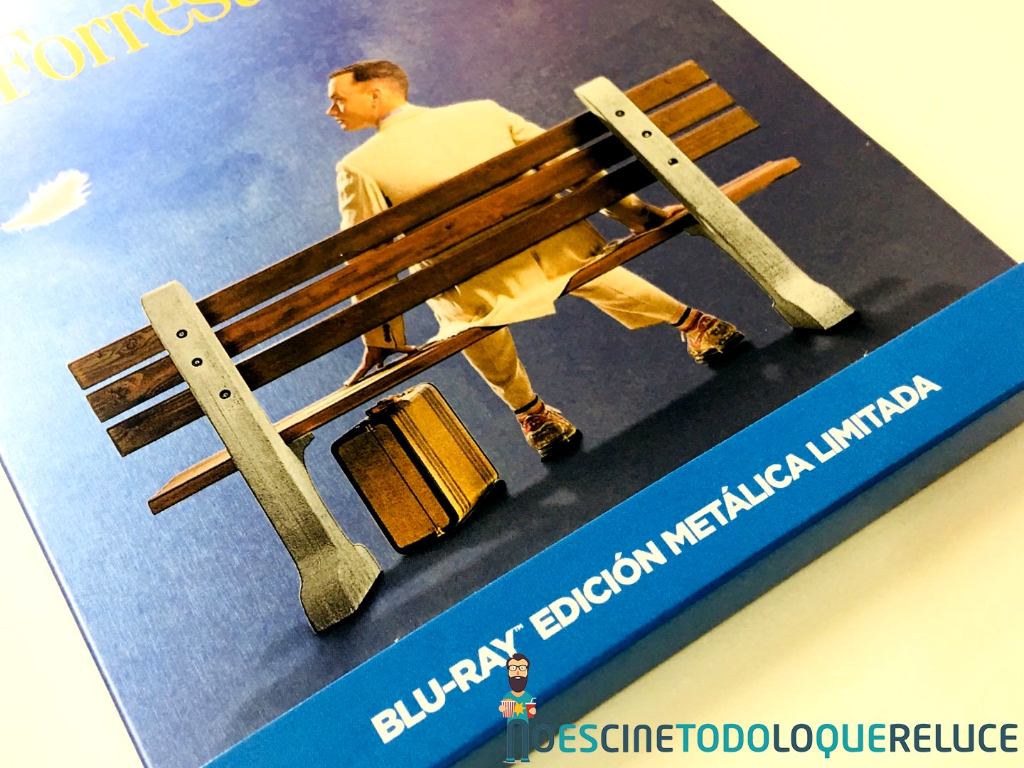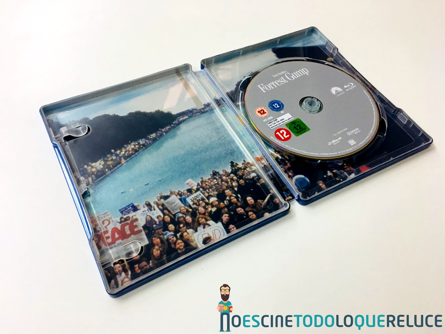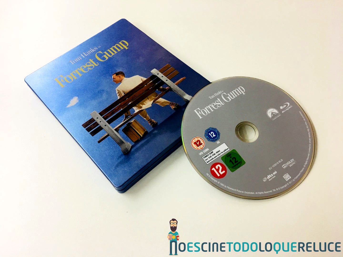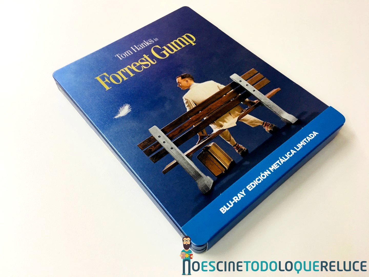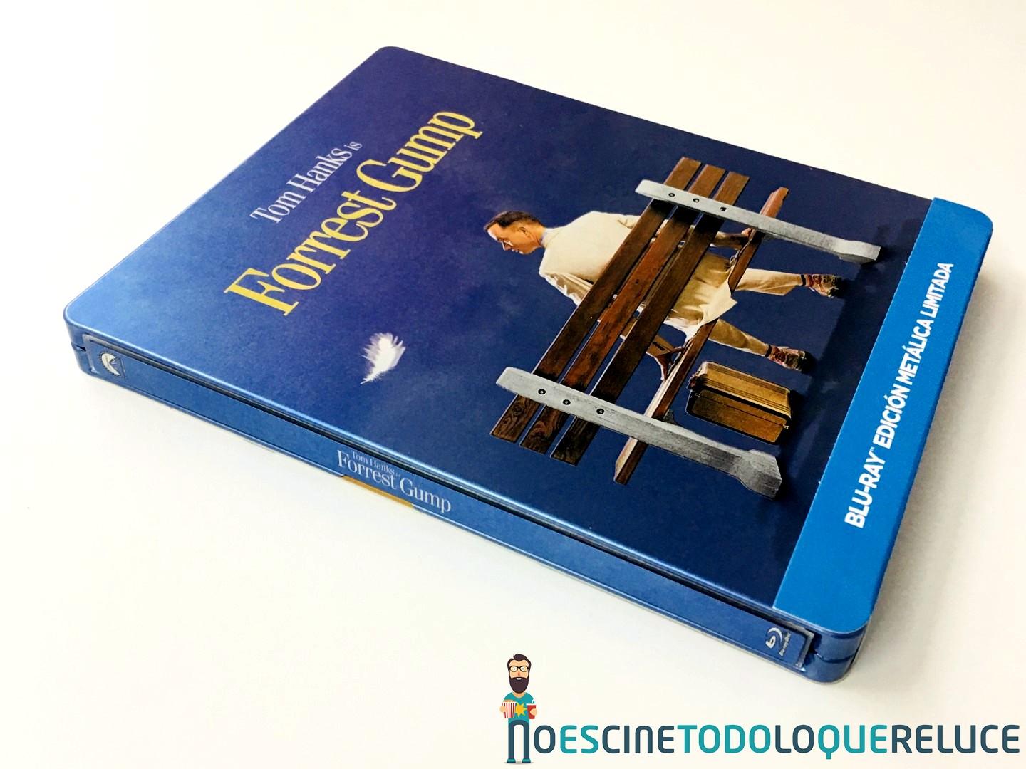 El steelbook en cuestión que analizamos destaca por el tono azul que acapara todo su exterior, e incluye en su portada una representativa imagen de la película, con Forrest sentado en un banco, mientras que la contraportada nos ofrece la simbólica imagen de una caja de bombones. Tanto la portada como el lomo incluyen el título de la película, y en el interior nos encontramos con un fotograma de Forrest Gump abarcando ambos lados, donde también encontramos el disco Blu-ray que tan sólo incluye el título de la película y los datos correspondientes a las recomendaciones de edad para cada país en el que se distribuye este disco. Todas las especificaciones y detalles de la película, así como algunas fotografías, vienen en el cartón que va pegado a la caja metálica, el cual no deja rastro en el steelbook una vez despegado.