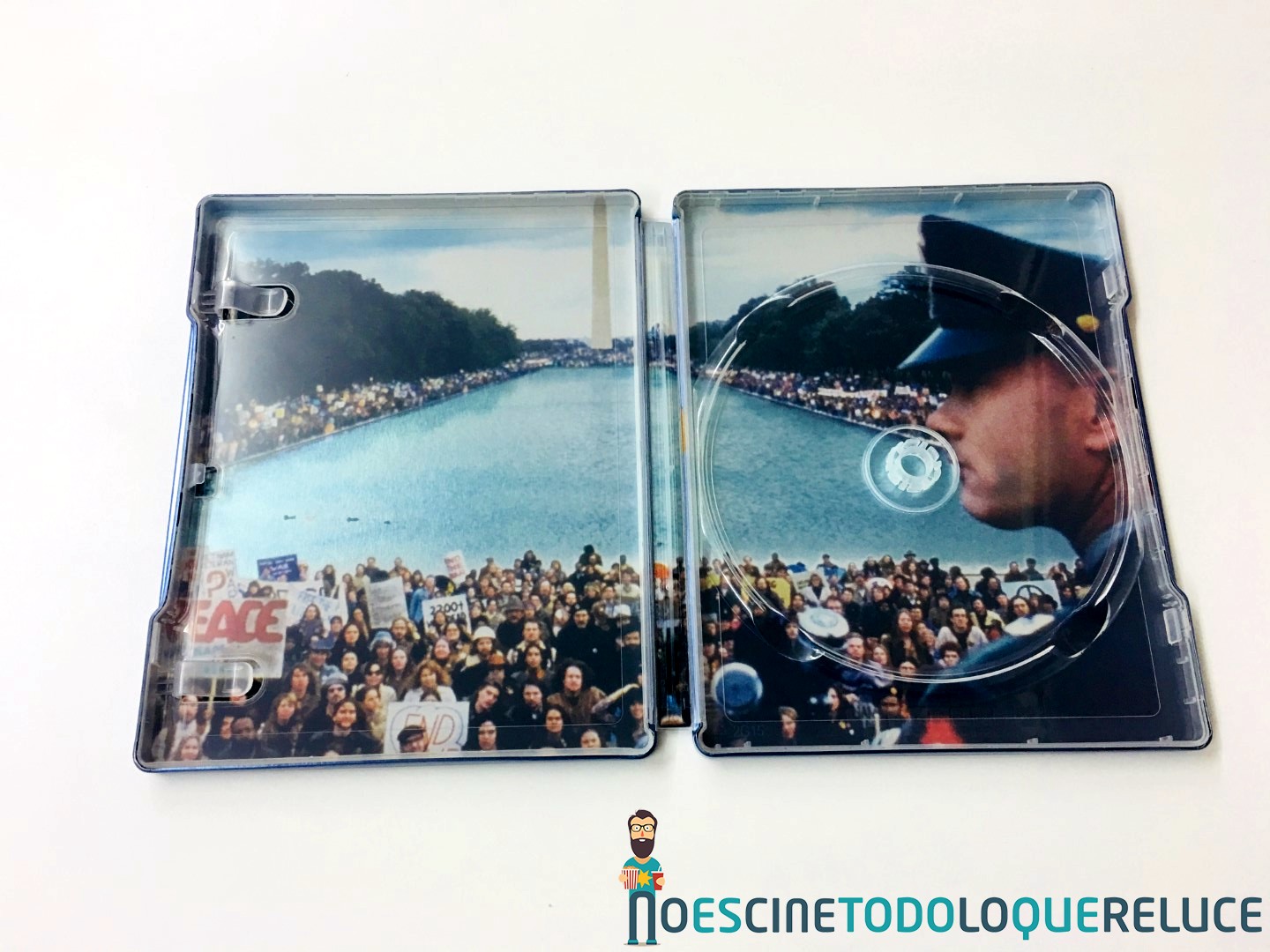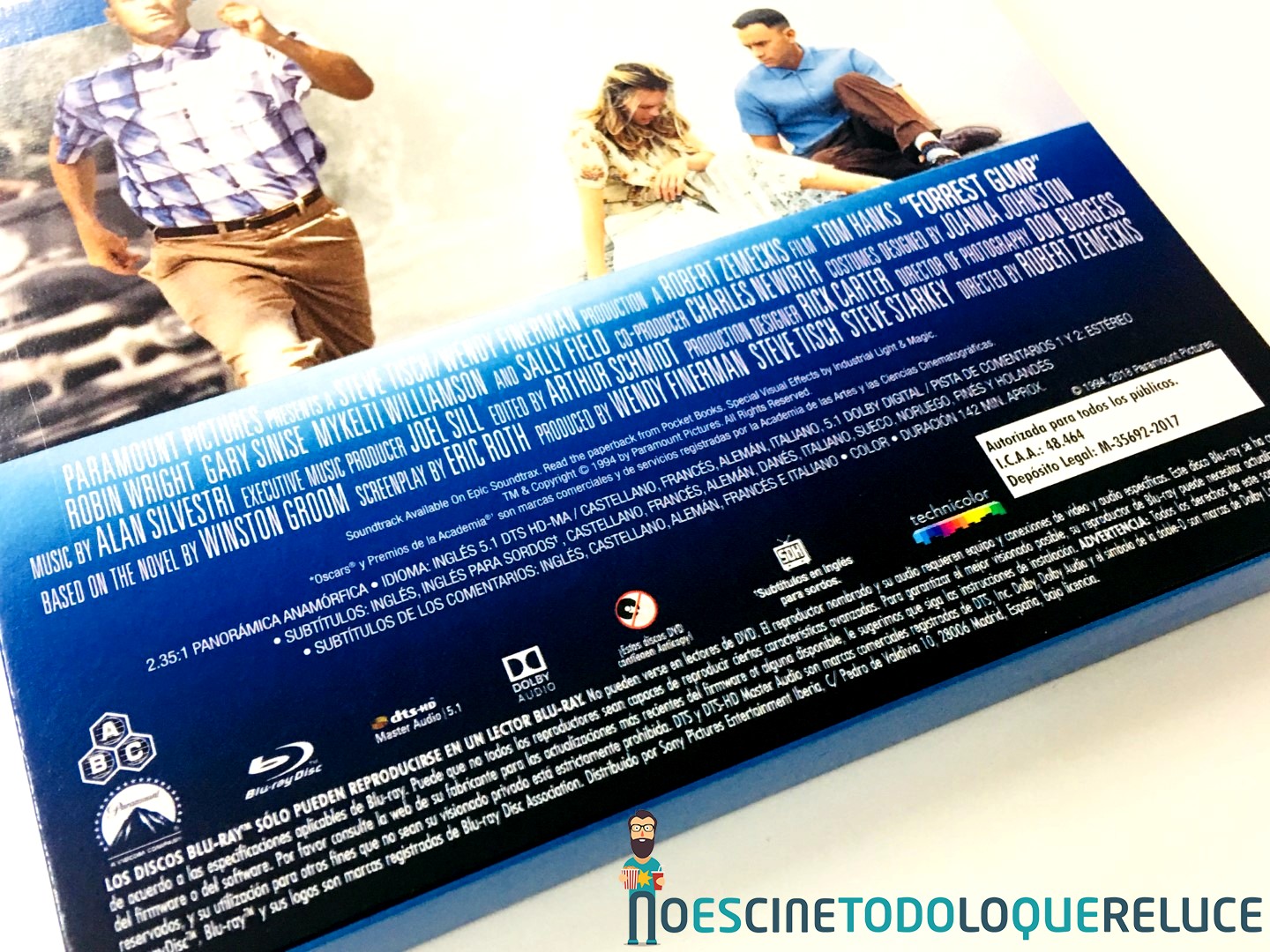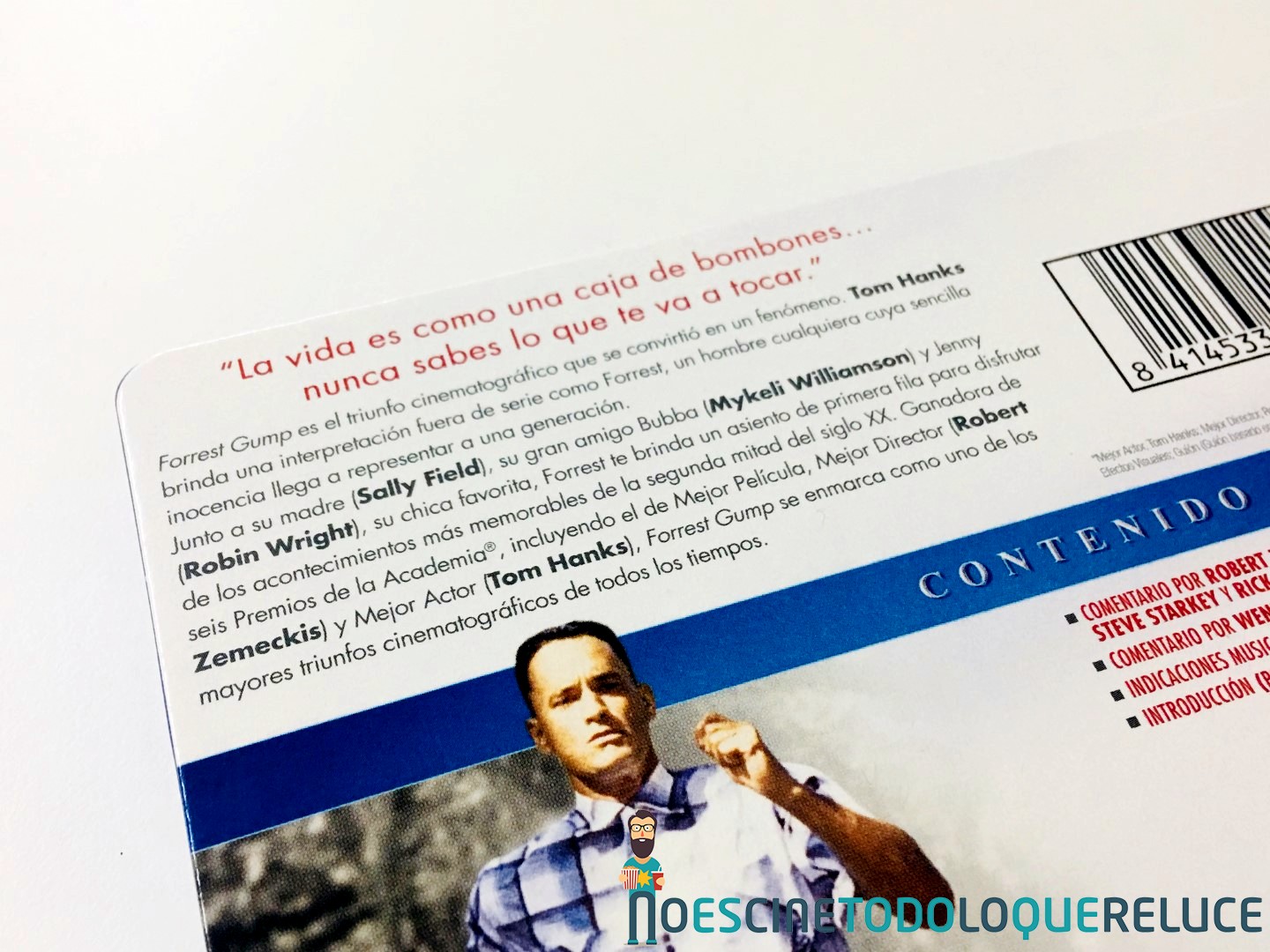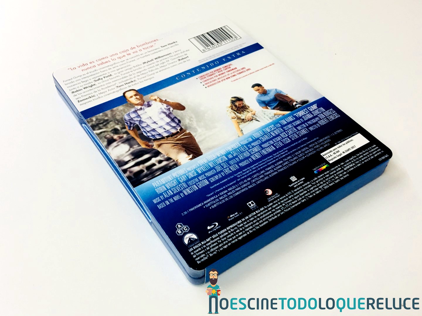 El steelbook en cuestión que analizamos destaca por el tono azul que acapara todo su exterior, e incluye en su portada una representativa imagen de la película, con Forrest sentado en un banco, mientras que la contraportada nos ofrece la simbólica imagen de una caja de bombones. Tanto la portada como el lomo incluyen el título de la película, y en el interior nos encontramos con un fotograma de Forrest Gump abarcando ambos lados, donde también encontramos el disco Blu-ray que tan sólo incluye el título de la película y los datos correspondientes a las recomendaciones de edad para cada país en el que se distribuye este disco. Todas las especificaciones y detalles de la película, así como algunas fotografías, vienen en el cartón que va pegado a la caja metálica, el cual no deja rastro en el steelbook una vez despegado.