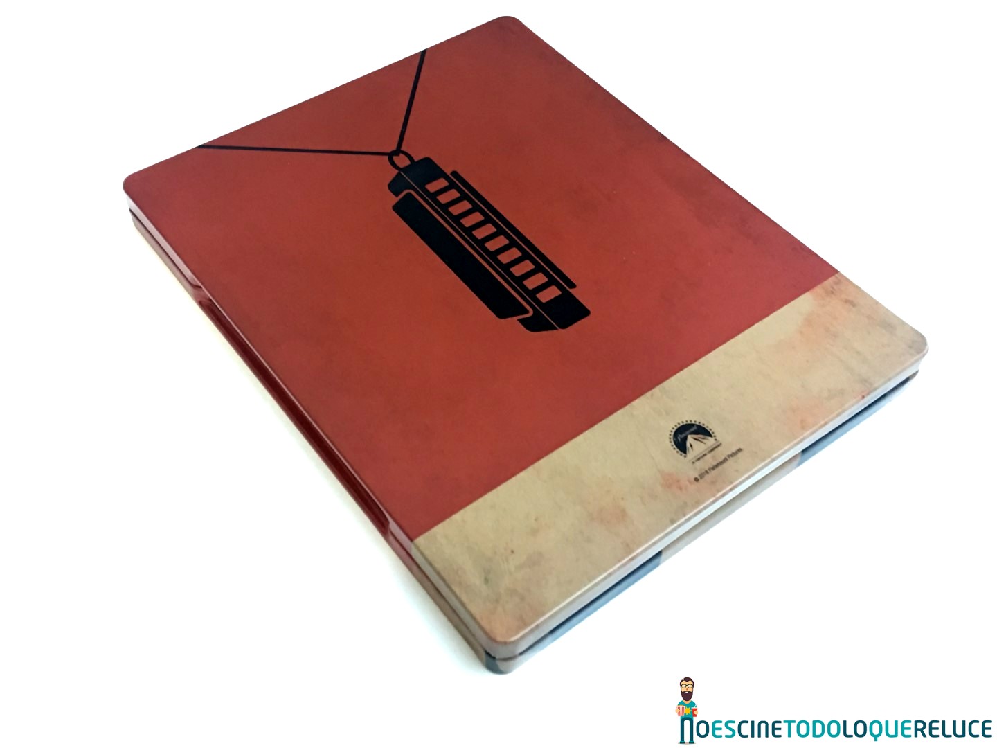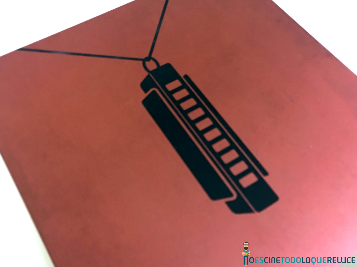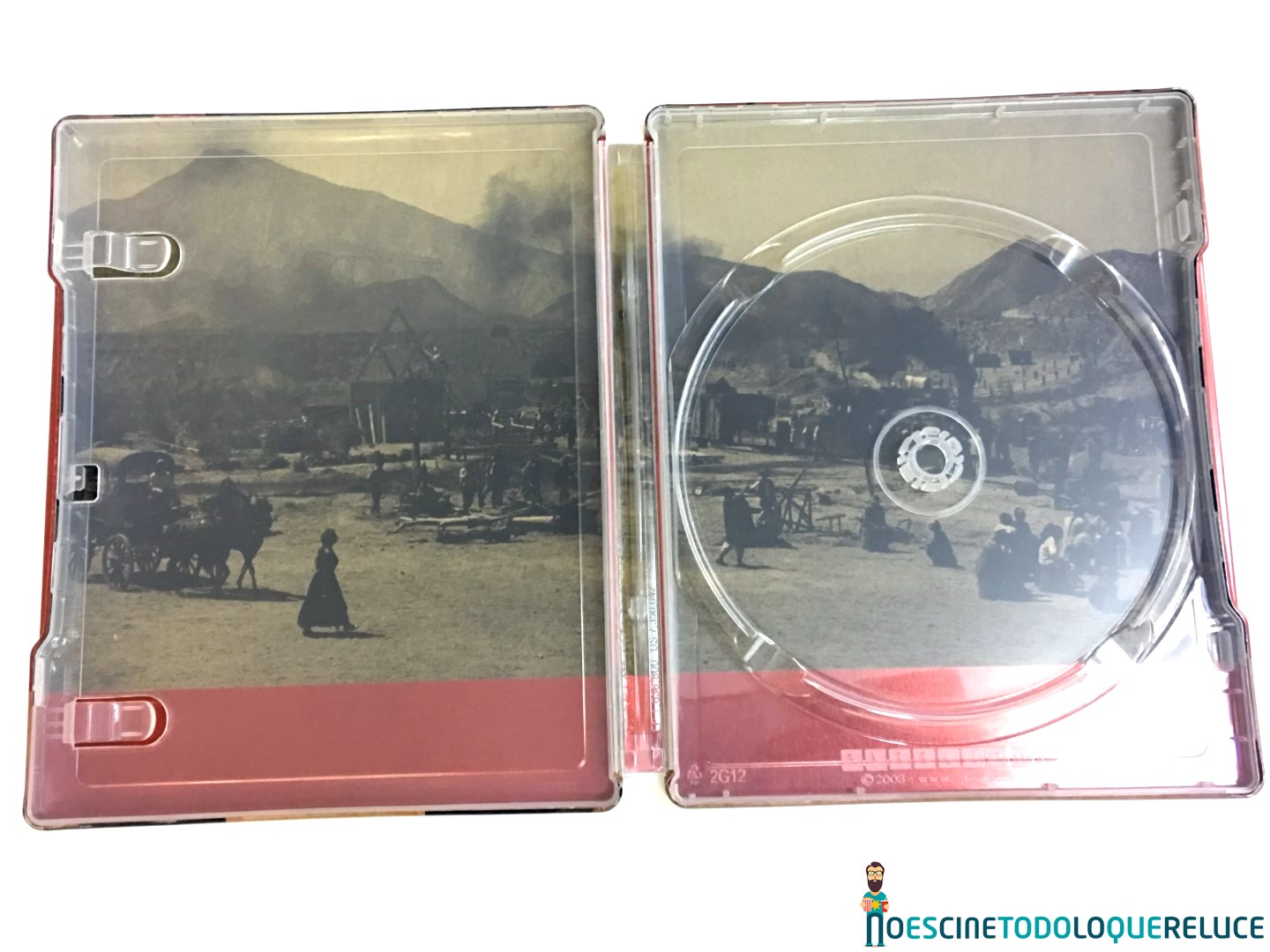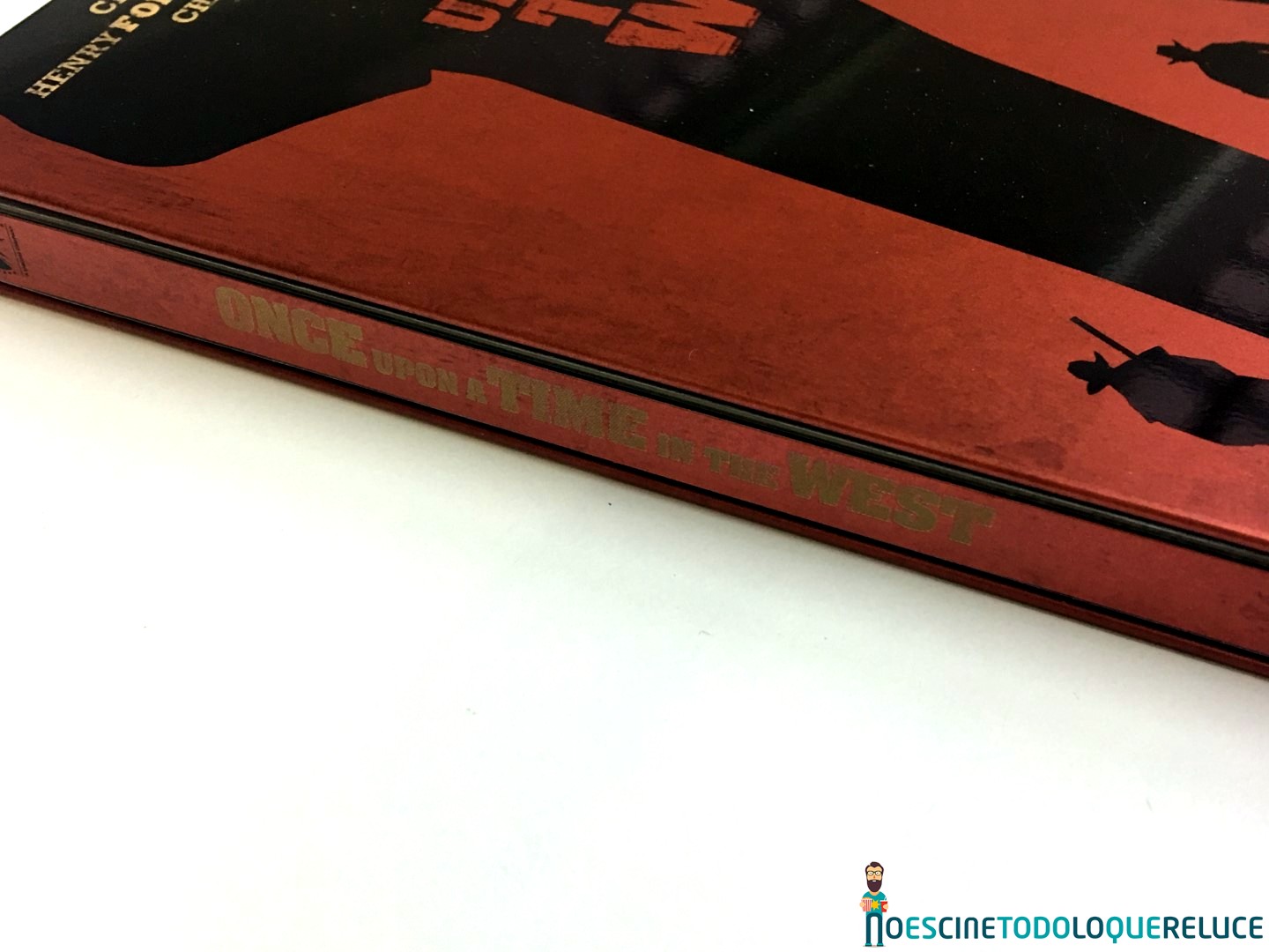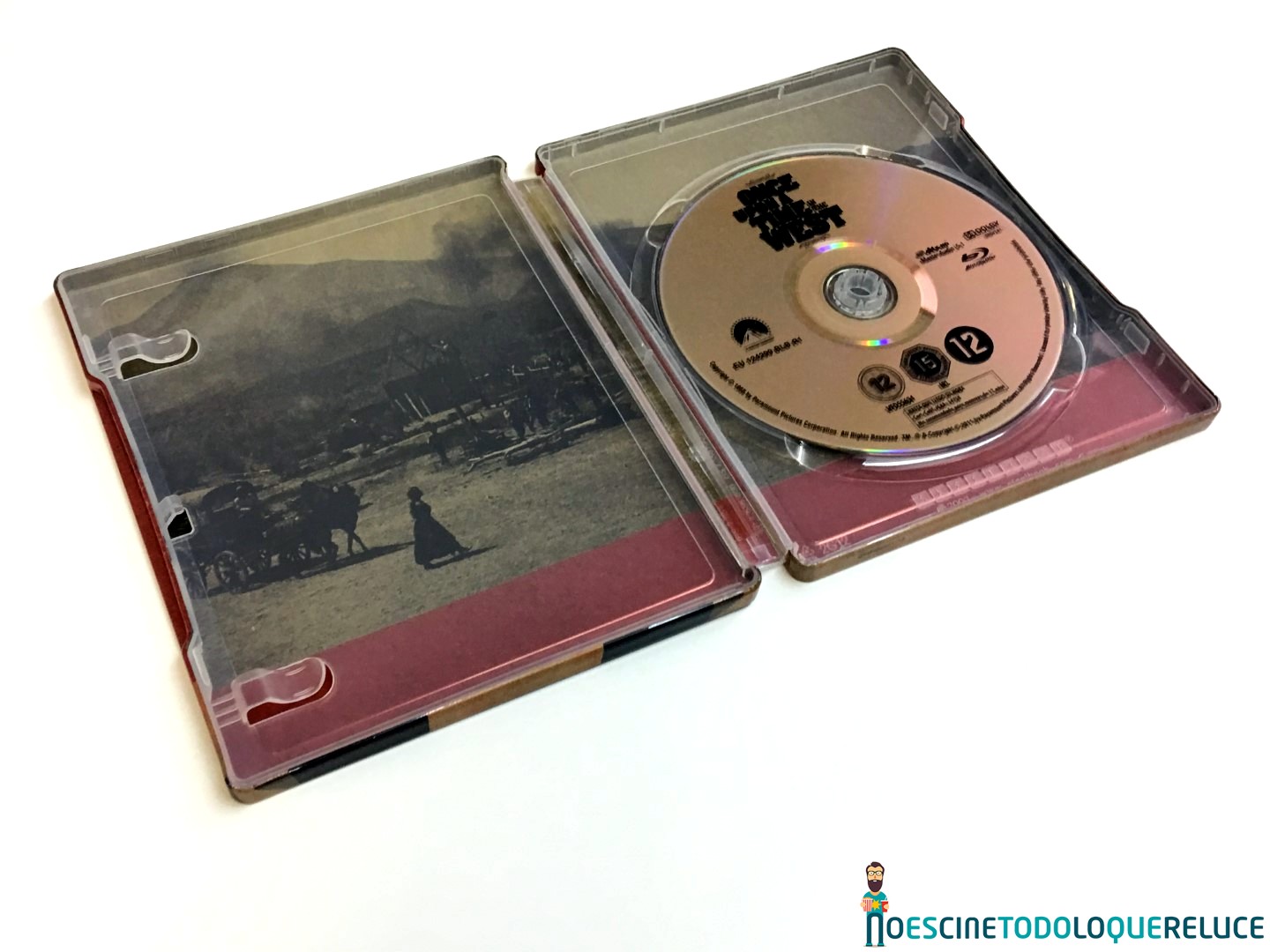 El steelbook en cuestión que analizamos destaca por el tono rojo que acapara todo su exterior, e incluye en su portada una representativa ilustración de uno de los enfrentamientos que vemos en la película, mientras que la contraportada nos ofrece un dibujo de un colgante con una armónica. Tanto la portada como el lomo incluyen el título de la película en versión original, y en el interior nos encontramos con un fotograma de Hasta que llegó su hora abarcando ambos lados, donde también encontramos el disco Blu-ray que tan sólo incluye serigrafiado el título de la película en versión original y los datos correspondientes a las recomendaciones de edad para cada país en el que se distribuye este disco. Todas las especificaciones y detalles de la película, así como una fotografía en tonos rojos, vienen en el cartón que va pegado a la caja metálica, el cual no deja rastro en el steelbook una vez despegado, e incluye el título en español para que sea apreciable en la portada.