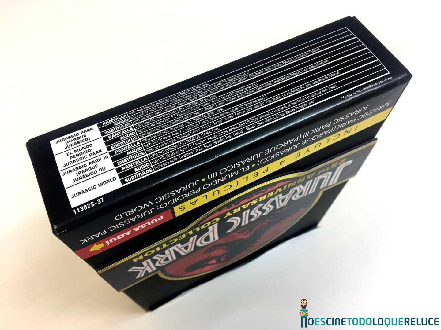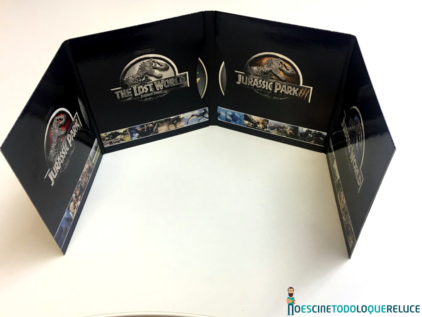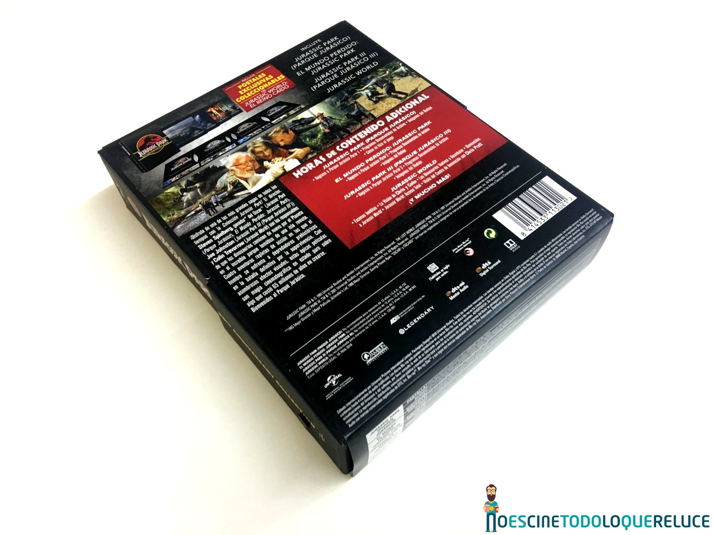 La edición coleccionista en Blu-ray está presentada en un estuche rígido negro, con un tacto rugoso, y el emblemático logo de la franquicia en su portada, y con un peculiar botón lateral que nos permite disfrutar del tema central de Parque Jurásico, tal y como podéis escuchar en el vídeo que os dejamos a continuación. En el interior del estuche, que se abre por la mitad, nos encontramos con un digipack que alberga las cuatro primeras entregas en Blu-ray (Parque Jurásico, Jurassic Park: el mundo perdido, Parque Jurásico III y Jurassic World), además de postales coleccionables de Jurassic World: El reino caído. Todos los datos técnicos, sinopsis, extras y algunas fotos están incluidas en un papel pegado al estuche.