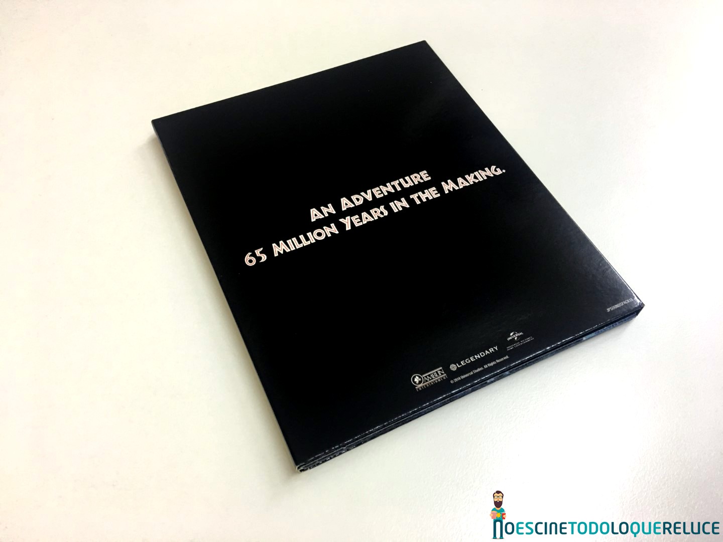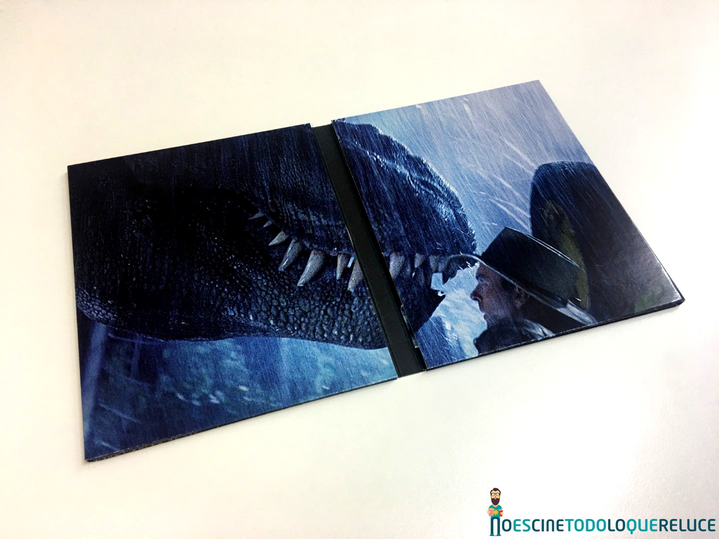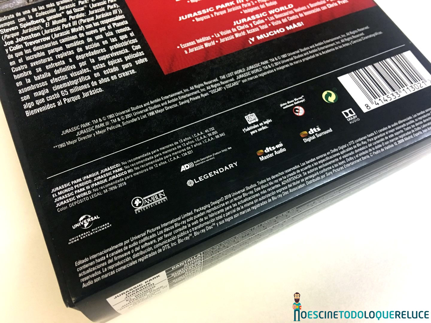La edición coleccionista en Blu-ray está presentada en un estuche rígido negro, con un tacto rugoso, y el emblemático logo de la franquicia en su portada, y con un peculiar botón lateral que nos permite disfrutar del tema central de Parque Jurásico, tal y como podéis escuchar en el vídeo que os dejamos a continuación. En el interior del estuche, que se abre por la mitad, nos encontramos con un digipack que alberga las cuatro primeras entregas en Blu-ray (Parque Jurásico, Jurassic Park: el mundo perdido, Parque Jurásico III y Jurassic World), además de postales coleccionables de Jurassic World: El reino caído. Todos los datos técnicos, sinopsis, extras y algunas fotos están incluidas en un papel pegado al estuche.