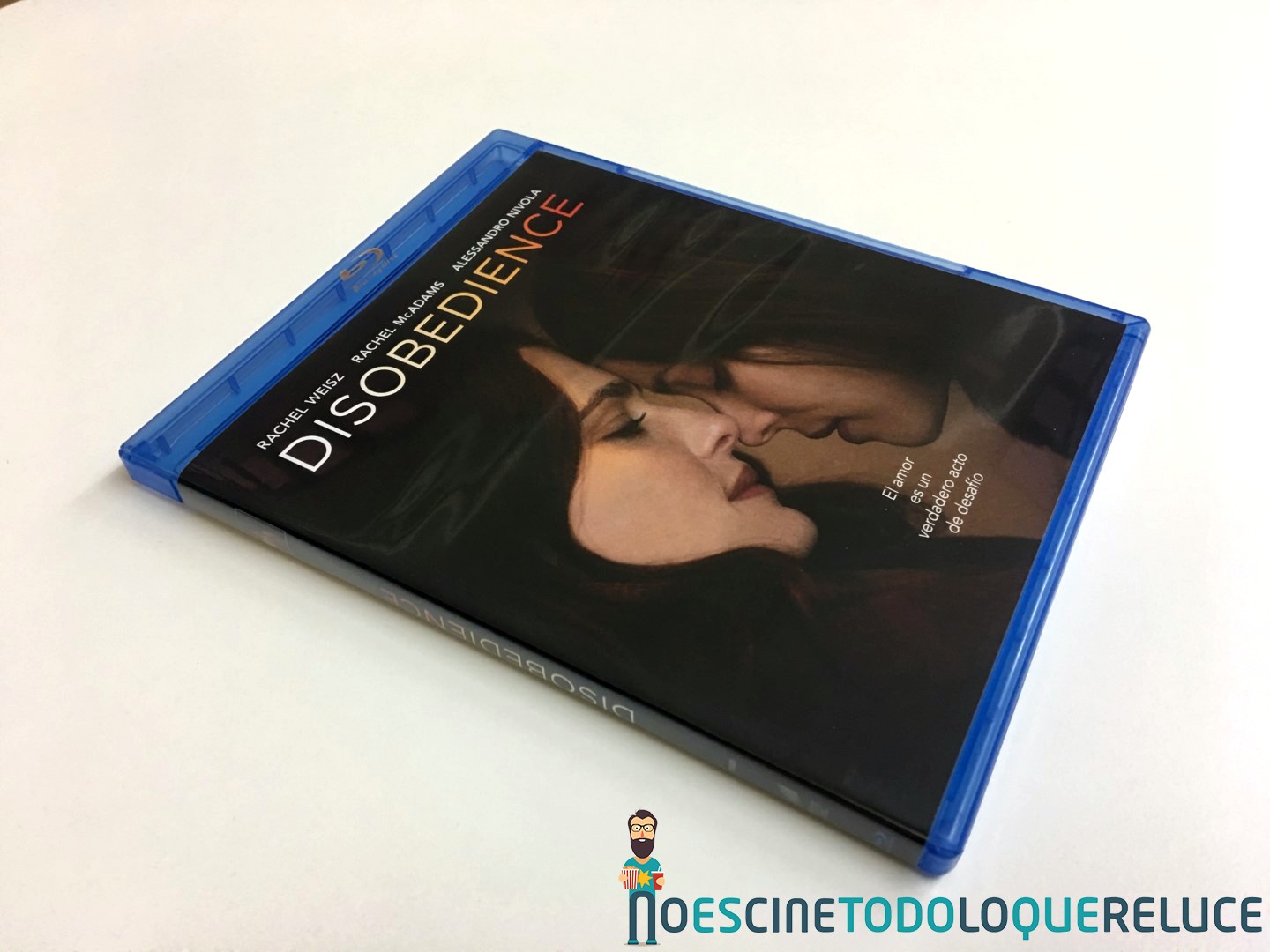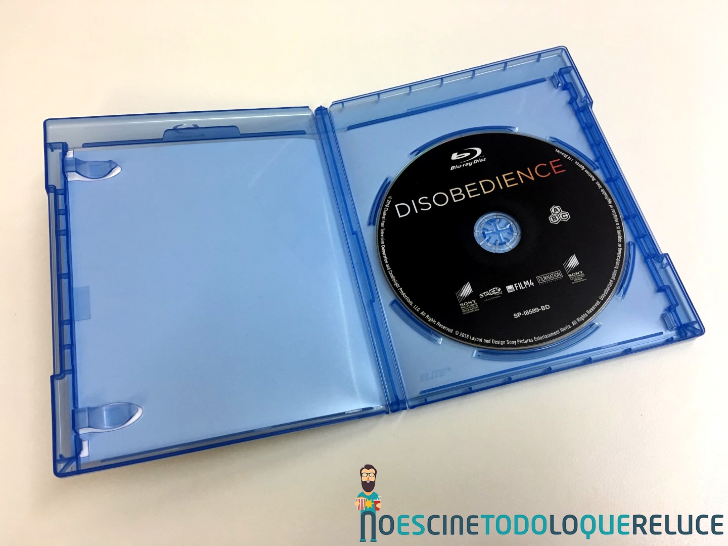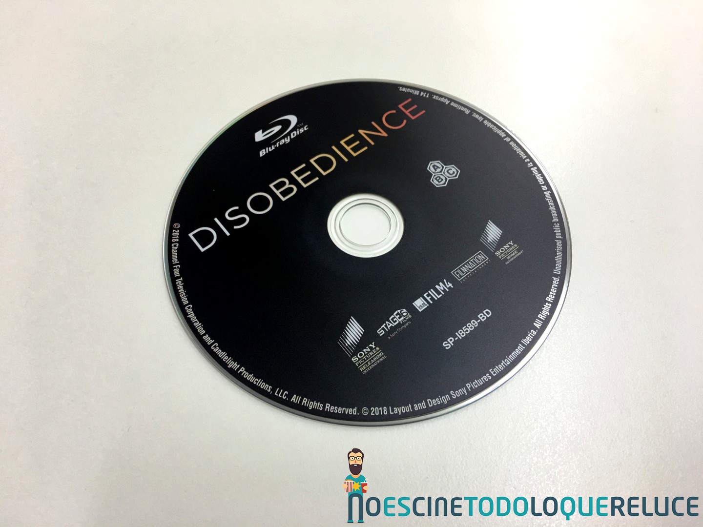 La edición Blu-ray de Disobedience está presentada en un estuche amaray azul, habitual de este formato, con el póster de la película en la portada, mientras que la contraportada nos muestra los datos técnicos, artísticos y sinopsis además de una selección de imágenes de la película. El disco Blu-ray está serigrafiado con el título sobre un fondo negro.
