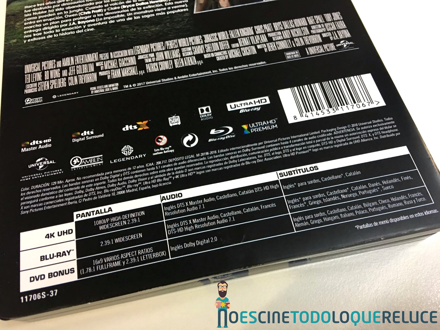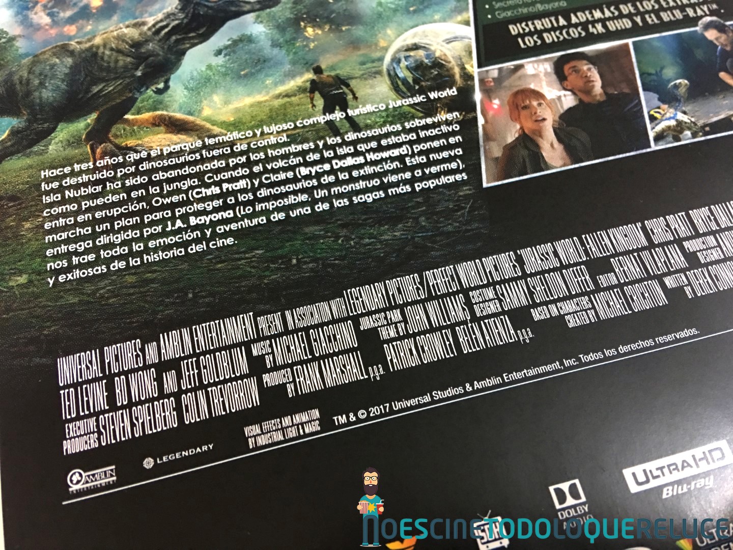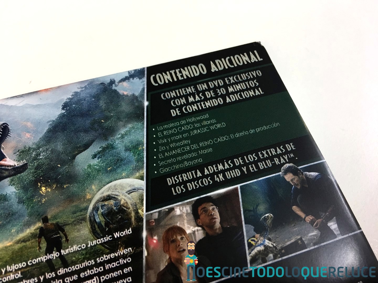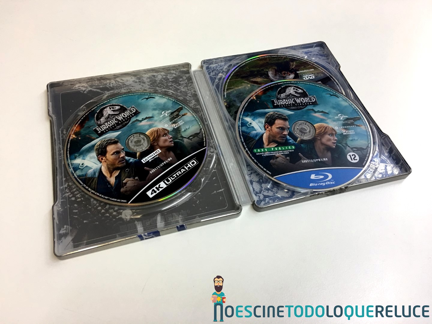 La edición de Jurassic World: el reino caído que aquí comentamos incluye un disco 4K UHD y un Blu-ray, ambos con una relación de aspecto de 2.39:1, es decir, que tenemos las típicas franjas negras superior e inferior y se disfruta tal y como se vio en los cines. A nivel sonoro, los dos discos incluyen la versión original en Inglés DTS X Master Audio, mientras que otras pistas, entre las que se encuentra la correspondiente al Castellano, están en DTS-HD High Resolution Audio 7.1, e incluyen multitud de subtítulos.