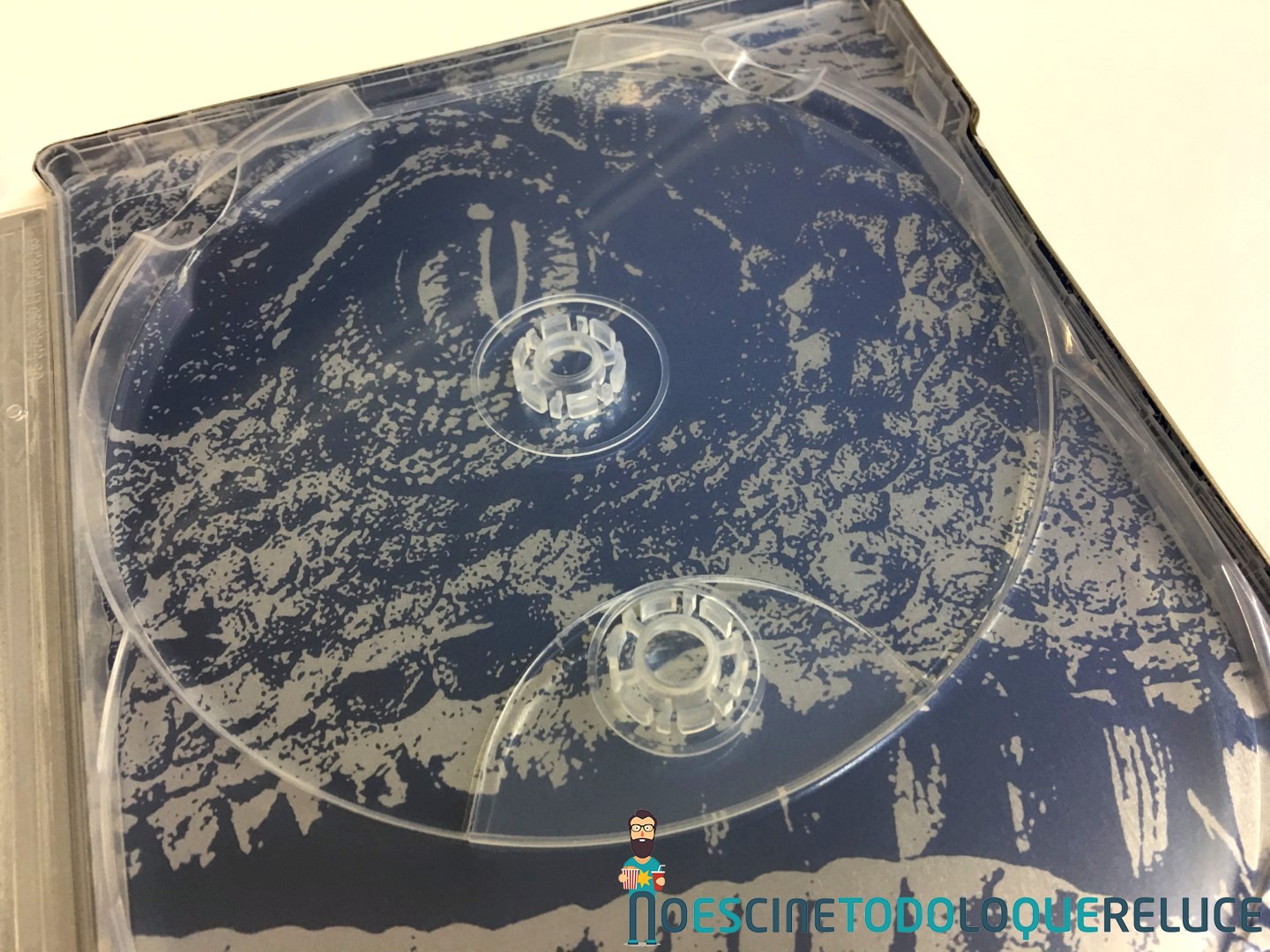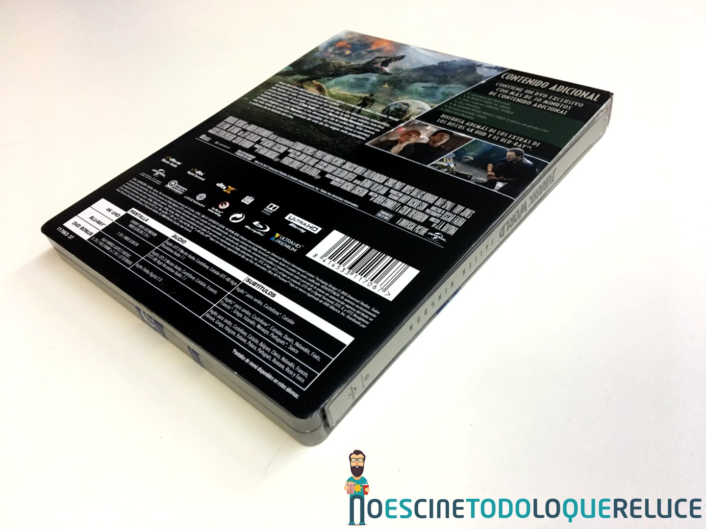 Esta edición Steelbook en formato 4K UHD + Blu-ray de Jurassic World: el reino caído está presentada en un estuche metálico satinado con un llamativo diseño en el que tenemos, sobre un fondo plateado, las ilustraciones de dos de los dinosaurios más importantes de la saga, uno en portada y otro en contraportada. En el interior nos encontramos en cada lado con una mirada más cercana de ambos dinosaurios, y es donde alberga los tres discos de la edición: 4K UHD, Blu-ray y disco DVD de extras, todos ellos serigrafiados con el título en versión original, una imagen de los protagonistas en el caso de los discos con la película, y una escena de la película en el disco DVD. En el papel pegado (de fácil despegado) al steelbook es donde nos ofrecen el título en español en portada, mientras que la contraportada nos muestra los datos técnicos, artísticos y sinopsis además de una selección de imágenes de la película.