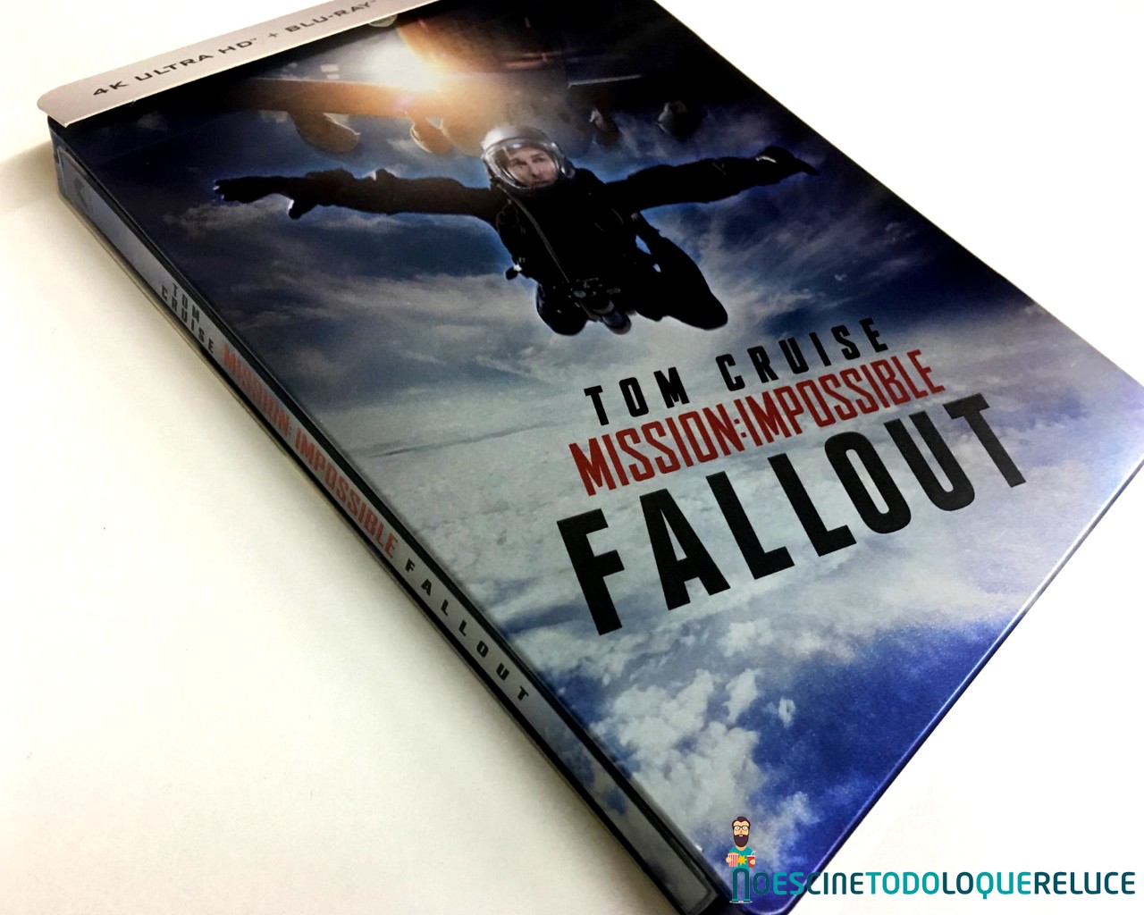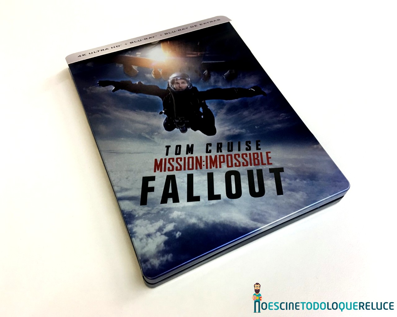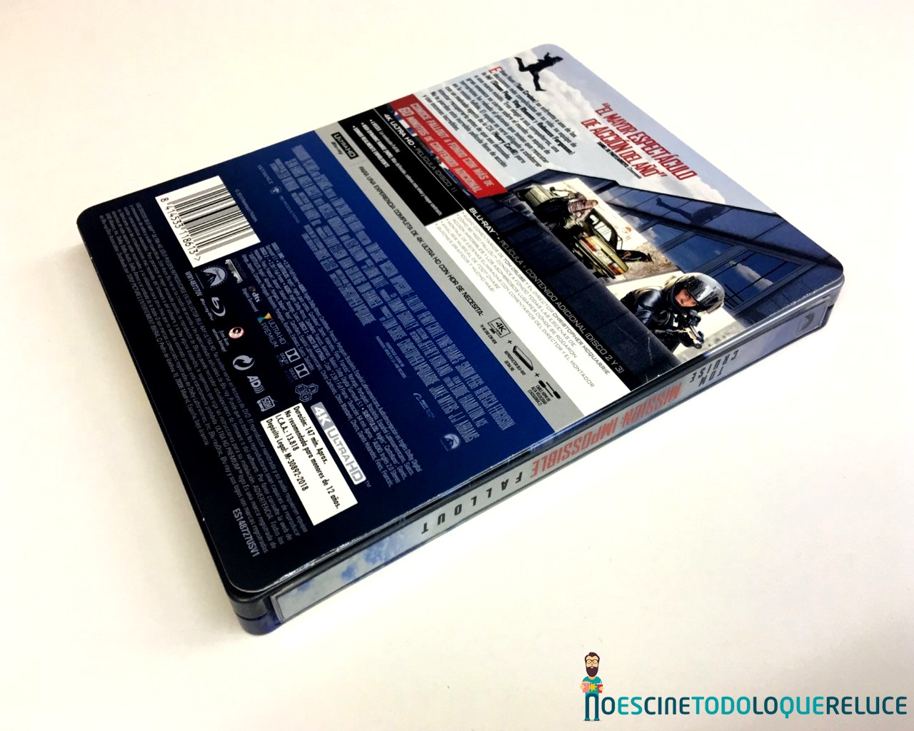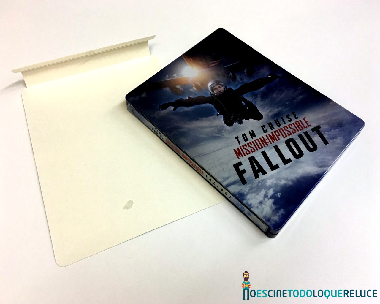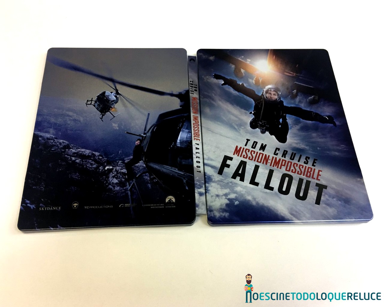 Esta edición Steelbook en formato 4K UHD + Blu-ray + Bonus Blu-ray de Misión: Imposible – Fallout está presentada en un estuche metálico satinado con una impactante escena aérea en la portada, mientras que la contraportada nos muestra otra de las escenas más épicas de esta entrega, la correspondiente al helicóptero. En el interior nos encontramos con una escena de Tom Cruise en acción, y es donde alberga los tres discos de la edición: 4K UHD, Blu-ray y disco Blu-ray de extras, todos ellos serigrafiados con tan sólo con el título en versión original de la película y datos de edades. Volviendo al exterior, en el cartón pegado (de fácil despegado gracias a los dos puntitos de silicona usados) al steelbook es donde nos ofrecen el título en español en el lomo superior, junto con los discos que incluye, mientras que la contraportada nos muestra los datos técnicos, artísticos y sinopsis además de unas fotografías de la película.