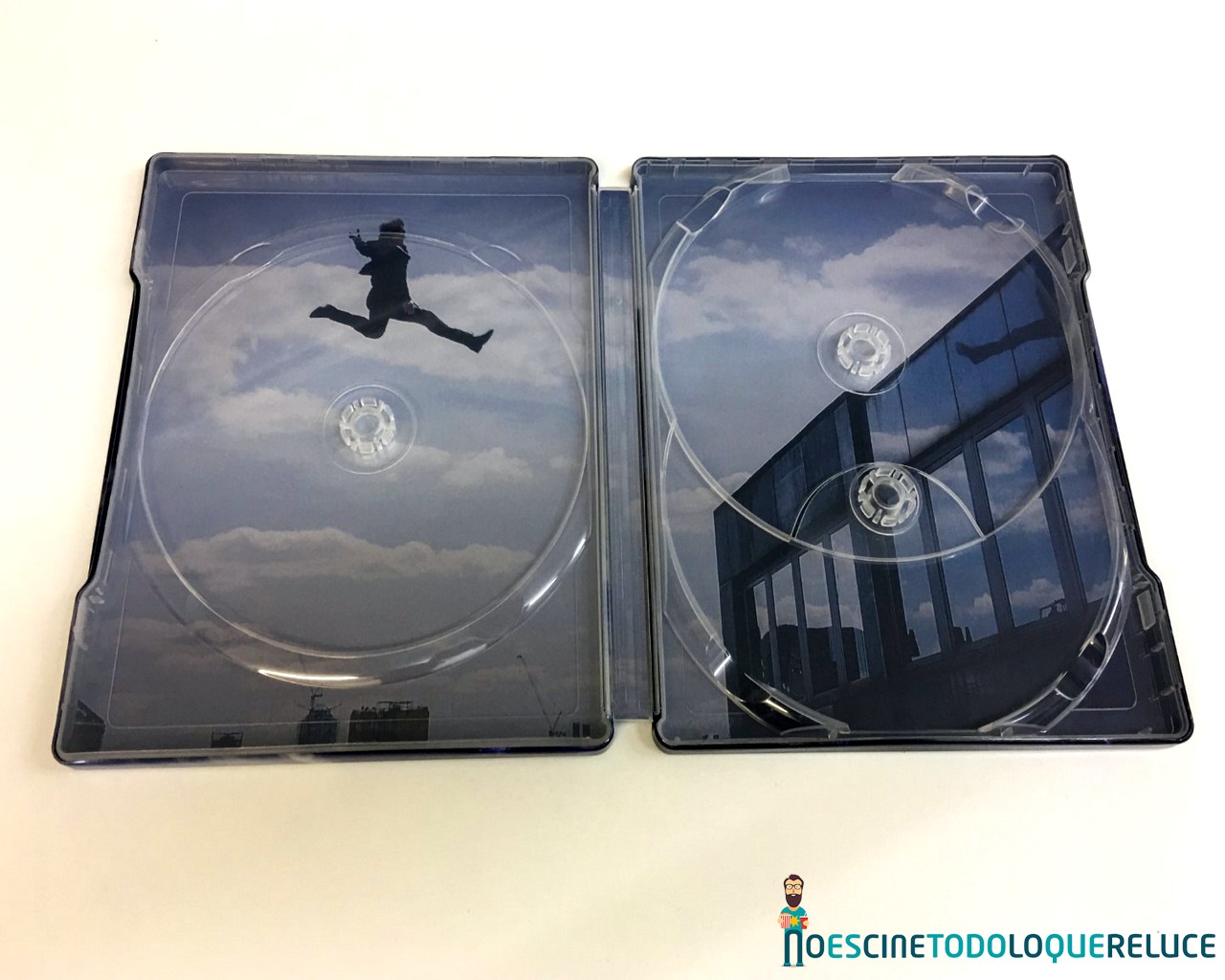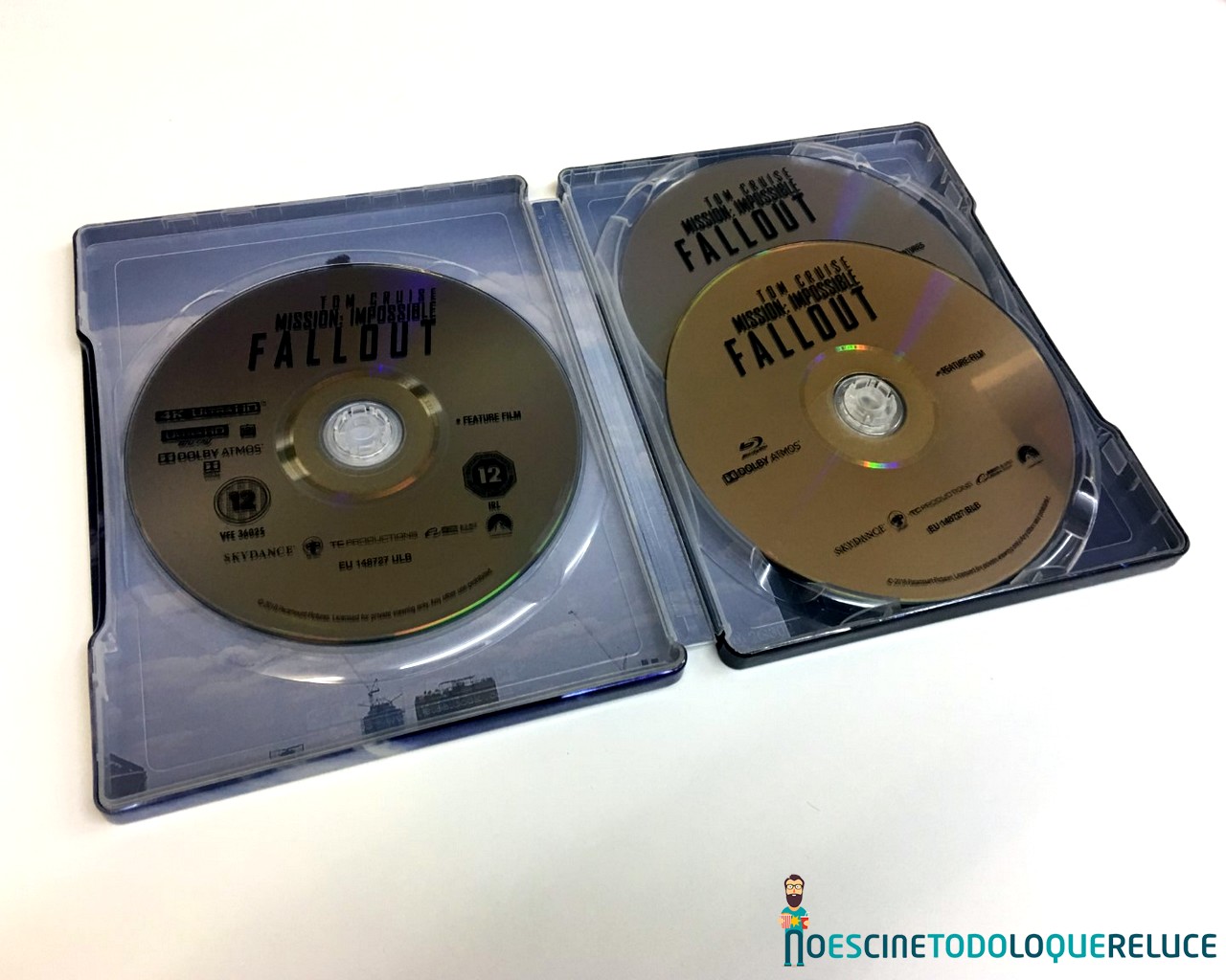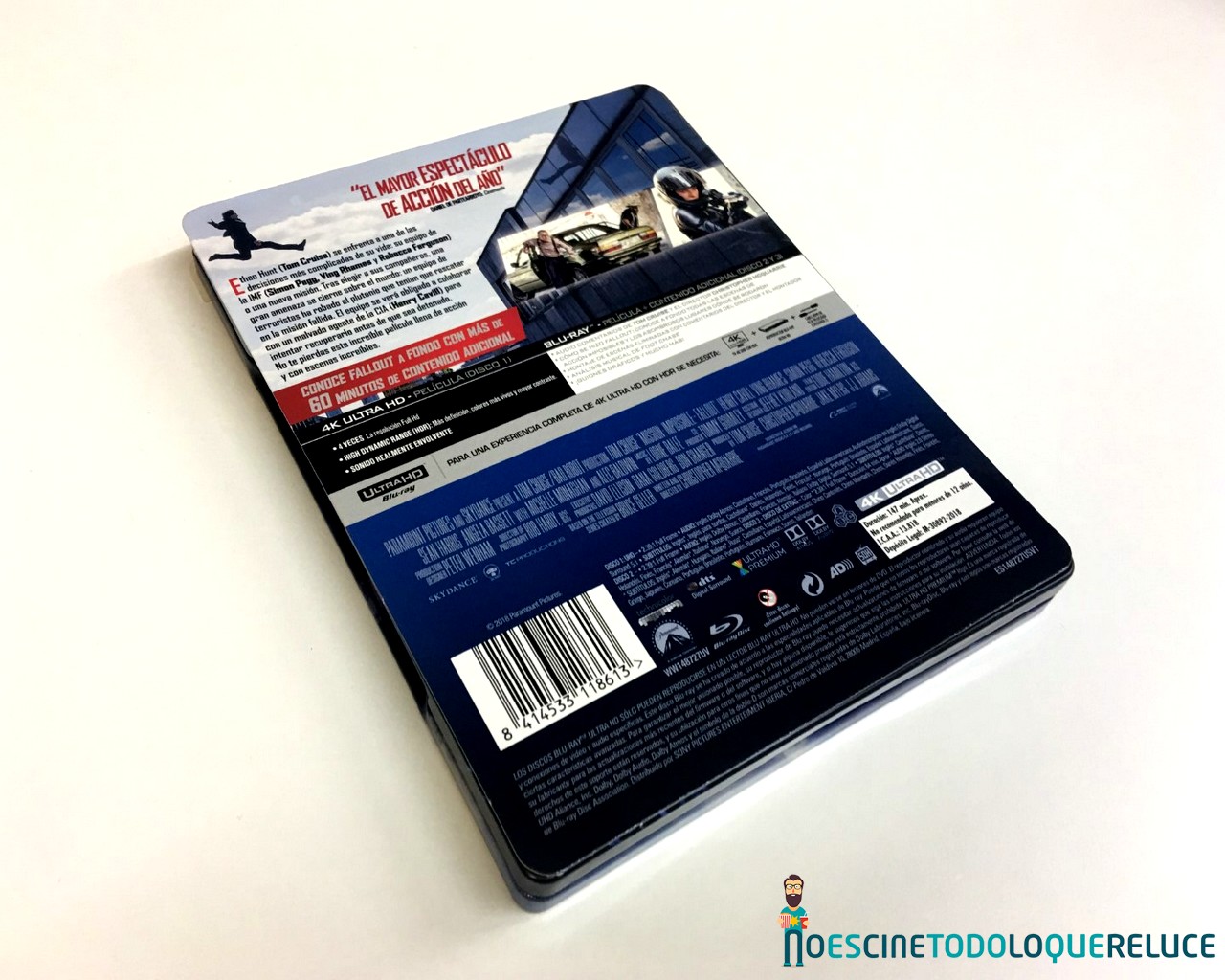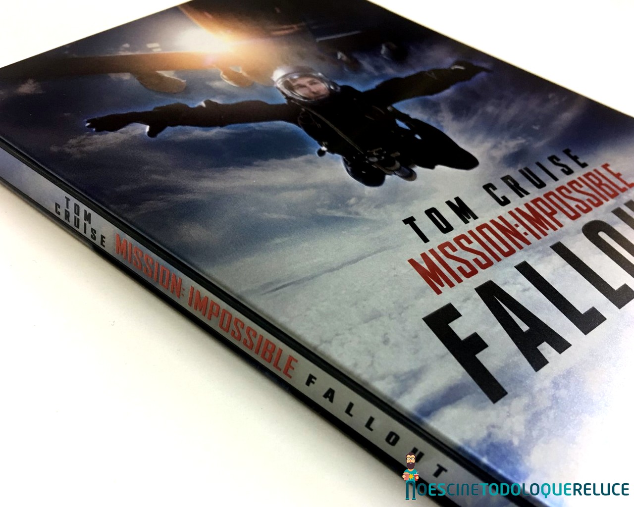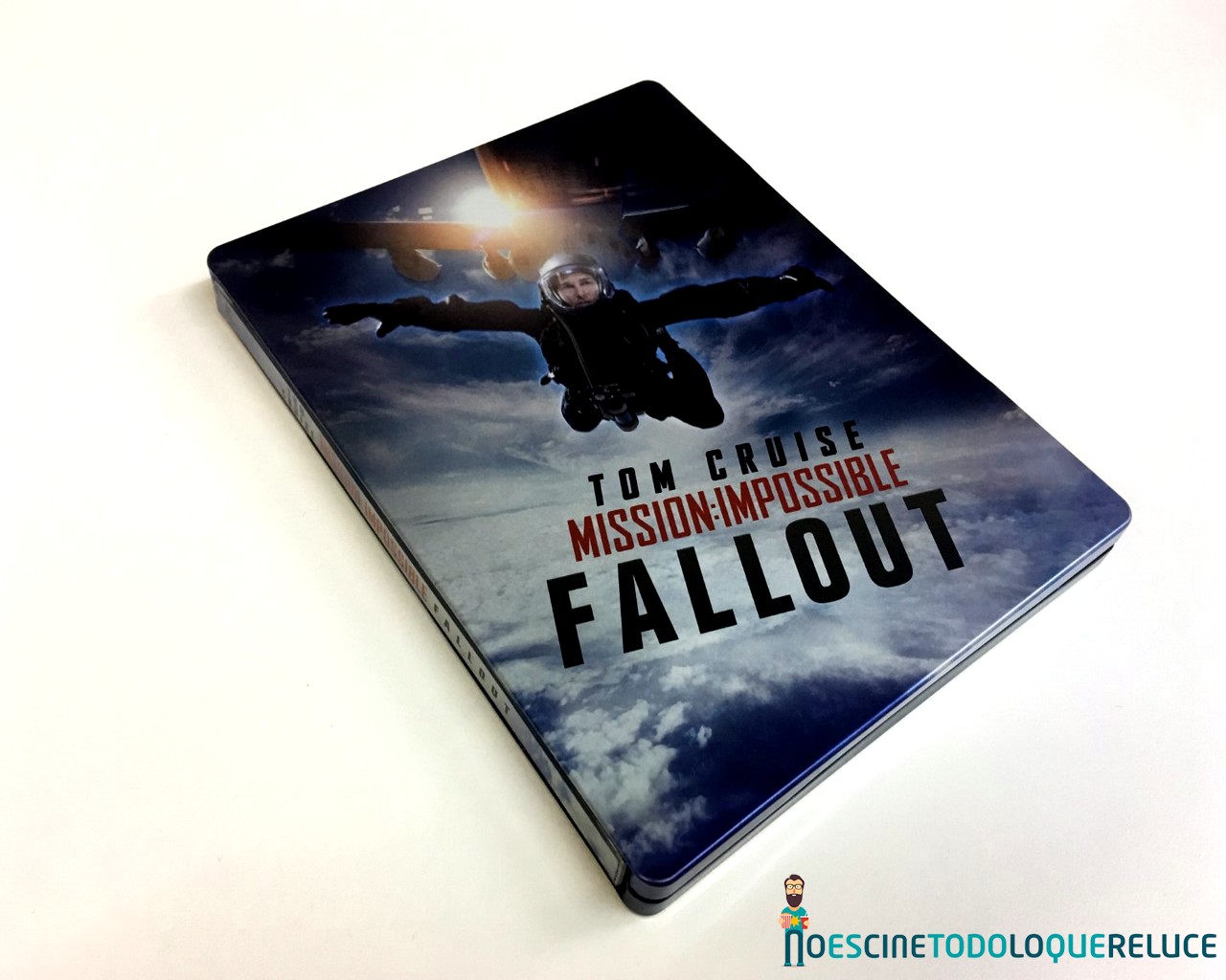 Esta edición Steelbook en formato 4K UHD + Blu-ray + Bonus Blu-ray de Misión: Imposible – Fallout está presentada en un estuche metálico satinado con una impactante escena aérea en la portada, mientras que la contraportada nos muestra otra de las escenas más épicas de esta entrega, la correspondiente al helicóptero. En el interior nos encontramos con una escena de Tom Cruise en acción, y es donde alberga los tres discos de la edición: 4K UHD, Blu-ray y disco Blu-ray de extras, todos ellos serigrafiados con tan sólo con el título en versión original de la película y datos de edades. Volviendo al exterior, en el cartón pegado (de fácil despegado gracias a los dos puntitos de silicona usados) al steelbook es donde nos ofrecen el título en español en el lomo superior, junto con los discos que incluye, mientras que la contraportada nos muestra los datos técnicos, artísticos y sinopsis además de unas fotografías de la película.