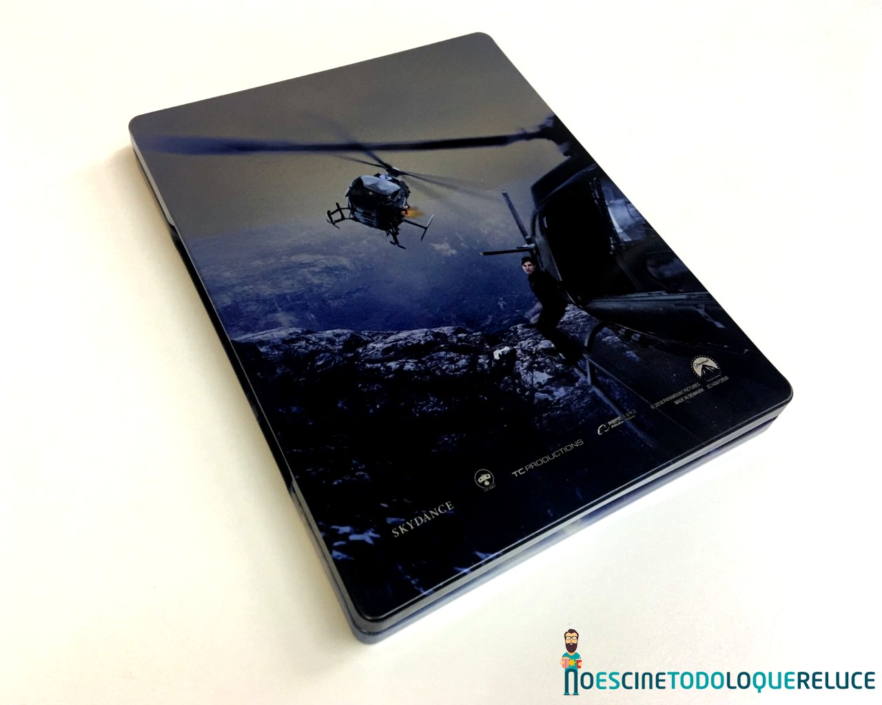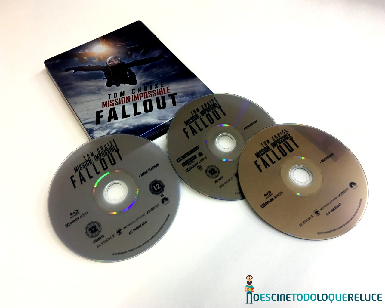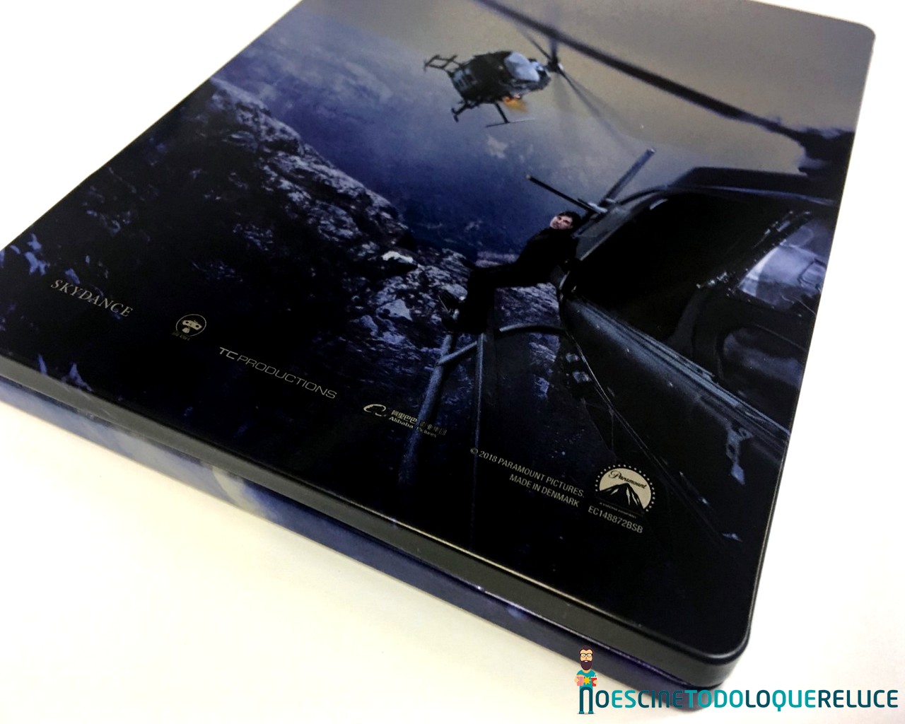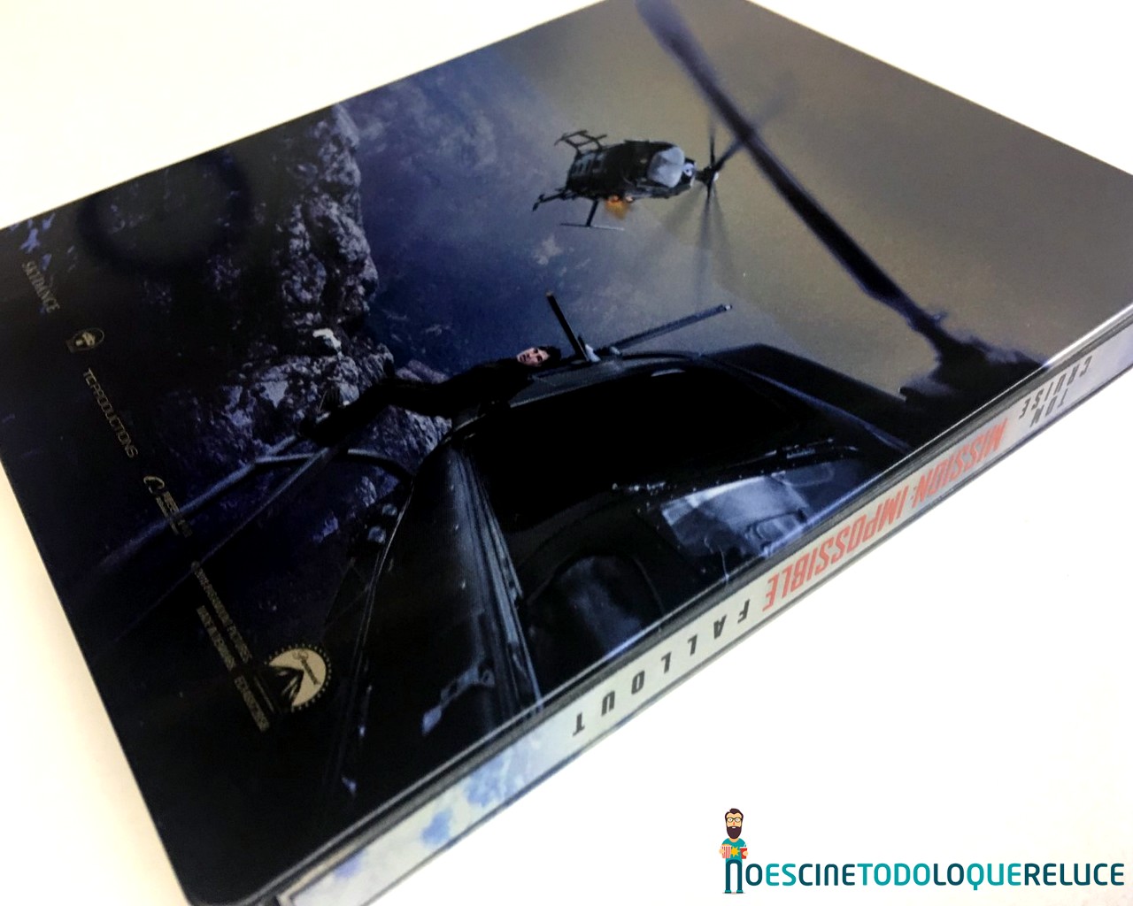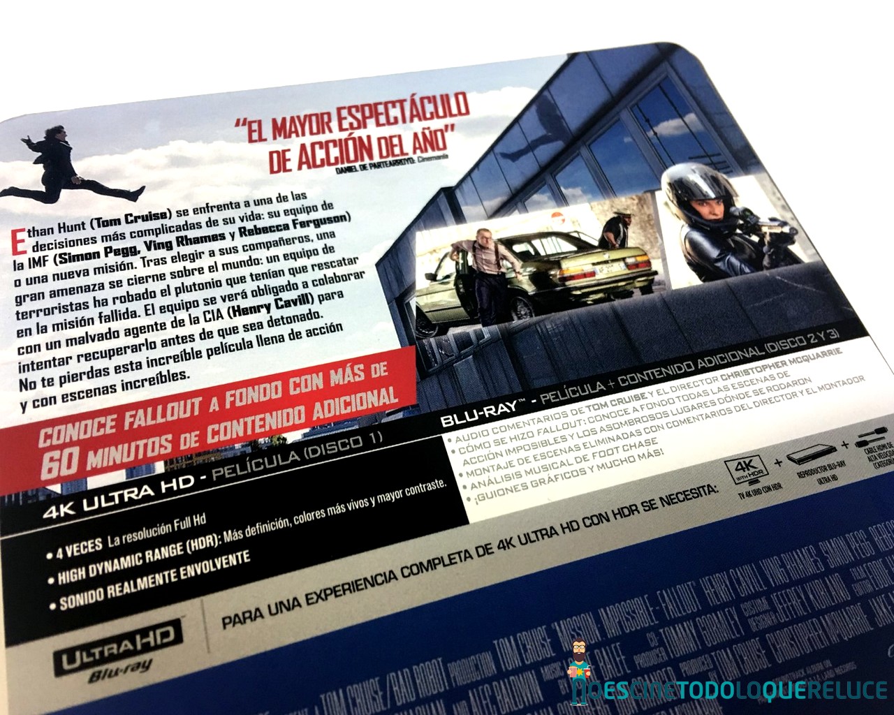 Esta edición Steelbook en formato 4K UHD + Blu-ray + Bonus Blu-ray de Misión: Imposible – Fallout está presentada en un estuche metálico satinado con una impactante escena aérea en la portada, mientras que la contraportada nos muestra otra de las escenas más épicas de esta entrega, la correspondiente al helicóptero. En el interior nos encontramos con una escena de Tom Cruise en acción, y es donde alberga los tres discos de la edición: 4K UHD, Blu-ray y disco Blu-ray de extras, todos ellos serigrafiados con tan sólo con el título en versión original de la película y datos de edades. Volviendo al exterior, en el cartón pegado (de fácil despegado gracias a los dos puntitos de silicona usados) al steelbook es donde nos ofrecen el título en español en el lomo superior, junto con los discos que incluye, mientras que la contraportada nos muestra los datos técnicos, artísticos y sinopsis además de unas fotografías de la película.