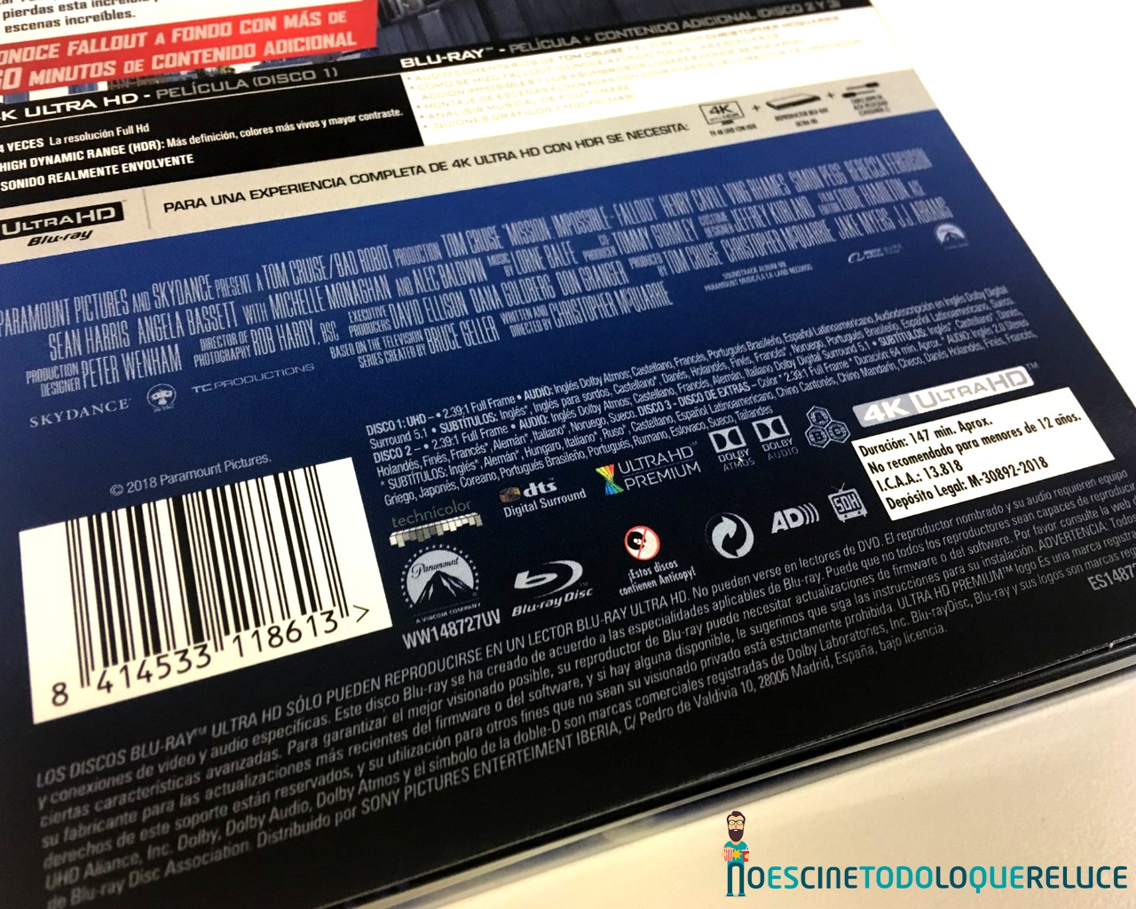 - Audio: Inglés Dolby Atmos; Alemán, Castellano, Francés, e Italiano Dolby Digital 5.1; Comentario del director, Christopher McQuarrie, y Tom Cruise; Comentario del director, Christopher McQuarrie, y del montador, Eddie Hamilton; Comentario del compositor, Lorne Balfe; Solo Banda Sonora.
