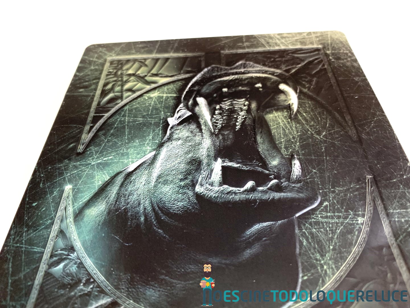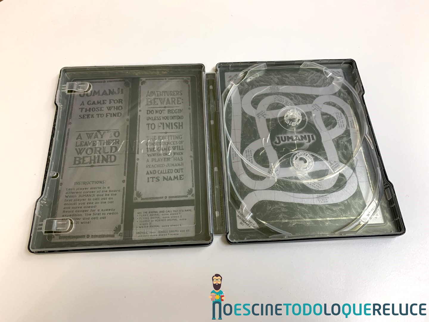 La edición metálica limitada del Pack con Jumanji y Jumanji: Bienvenidos a la jungla que ha salido en Blu-ray destaca por los relieves en portada y contraportada, y por su original diseño. Mientras que la portada nos ofrece una representativa ilustración de la saga, con el título en relieve, la contraportada la acapara un hipopótamo en relieve a juego con el frontal. En el lomo nos encontramos el título de la saga, y en el interior tenemos la ilustración del tablero donde alberga los dos discos Blu-ray, uno por película, y ambos serigrafiados con los protagonistas de cada cinta y el título español. Tanto la sinopsis de cada película, como características técnicas y contenidos adicionales están en la hoja pegada al exterior del steelbook, con el título de ambas películas en la parte frontal. Este papel de datos técnicos es fácilmente despegable, y no deja rastro en el steelbook, al ir con dos adhesivos redondos pegados al frontal, como apreciáis en la galería de fotos inferior.