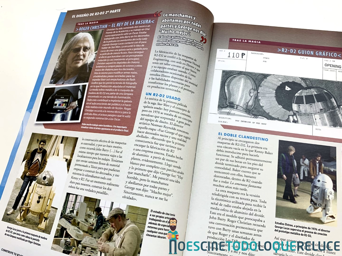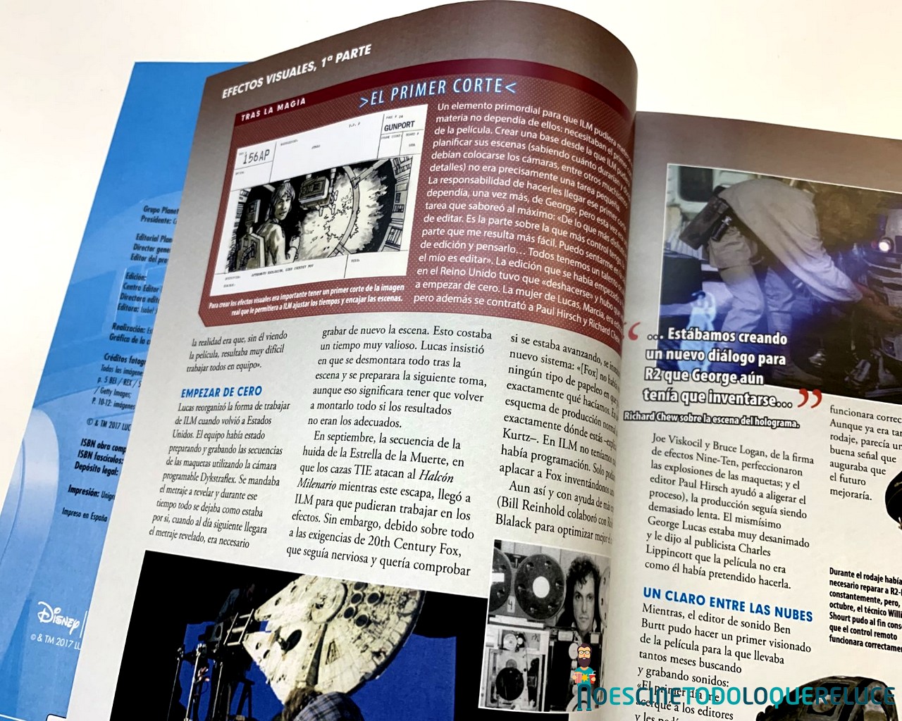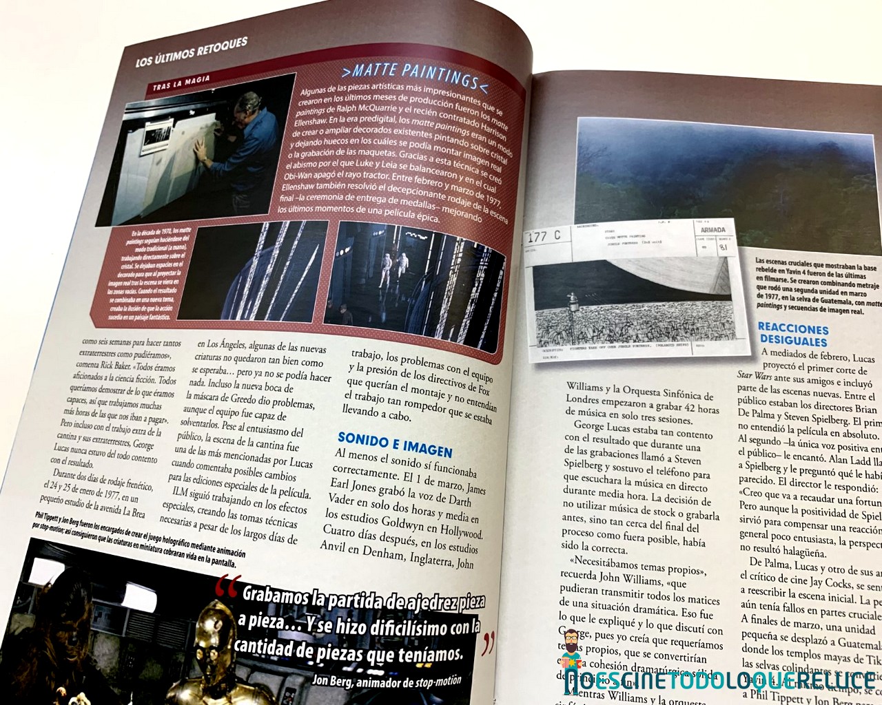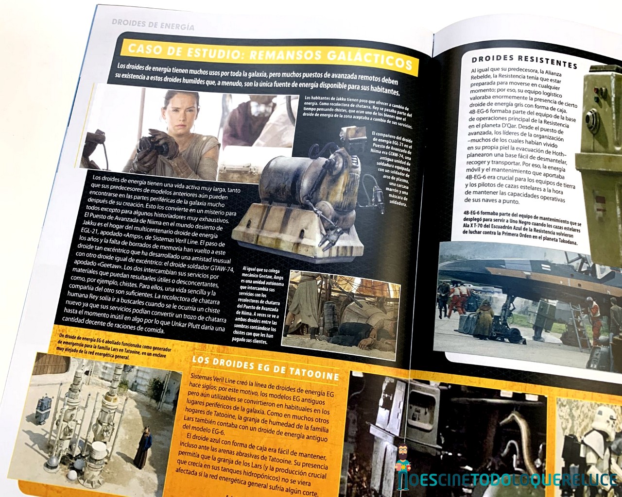 Esta fascinante sección nos permite mirar tras las cámaras para descubrir las técnicas empleadas en la construcción y grabación de los droides, naves, escenarios y criaturas de todas las películas de Star Wars. Explora su desarrollo desde sus primeros conceptos hasta las asombrosas maquetas finales, fotografiadas con todo lujo de detalles. - Guía de droides