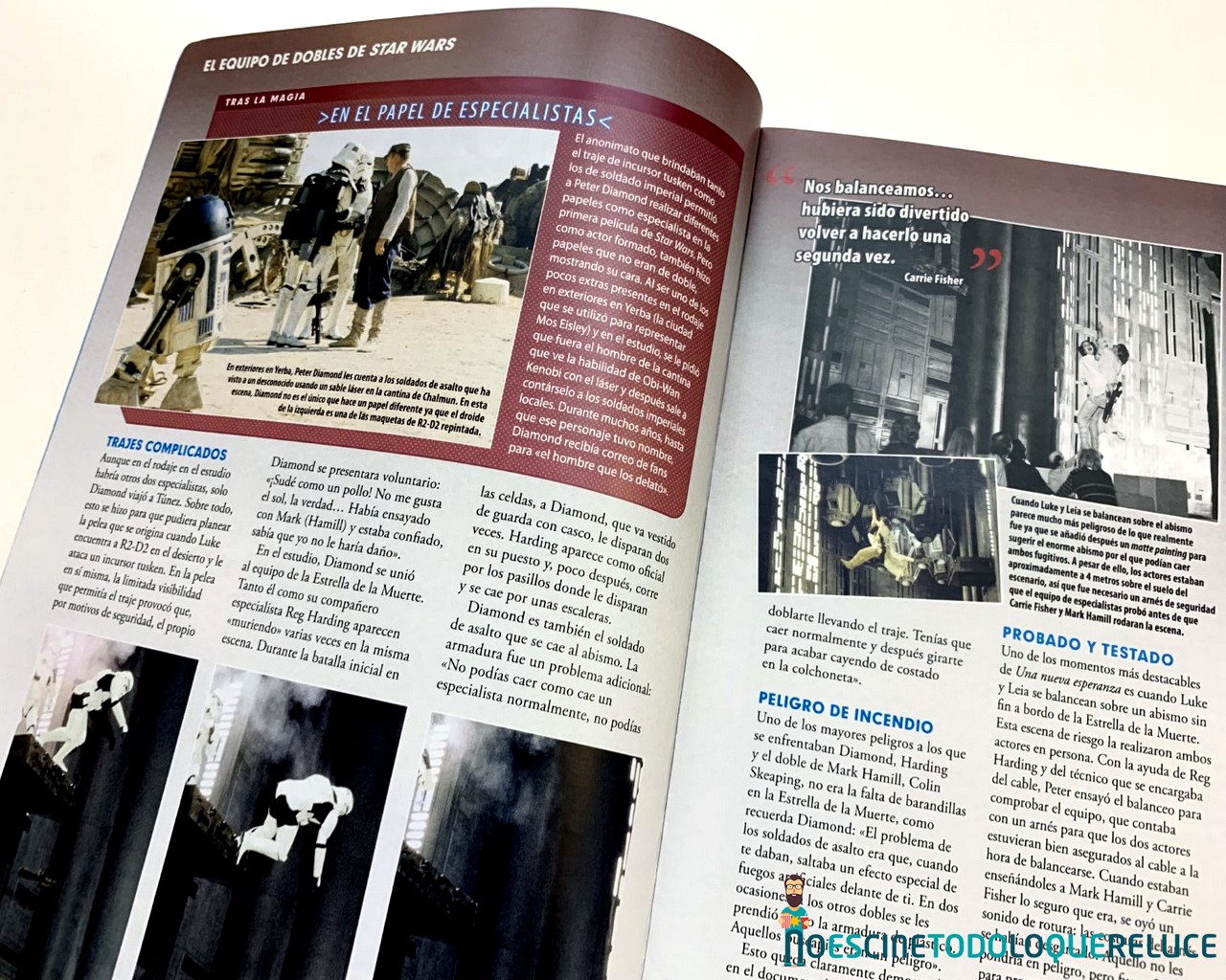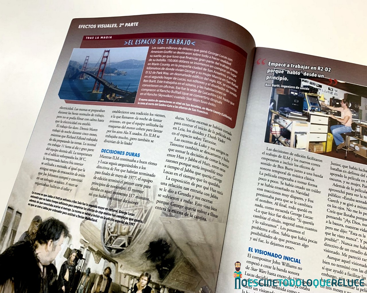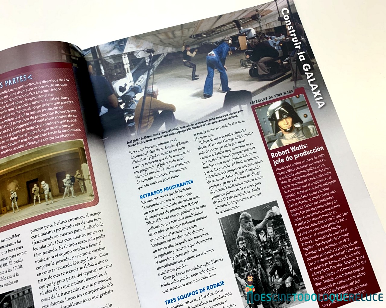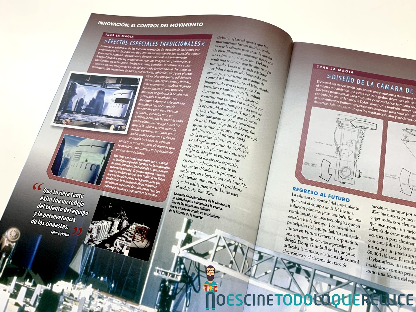 Esta fascinante sección nos permite mirar tras las cámaras para descubrir las técnicas empleadas en la construcción y grabación de los droides, naves, escenarios y criaturas de todas las películas de Star Wars. Explora su desarrollo desde sus primeros conceptos hasta las asombrosas maquetas finales, fotografiadas con todo lujo de detalles. - Guía de droides