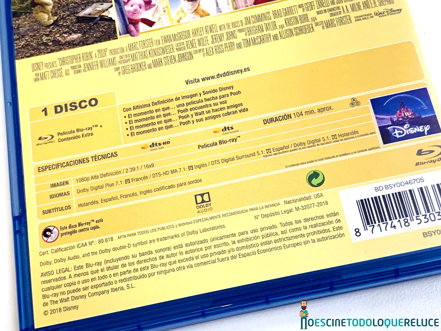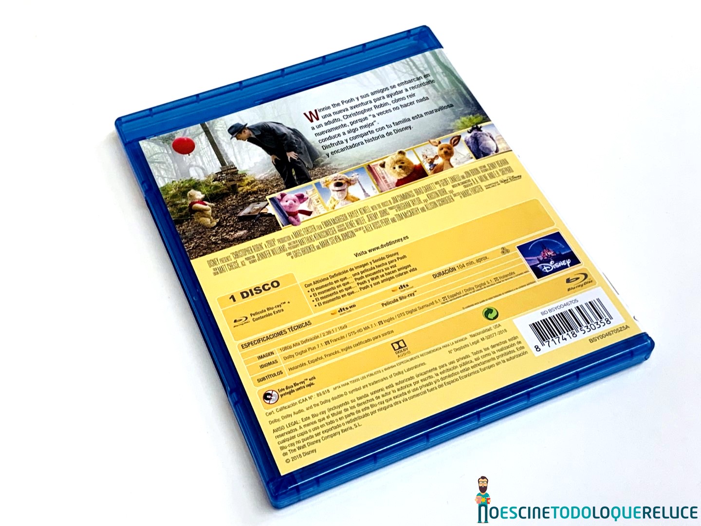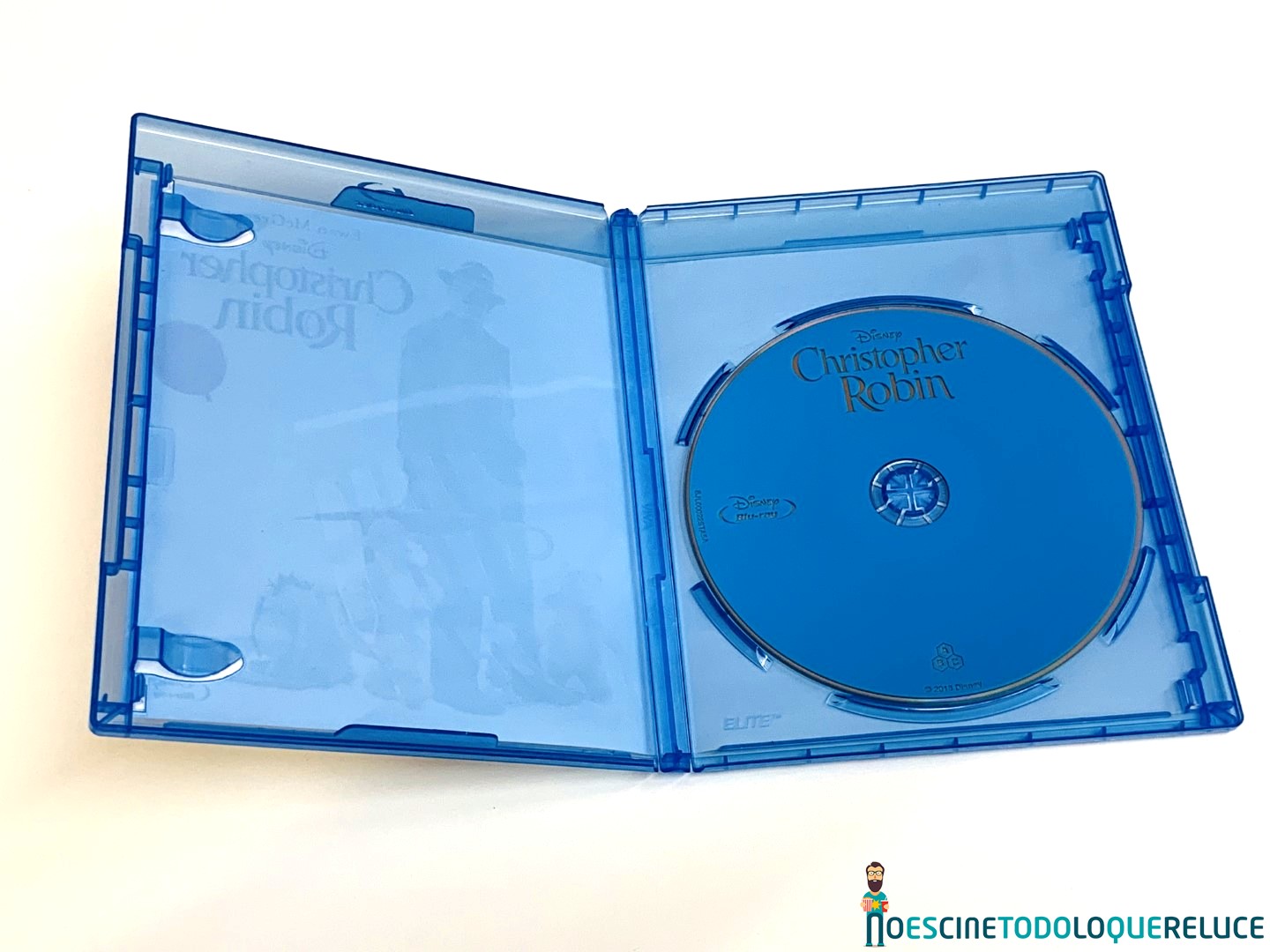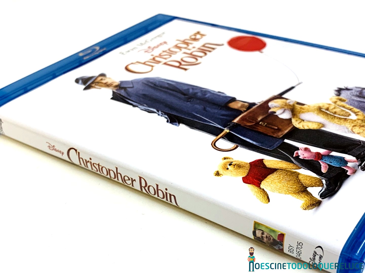 La edición Blu-ray de Christopher Robin está presentada en el clásico estuche azul de este formato con el póster de la película en la portada, mientras que la contraportada nos presenta una imagen de la película junto a fotos de cada uno de los personajes protagonistas acompañando a los datos técnicos, artísticos y sinopsis. En el interior nos encontramos el disco Blu-ray con el clásico tono azul en la serigrafía y el título de la película.