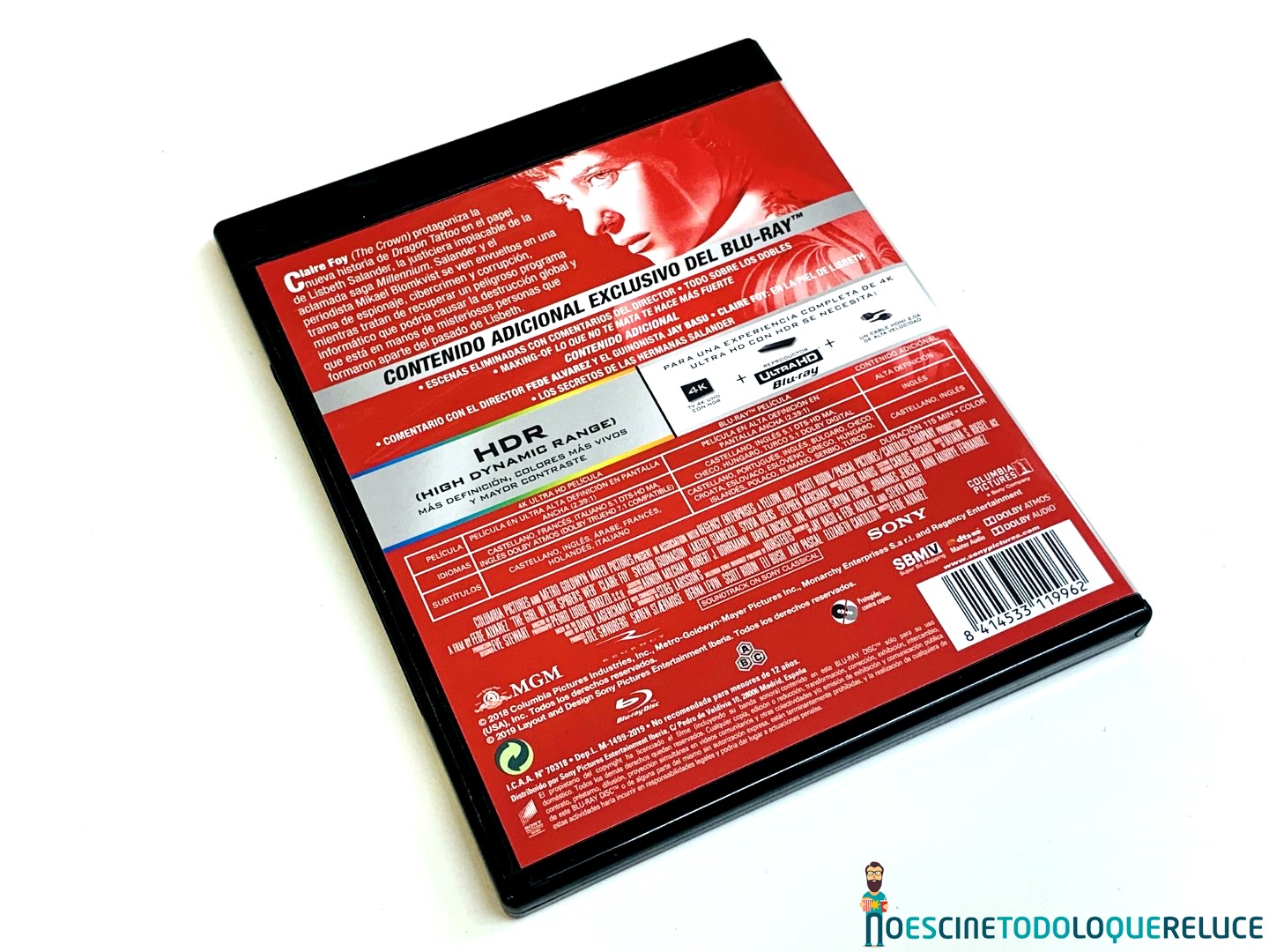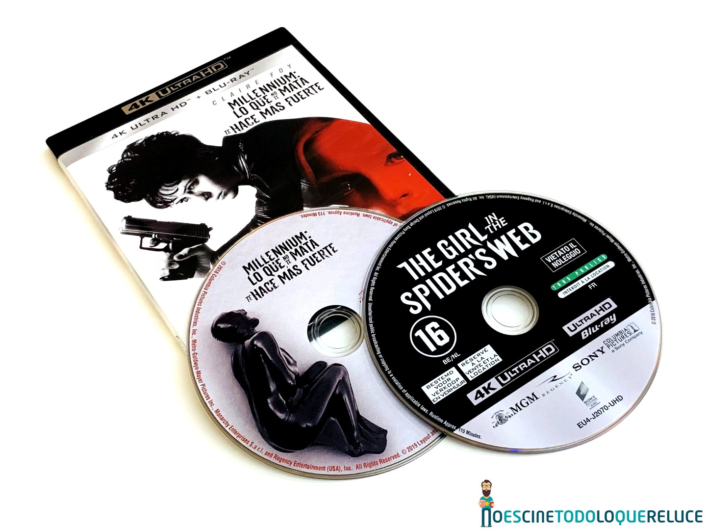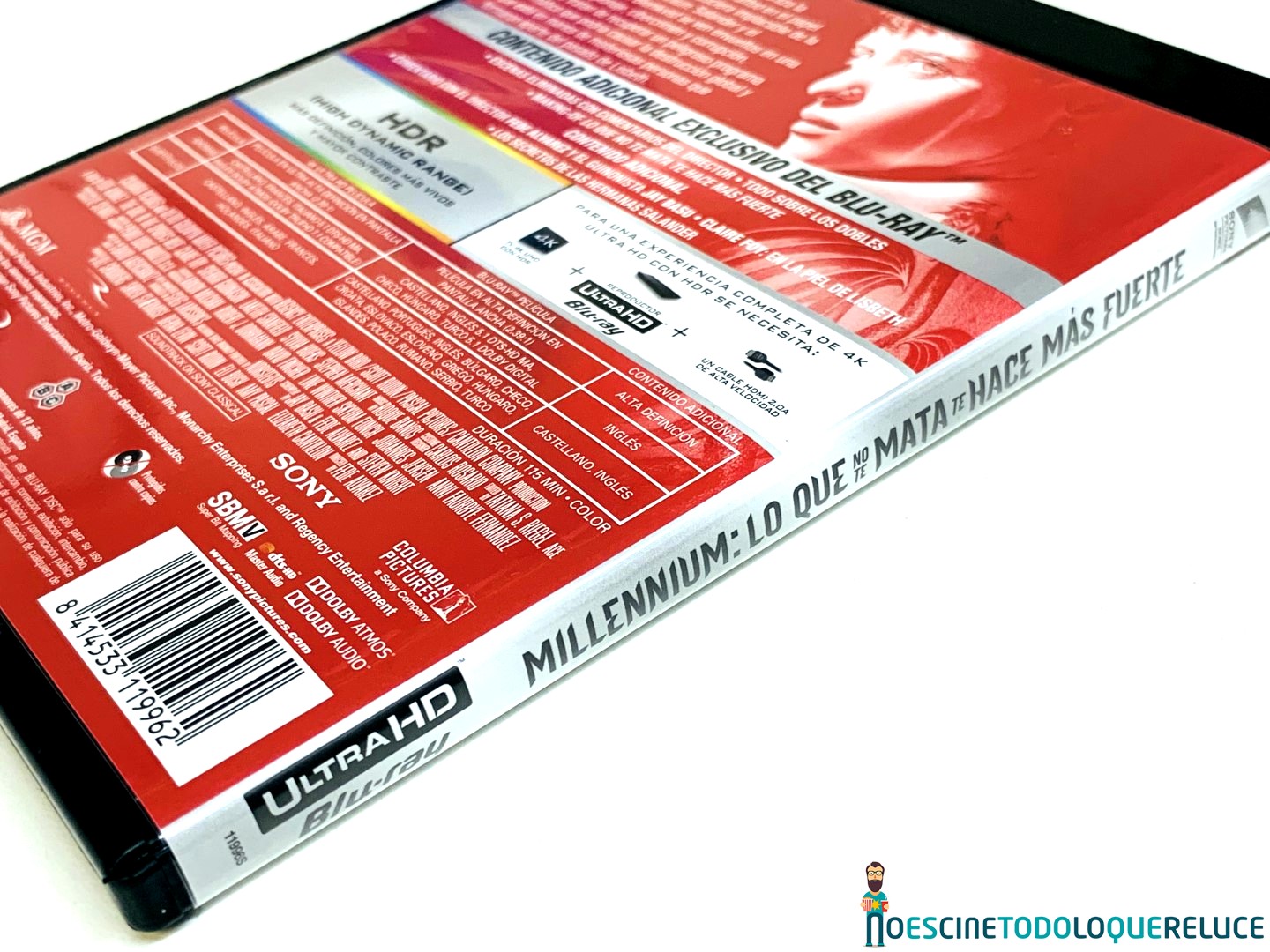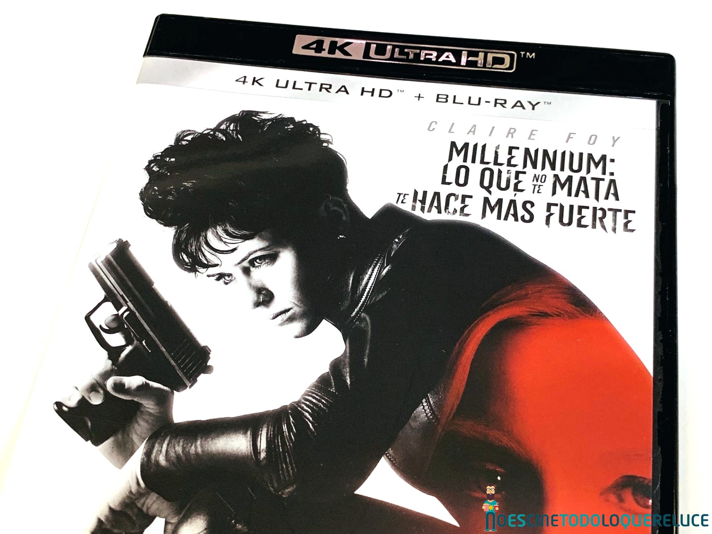 La edición 4K UHD de Millennium: Lo que no te mata te hace más fuerte está presentada en el clásico estuche negro de este formato con el póster de la película en la portada, mientras que la contraportada nos presenta una imagen de la protagonista junto a los datos técnicos, artísticos y sinopsis. En el interior nos encontramos tanto el disco 4K UHD como el disco Blu-ray, el primero de ellos con el título en versión original mientras que el segundo está serigrafiado con una imagen de la película junto al título en español.